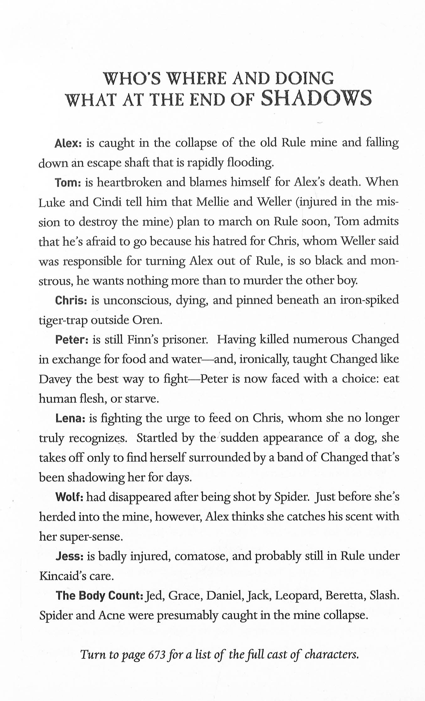 Alex is tough. She has survived the EMP blast, she has lived among the flesh-eating Changed, and she has been separated from Tom for months. And she hasn't given up. But on the brink of starvation and in the grip of a winter that just won't end, Alex discovers a new and terrible truth: The Changed are still evolving. And...they've had help.