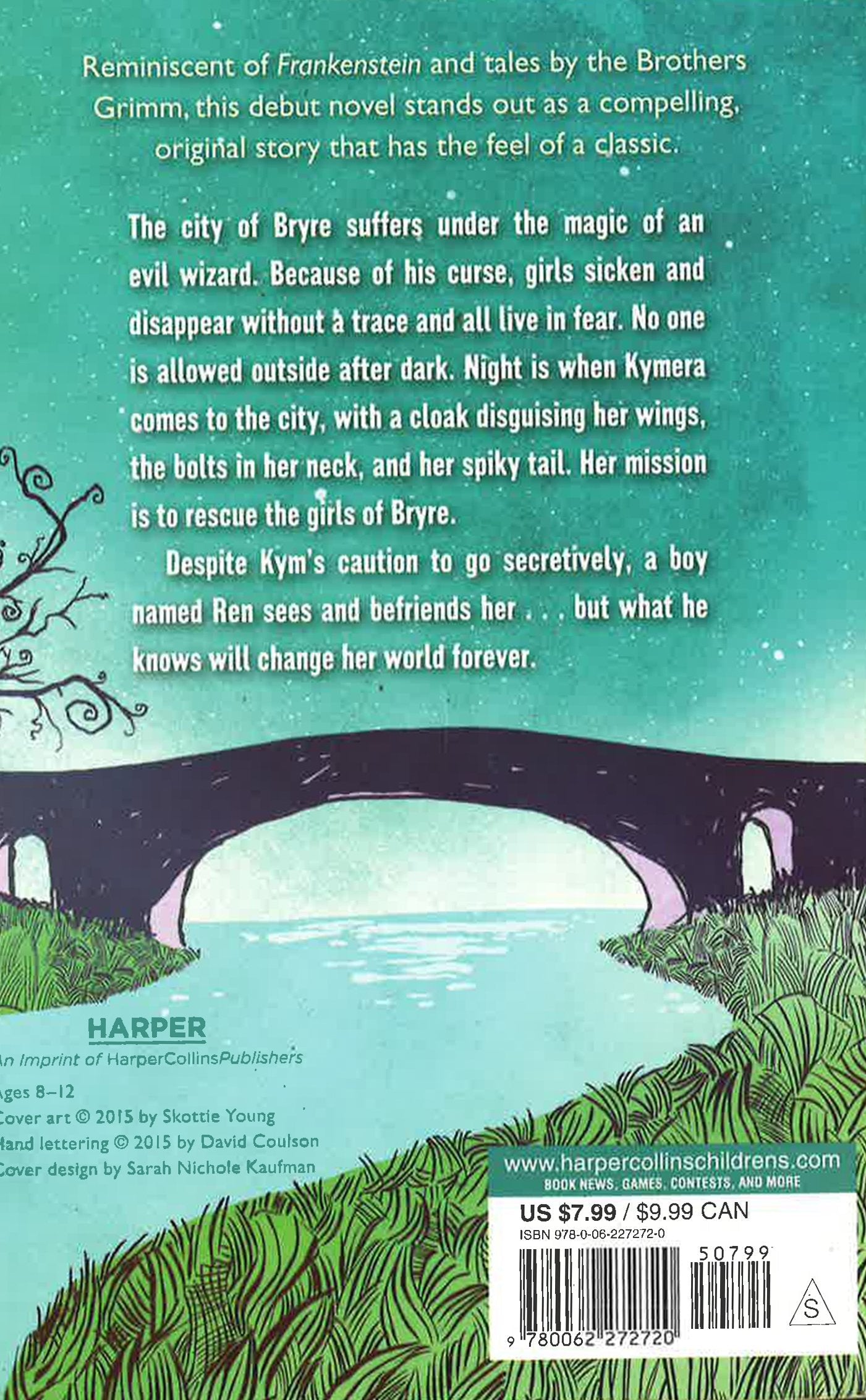 Reminiscent of Frankenstein and tales by the Brothers Grimm, this fantasy novel, hailed by award-winning author Anne Ursu as "a marvel of storytelling alchemy" stands out as a compelling, original story that has the feel of a classic. The city of Bryre suffers under the magic of an evil wizard. Because of his curse, girls sicken and disappear without a trace and all live in fear. No one is allowed outside after dark. Night is when Kymera comes to the city, with a cloak disguising her wings, the bolts in her neck, and her spiky tail. Her mission is to rescue the girls of Bryre. Despite Kym's caution to go secretively, a boy named Ren sees and befriends her...but what he knows will change her world forever. *this book may have remainder mark*