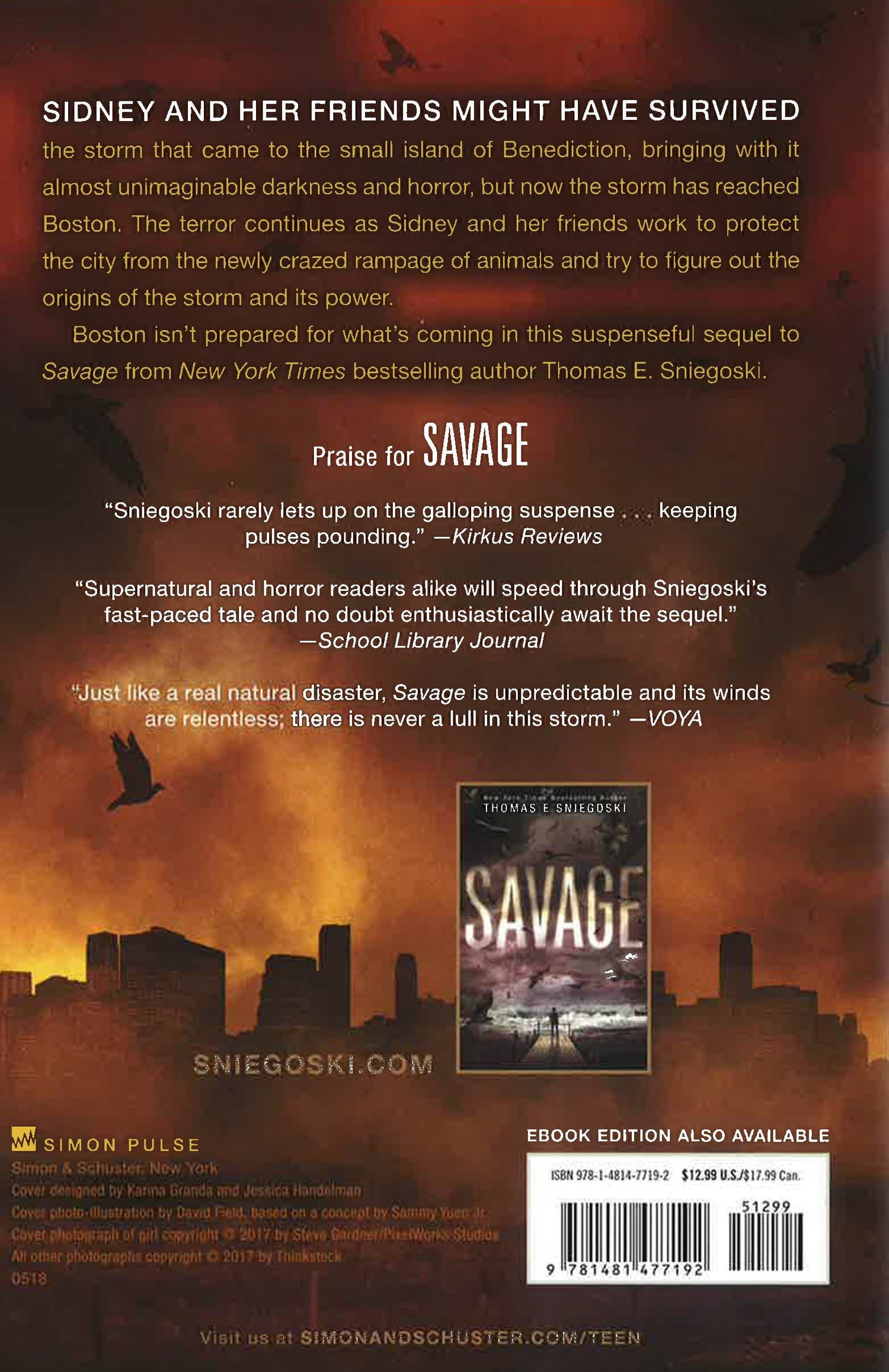 The city of Boston isn't prepared for the coming storm in this sequel to the "unpredictable" (VOYA) and "fast-paced" (School Library Journal) Savage from New York Times bestselling author Thomas E. Sniegoski. Sidney and her friends have survived the storm that came to the small island of Benediction, bringing with it almost unimaginable darkness and horror. But now the storm has reached Boston. The terror continues as Sidney and her friends work to protect the city from the newly crazed rampage of animals and try to figure out the origins of the storm and its power. Boston isn't prepared for what's coming in this suspenseful sequel to Savage from New York Times bestselling author Thomas E. Sniegoski.