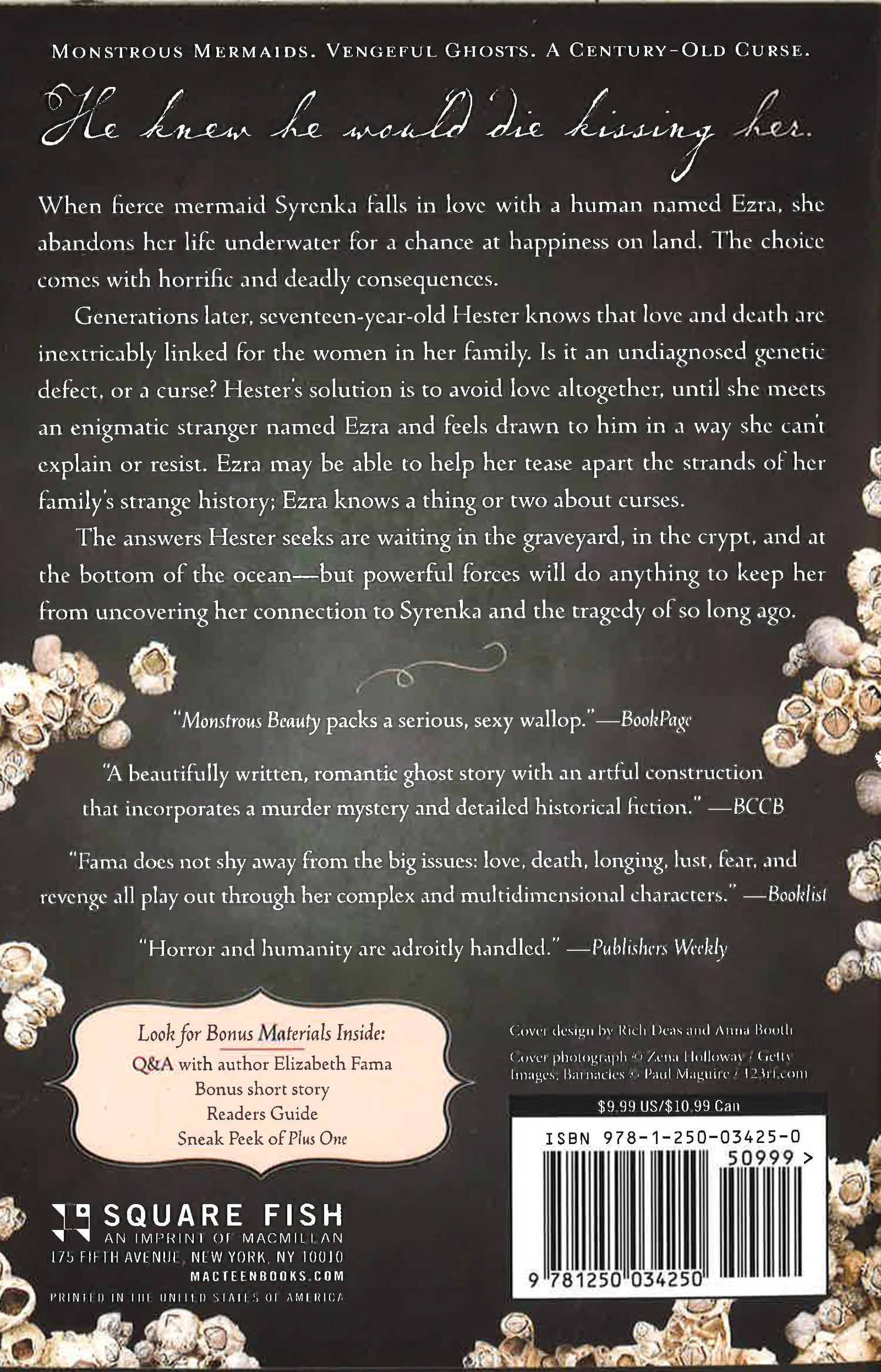 Fierce, seductive mermaid Syrenka falls in love with Ezra, a young naturalist. When she abandons her life underwater for a chance at happiness on land, she is unaware that this decision comes with horrific and deadly consequences. Almost 140 years later, seventeen-year-old Hester meets a mysterious stranger named Ezra and feels overwhelmingly, inexplicably drawn to him. For generations, love has resulted in death for the women in her family. Is it an undiagnosed genetic defect . . . or a curse? With Ezra's help, Hester investigates her family's strange, sad history. The answers she seeks are waiting in the graveyard, the crypt, and at the bottom of the ocean - but, in Elizabeth Fama's Monstrous Beauty, powerful forces will do anything to keep her from uncovering her connection to Syrenka and to the tragedy of so long ago.