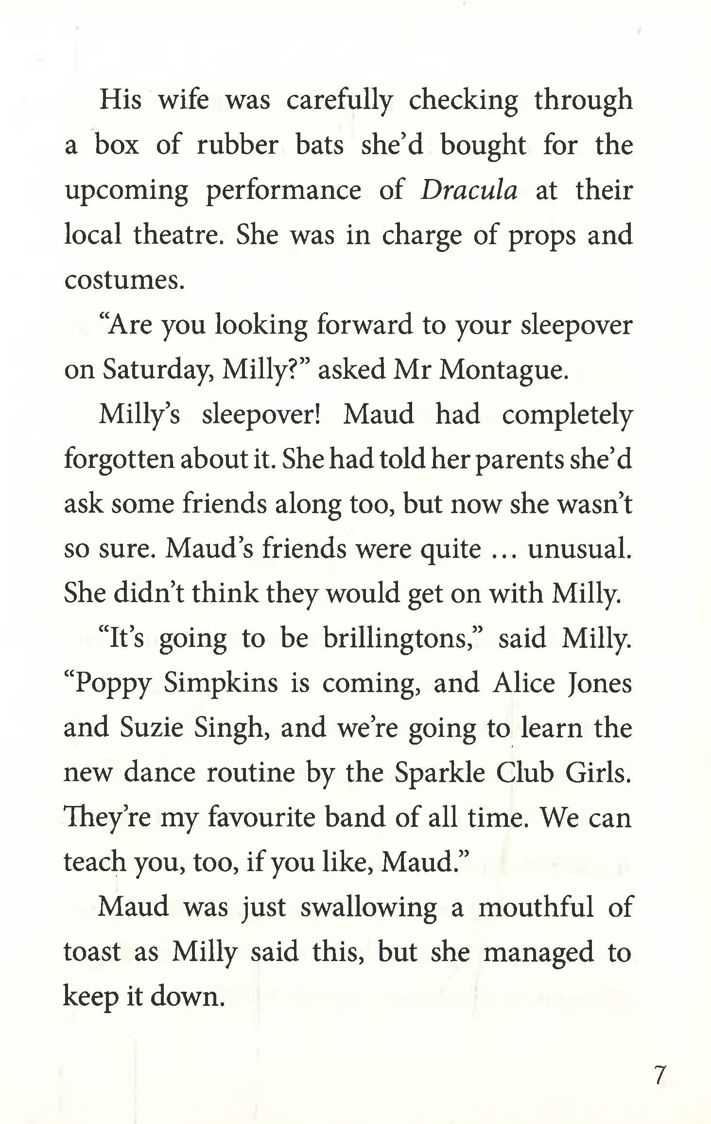 When Maud's perfect twin sister, Milly plans a sleepover, Mum forces Maud to have her friends over too. What can possibly go wrong? Nothing much ... just that Maud's mum might find out about Rotwood High being a school for real monsters! When Maud's perfect twin sister, Milly plans a sleepover, Mum forces Maud to have her friends over too. What can possibly go wrong? Nothing much ... just that Maud's mum might find out about Rotwood High being a school for real monsters! As if that's not enough to worry about, Maud is tricked into looking after Violet, the school hamster, by her arch enemy, Poisonous Penelope. But Violet is no ordinary hamster! She's a pedigree vampster and an expert cage-breaker. With a vampster on the loose, sleep is the very last thing that happens! Another terrifyingly terrific tale in the Monstrous Maud series, written by A.B. Saddlewick.