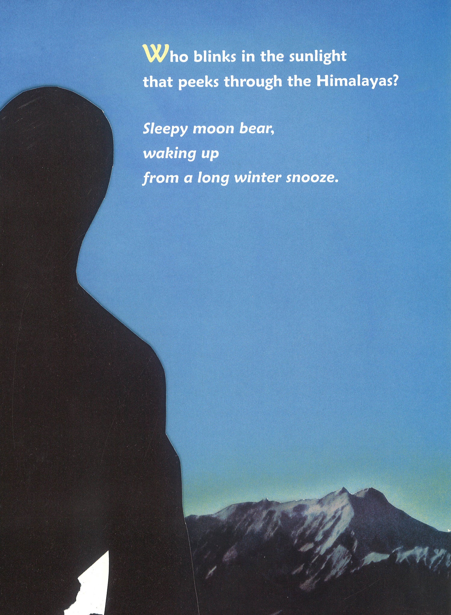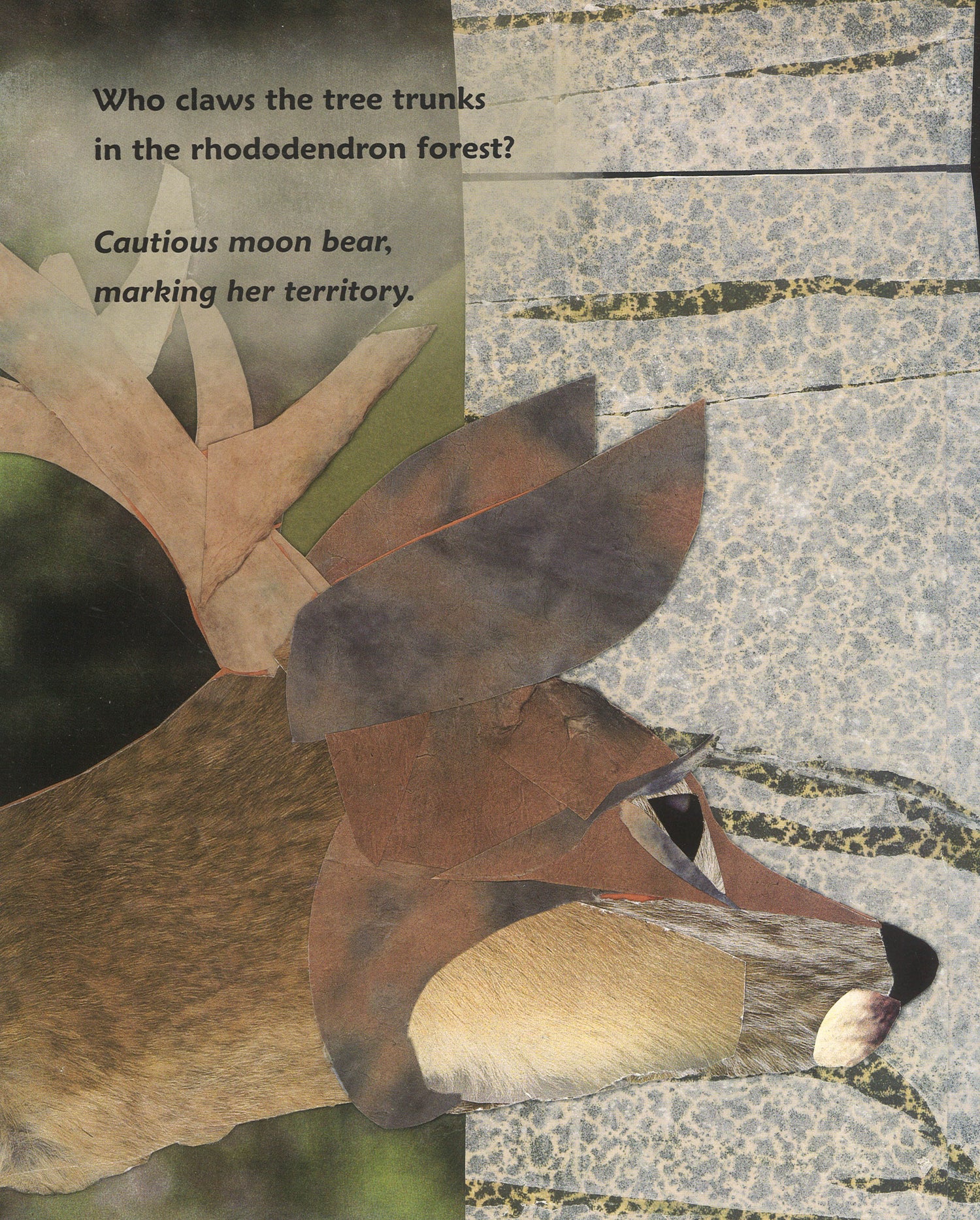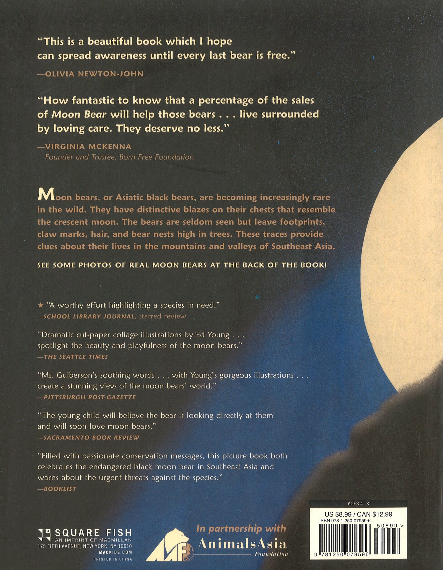 Moon bears, or Asiatic black bears, are named for the white moon shaped blaze on their chests. Moon bears are seldom seen but their footprints, claw marks, hair, and bear nests high in the trees give us clues about how they live. Sadly, there are now more moon bears in captivity than in the wild, as these animals are being "farmed" for their commercially valuable bile. Brenda Guiberson's lyrical text and Ed Young's stunning illustrations combine in a winning tribute to this endangered species. Follow one moon bear in the wild as she eats, plays, hibernates, and wakes up again in spring.