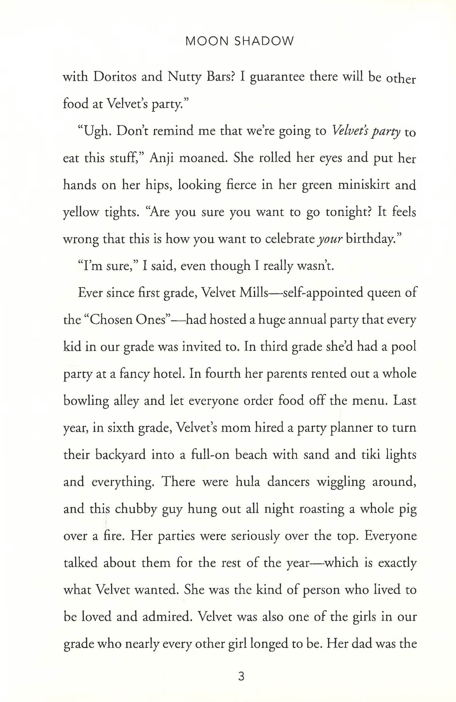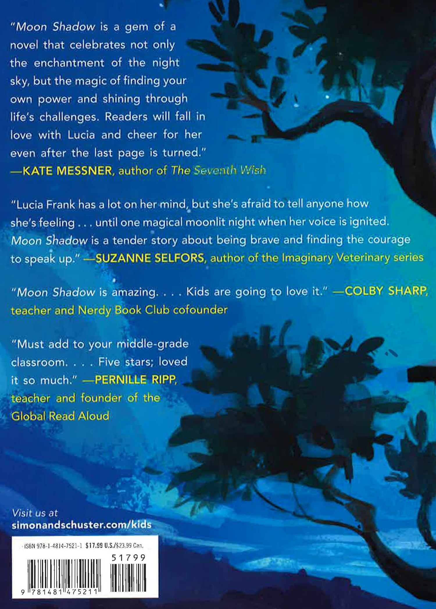 Lucia Frank has never had time for her mom’s “new age” nonsense. She doesn’t believe in any of that stuff. All she wants is to figure out how to get her best friend, Will, back and cope with her parents looming divorce. But then something strange happens on the night of her thirteenth birthday.When the eclipsed moon slips into the shadow of the earth, Lucia’s Shadow slips out. Now hidden in a moonstone, the Shadow waits for Lucia to sleep so it can come out to play.Lucia’s Shadow seems unlike her in almost every way: daring, outspoken, and unwilling to let anyone push her around. But it actually isn’t the anti-Lucia . . . in fact, her Shadow is very much like the person Lucia wishes she could be. At first, Lucia is eager to undo whatever magic happened on her birthday so life can get back to normal. But when she realizes her Shadow is doing and saying things she has only dreamed about, she wonders if maybe things aren’t all bad.With a little help from her Shadow, she’s turning into the kind of girl she’s always wanted to be.