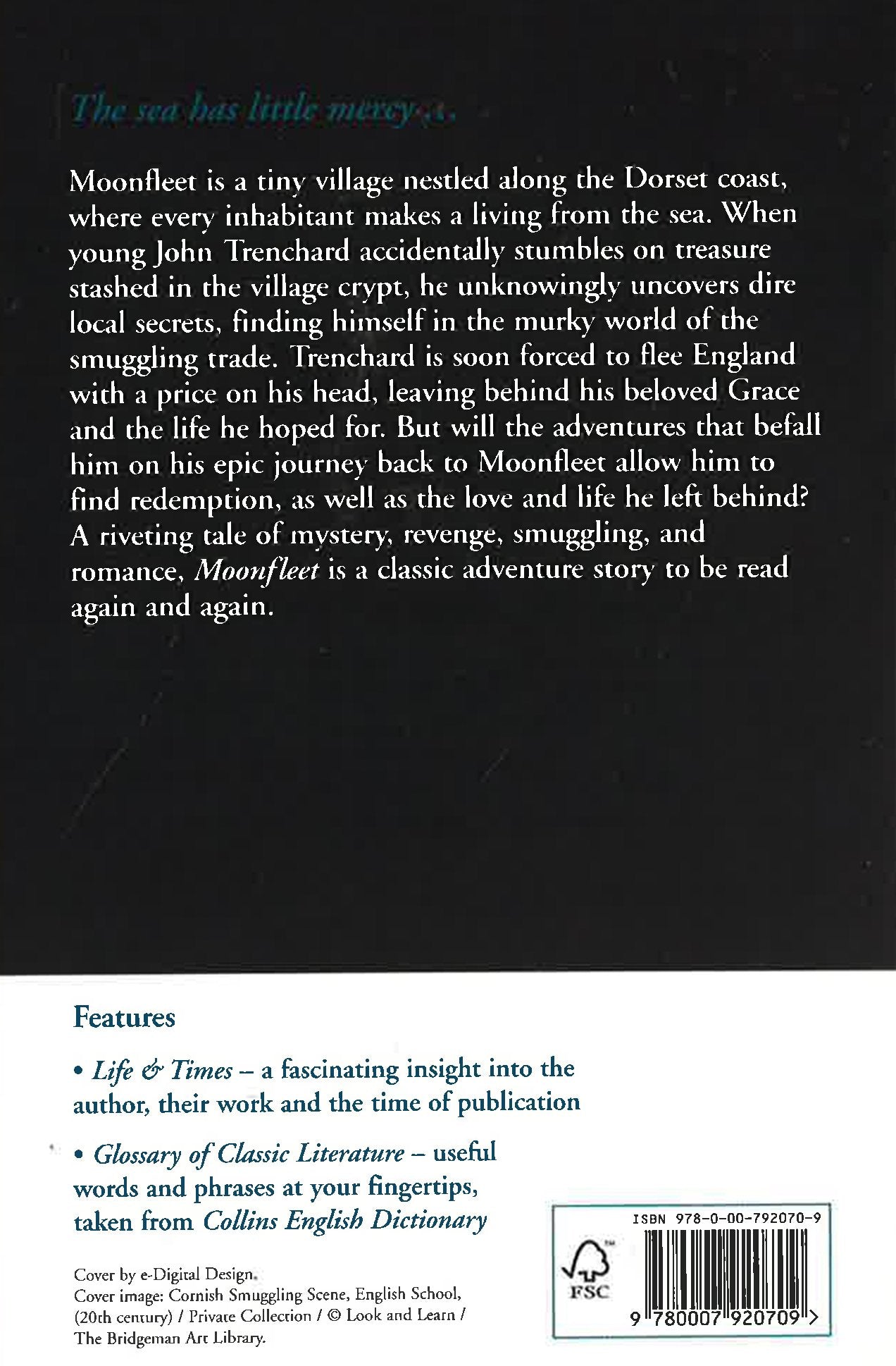 HarperCollins is proud to present its incredible range of best-loved, essential classics. First published in 1898, `Moonfleet' is a riveting adventure story full of drama, mystery, revenge, pursuit, smuggling, pirates and romance, with a place in the literary canon alongside `Treasure Island' and `Kidnapped'. The tiny village of Moonfleet nestles on the English coast, and every one of its inhabitants lives off the sea in one way or another. When local young man John Trenchard accidentally stumbles upon treasure stashed in the local crypt, he unknowingly enters the murky world of the smuggling trade and the local secret of Colonel John Mohune's treasure. Trenchard is soon forced to flee England with a price on his head, leaving behind his beloved Grace and the life he hoped for. But the adventures, trials and tribulations that befall him on his personal journey back to Moonfleet and ultimately redemption are written with such intensity and hope, as well as love for the history and landscape of Dorset, that the story never loses pace or power on its epic journey. `Moonfleet' is a classic adventure story to be read again and again.