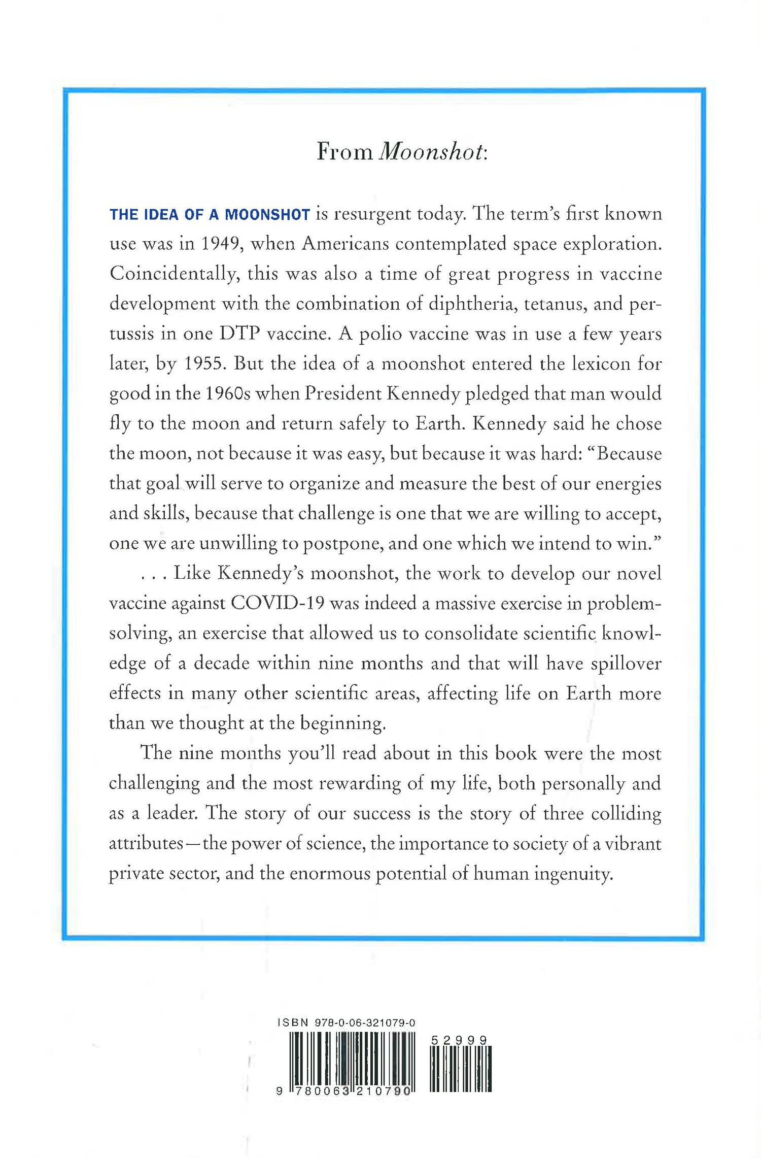 Moonshot is a story of leadership under the most unprecedented circumstances--how Dr. Bourla, a Greek immigrant, a child of Holocaust survivors, and a veterinarian, became the head of one of the world's largest corporations and initiated a dramatic transformation of the organization just before a global health crisis would serve to test the organization, its scientists, and its leader, like never before. Moonshot describes best practices that can be used to address the multiple, unprecedented challenges our world faces, reveals Pfizer's implementation of scientific breakthroughs at a record-breaking pace, and offers leadership lessons that can help anyone successfully manage their own seemingly unsolvable problems. As Dr. Bourla explains, "I am sharing the story of our moonshot--the challenges we faced, the lessons we learned, and the core values that allowed us to make it happen--in hopes that it might inspire and inform your own moonshot, whatever that may be."