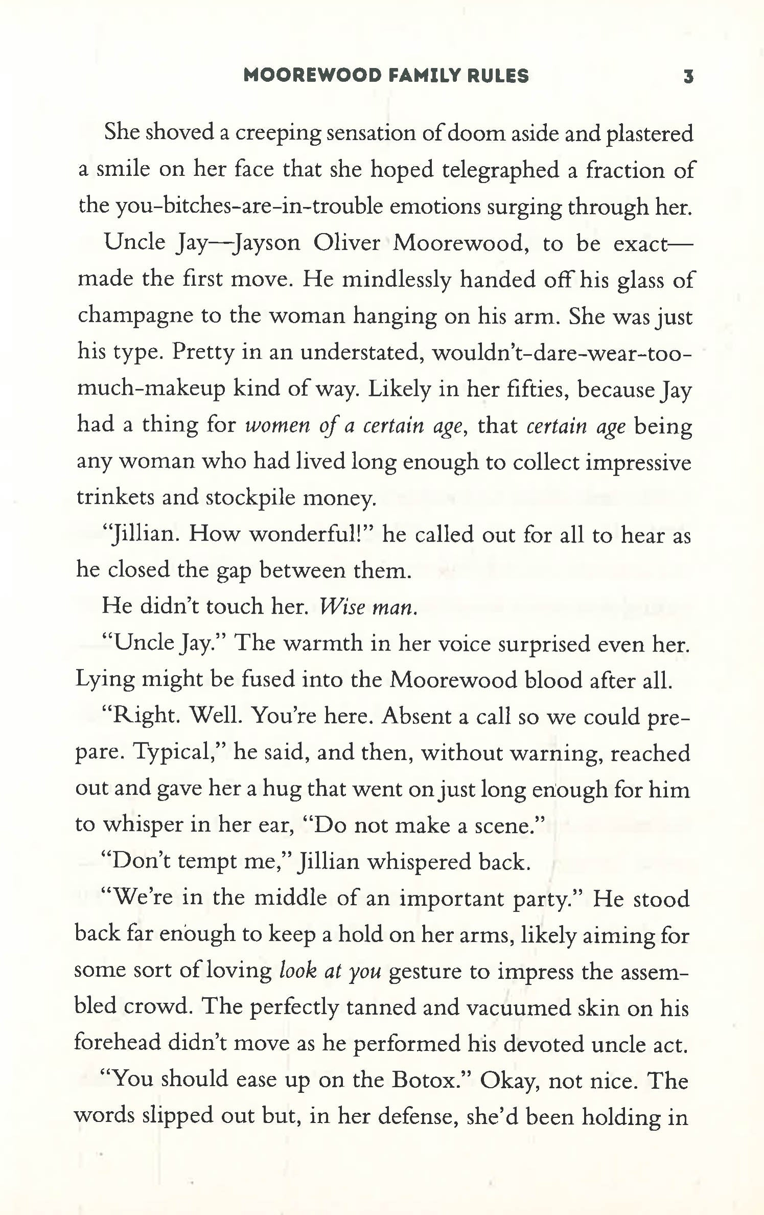 One day a con man met an heiress, wooed her, married her, had two kids…and kept on conning. Jillian Moorewood is the oldest child from that meet-cute-gone-wrong marriage. The stable one. The sensible and dependable one. The one who protects and fixes. The one who went to prison to save their sorry butts. Now, thirty-nine months later, she’s out and she’s more than a little pissed.