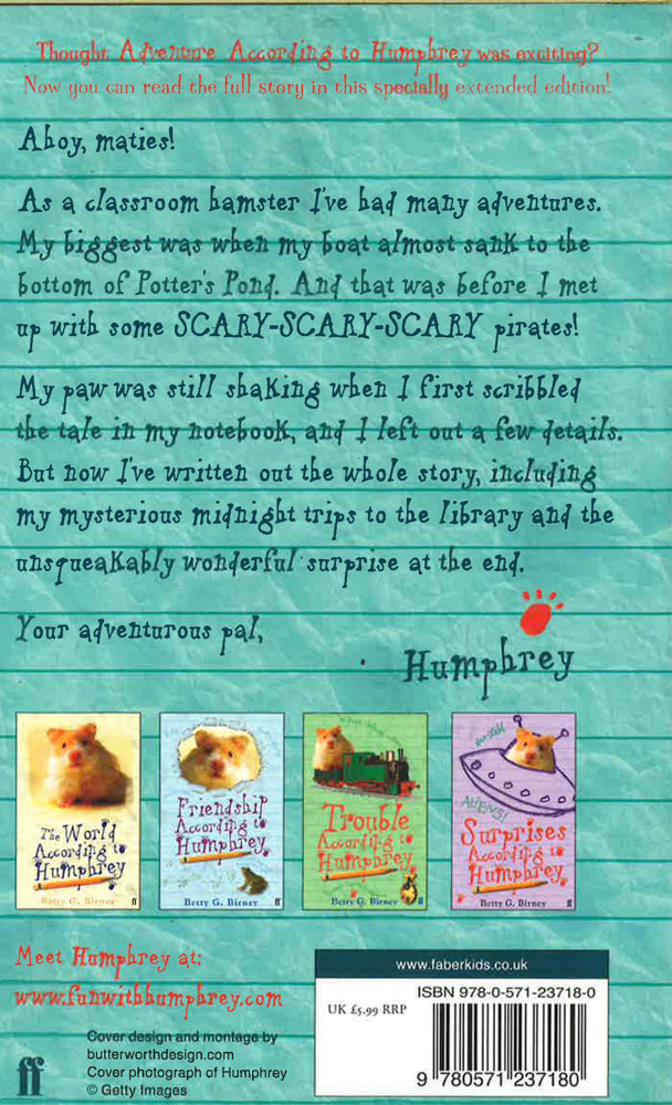Ahoy, maties! As a classroom hamster I've had many adventures. My biggest was when my boat almost sank to the bottom of Potter's Pond. And that was before I met up with some scary-scary-scary pirates! My paw was still shaking when I first scribbled the tale in my notebook, and I left out a few details. But now I've written out the whole story, including my mysterious midnight trips to the library and the unsqueakably wonderful surprise at the end. Your adventurous pal, Humphrey.