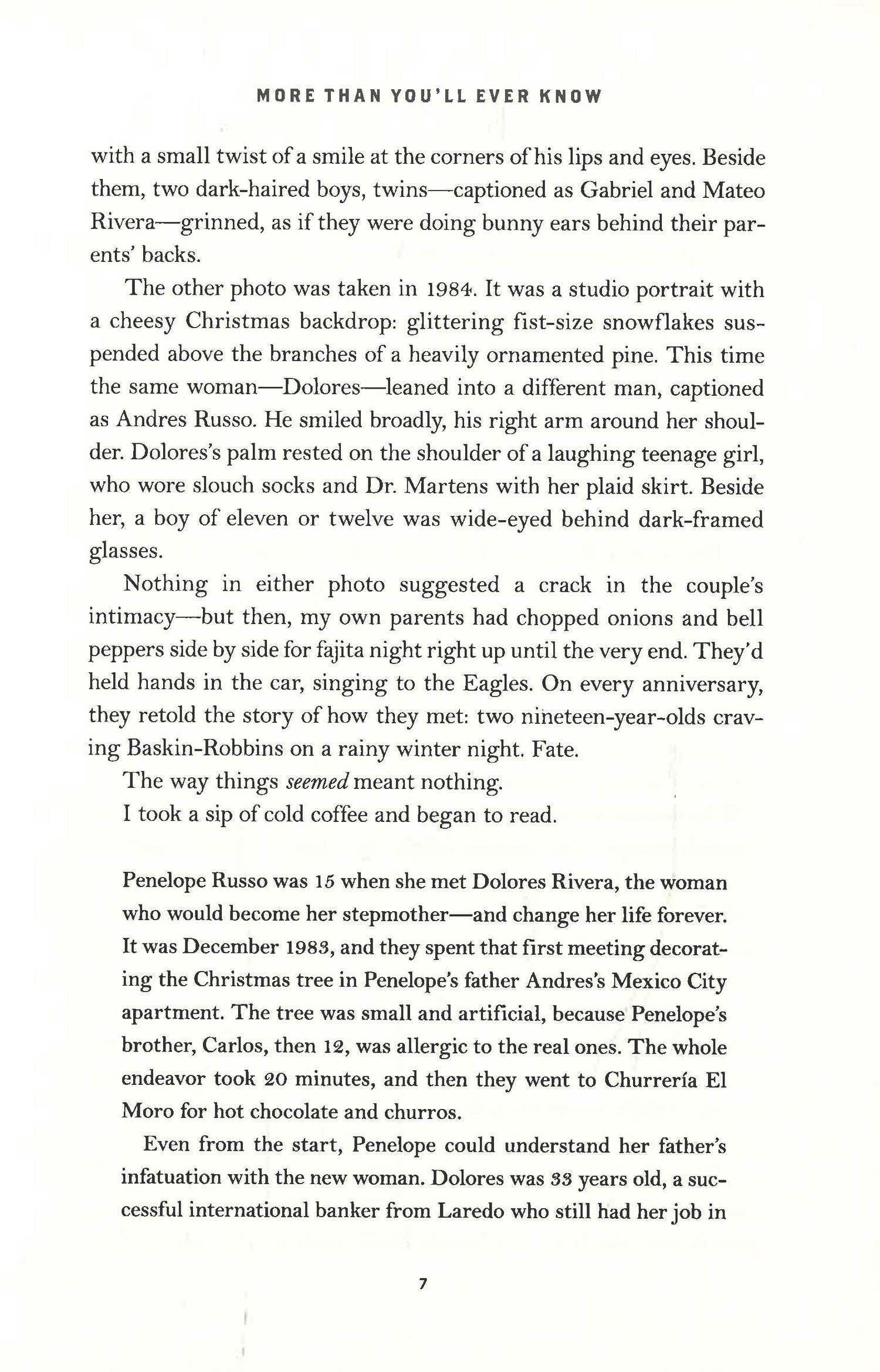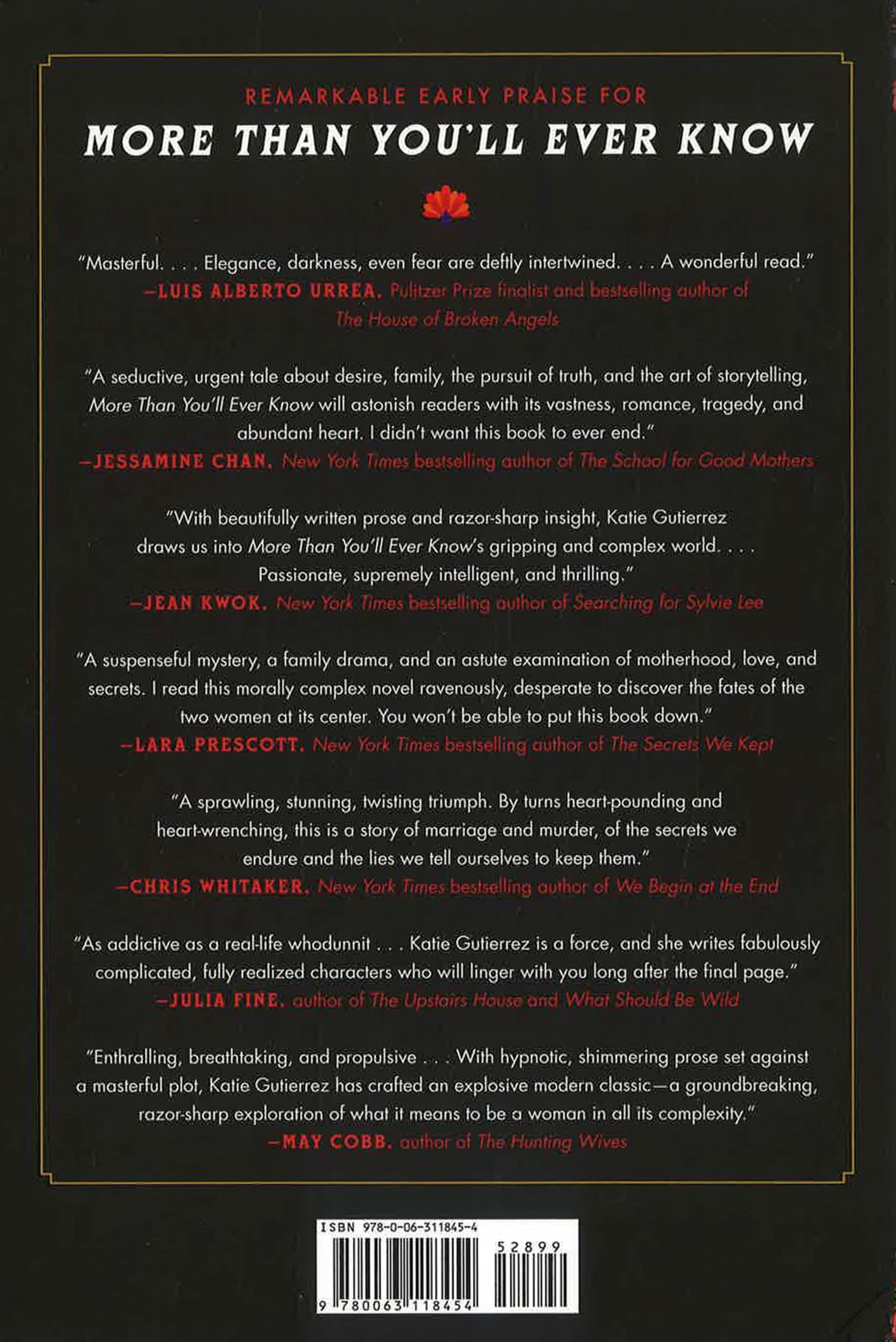"A seductive, urgent tale about desire, family, the pursuit of truth, and the art of storytelling, More Than You’ll Ever Know will astonish readers with its vastness, romance, tragedy, and abundant heart. I didn’t want this book to ever end." — JESSAMINE CHAN, New York Times bestselling author of The School for Good Mothers