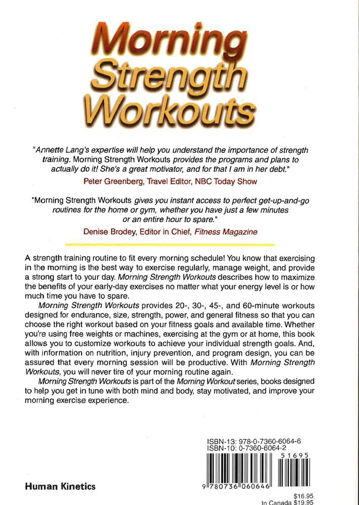 A strength training routine to fit every morning schedule! You know that exercising in the morning is the best way to exercise regularly, manage weight, and provide a strong start to your day. Morning Strength Workouts describes how to maximize the benefits of your early-day exercises no matter what your energy level is or how much time you have to spare. Morning Strength Workouts provides 20-, 30-, 45-, and 60-minute workouts designed for endurance, size, strength, power, and general fitness so that you can choose the right workout based on your fitness goals and available time. Whether you're using free weights or machines, exercising at the gym or at home, this book allows you to customize workouts to achieve your individual strength goals. And, with information on nutrition, injury prevention, and program design, you can be assured that every morning session will be productive. With Morning Strength Workouts, you will never tire of your morning routine again. Morning Strength Workouts is part of the Morning Workout series, books designed to help you get in tune with both mind and body, stay motivated, and improve your morning exercise experience.