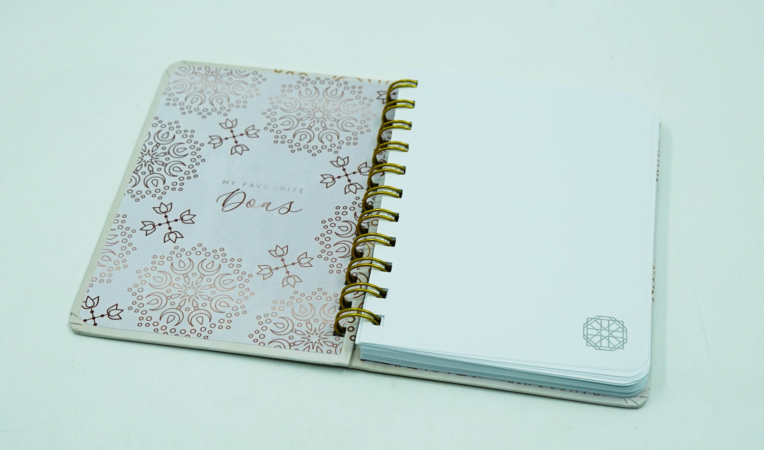 “Keep journals, and live twice.” Write your ideas, plans or diary in this wire-bound Dua Gifts Wire-O A5 Notebook. With hardcover binding, it protects your important notes wherever you go. How is it Special? The Dua Gifts Wire-O A5 Notebook comes with a contemporary design that blends right into your home, office, or personal desk. Let a sense of calm wash over you with the soothing pastel floral designs – a visual therapy for any time of the day. Each Dua Gifts Wire-O A5 Notebook “gifts” you with a powerful message that calls upon your inner peace, ease and gratitude. The message on your Dua Gifts Wire-O A5 Notebook is often short and sweet, yet beautiful to hold on to. How to Use? Flip it or reverse it - - let your Dua Gifts Wire-O A5 Notebook be a special place of passion, drive and creativity. Next? Take action and hustle on. :) Perfect as a gift for yourself or loved ones, it’s a functional tool to kick-start your goals. How to Care for It? We make our Dua Gifts Wire-O A5 Notebook with extra love and care. As it arrives in your hands, we hope you cherish it like we do. Use it often and keep it close – so that you’re always reminded of your goals! Also, we highly recommend to keep it somewhere safe…in case you’re writing any super secret stuff in there. Material: 80gsm simile paper, hard cover perfect bind, gold foil lettering cover, 192 lined pages.