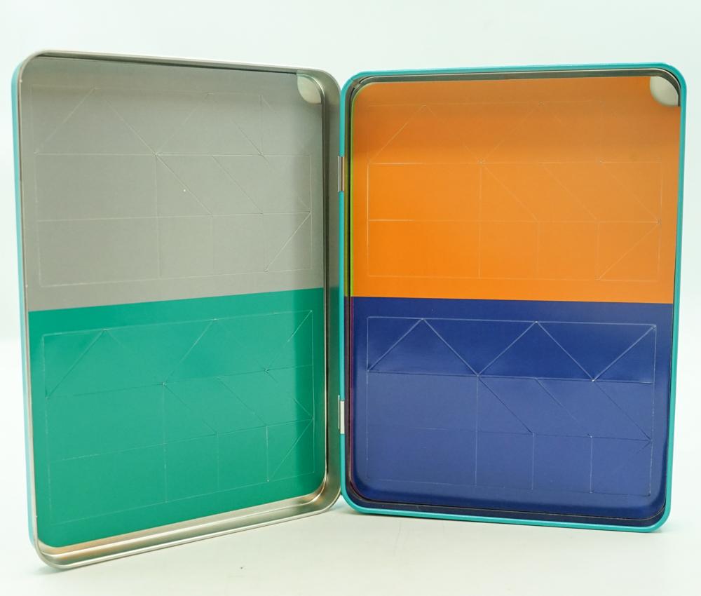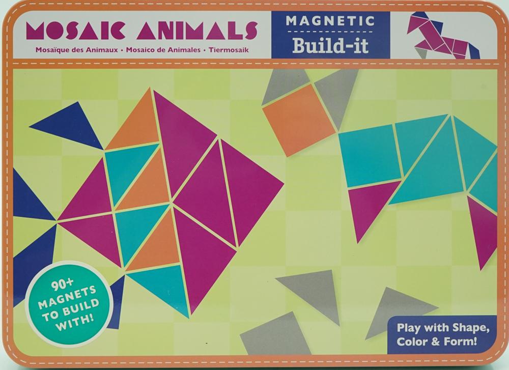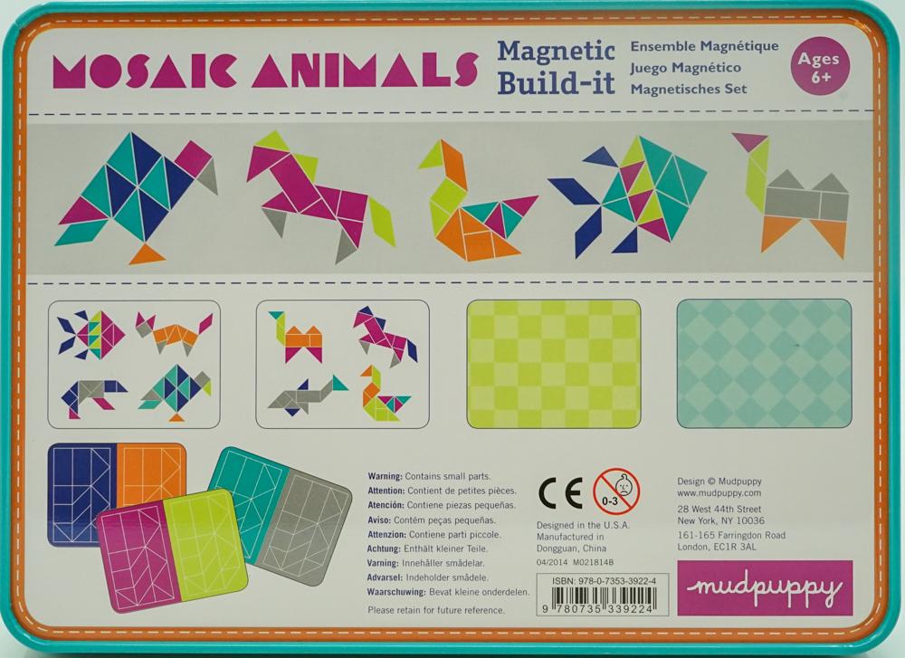 Mix and match magnetic shapes to create a mosaic menagerie! With these brightly-colored geometric shapes, you can build any creature you can imagine. This design is inspired by Chinese Tangram puzzles, which asked the puzzler to form shapes out of seven geometrical pieces, or "tans." Great for traveling, the magnets adhere to the sleek metal tin, so no lost parts. The set includes over 90 interchangeable magnetic pieces and 4 background scenes, and encourages freestyle fun with shape, color, and form. -3 sheets of interchangeable magnets -4 illustrated background scenes -Ages 6+ -Hinged tin: 8 3/4 x 6 3/8 x 1 in. (22 x 16 x 2 1/2 cm) -Magnets adhere to tin for portable fun