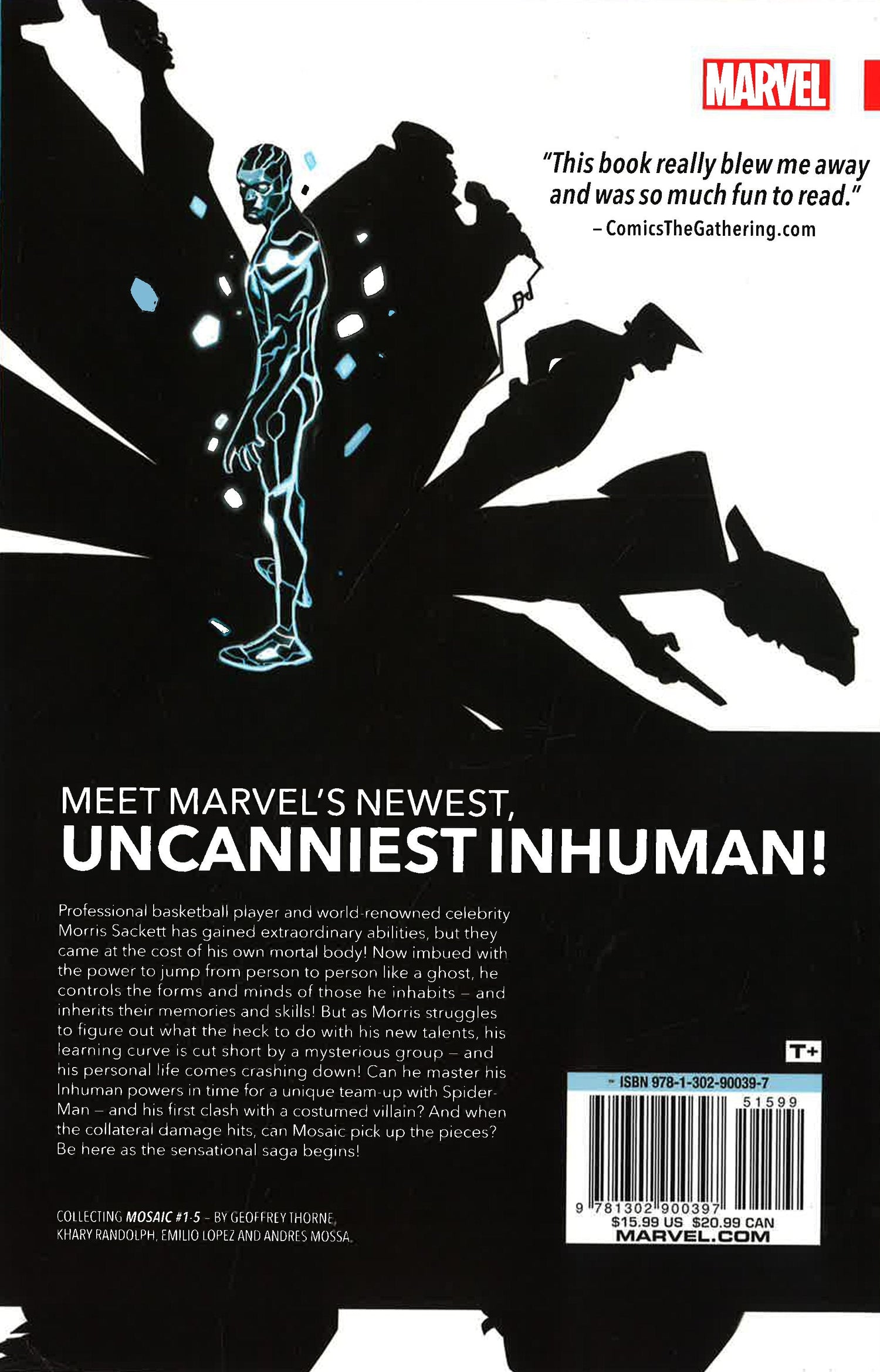 It's Marvel's newest hero, MOSAIC! Morris Sackett is a professional basketball player and celebrity loved by millions. But when he comes into contact with the transformative Terrigen Mists, Morris is imbued with the ability to jump from person-to-person like a ghost and can control the bodies and memories of those he inhabits. But these fantastic new abilities come at a grave cost... COLLECTING: MOSAIC 1-5
