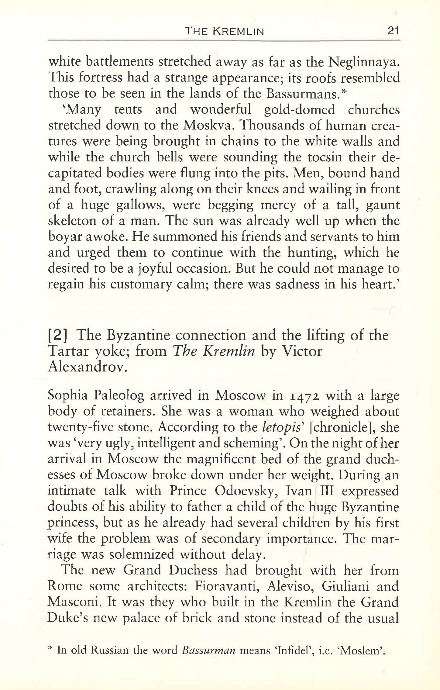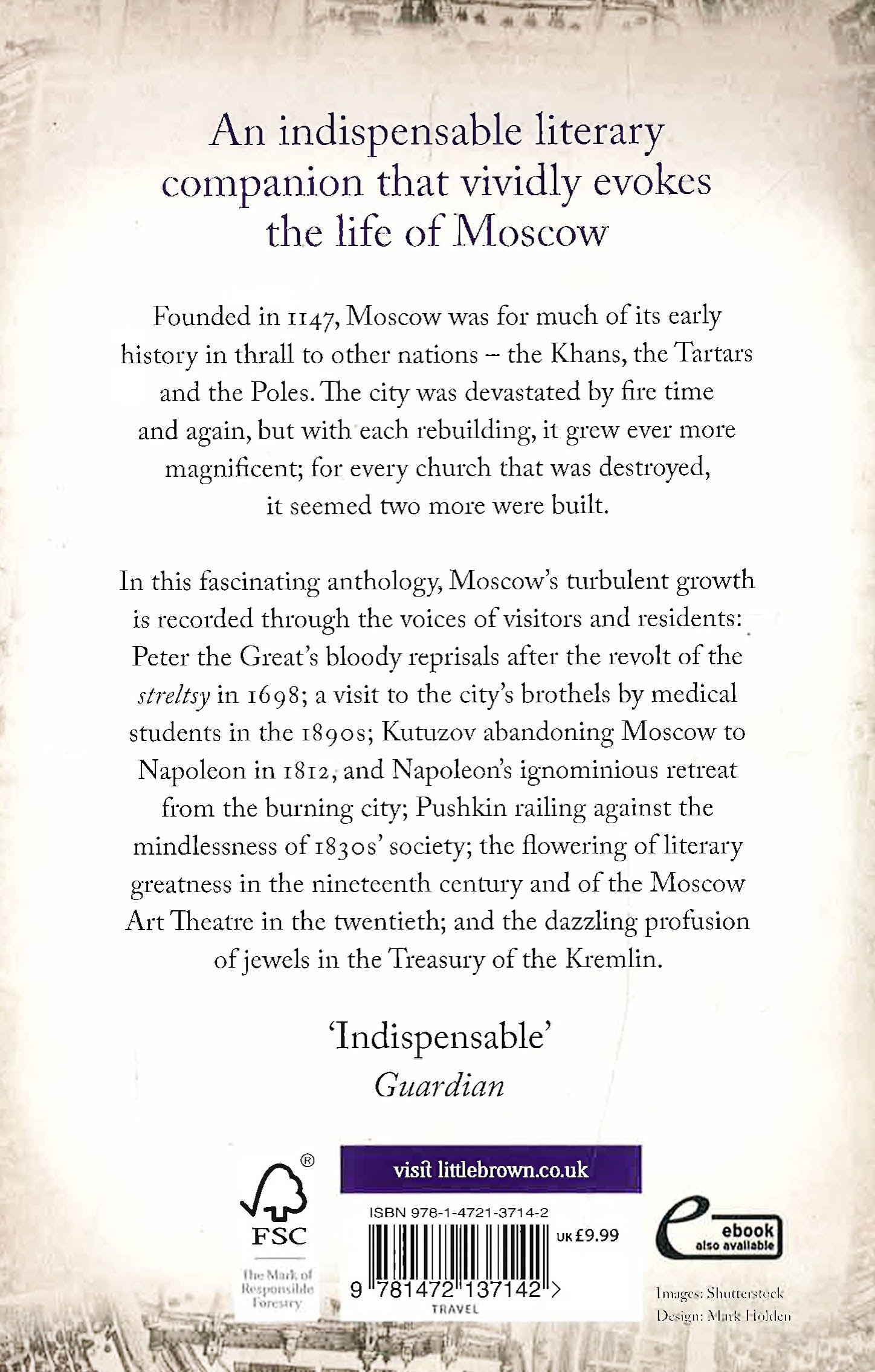 Founded in 1147, Moscow was for much of its early history in thrall to other nations - to the Khans, the Tartars and the Poles. The city was devastated by fire time and again, but with each rebuilding, it grew ever more magnificent. For every church that was destroyed, it seemed that two more were built. In this evocative and fascinating anthology, Moscow's turbulent growth is recorded through the voices of visitors and residents: Peter the Great's bloody reprisals after the revolt of the streltsy in 1698; a visit to the city's brothels by medical students in the 1890s; Kutuzov abandoning Moscow to Napoleon in 1812, and Napoleon's ignominious retreat from the burning city; Pushkin railing against the mindlessness of 1830 society; the flowering of literary greatness in the ninenteenth century and of the Moscow Art Theatre in the twentieth; and the dazzling profusion of jewels in the Treasury of the Kremlin. These and many other milestones in over seven hundred years of history are brought vividly to life.