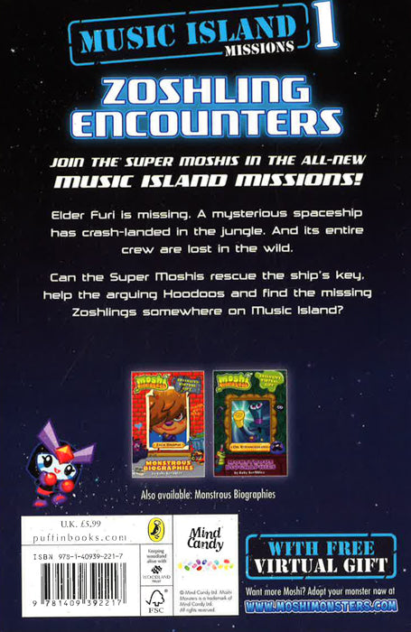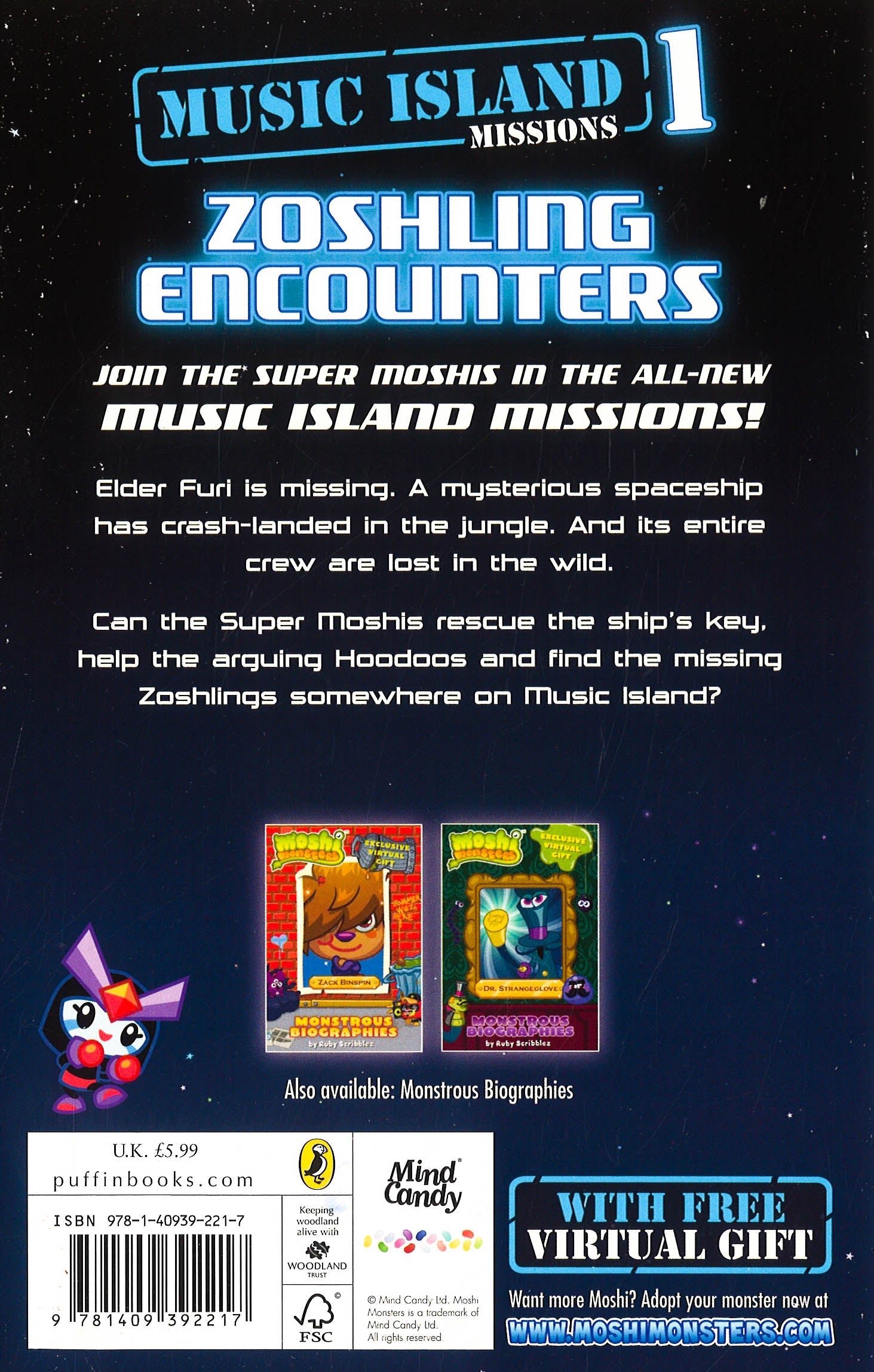 Join the Super Moshis in their first Music Island Mission - an all-new series from Moshi Monsters! Elder Furi is missing. A mysterious spaceship has crash-landed in the jungle. And its entire crew are lost in the wild. Can the Super Moshis rescue the ship's key, help the arguing Hoodoos and find the missing Zoshlings somewhere on Music Island? Find out in Zoshling Encounters...then look out for the rest of the Music Island Mission books! Enjoy more official Moshi Monsters books, including: I Heart Poppet, Poppet Mini-Sticker Book, The Moshling Collector's Guide, My Moshi Monsters Joke Book and many more - all available from Puffin. Want more Moshi? Adopt your Moshi Monster now at www.moshimonsters.com