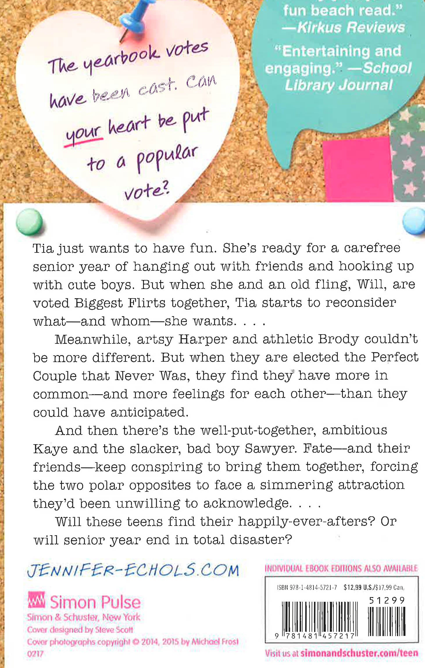 The yearbook votes have been cast and senior year is about to get interesting. Three irresistible stories from Jennifer Echols - now available together in one paperback edition!In Biggest Flirts, Tia just wants to have fun. She’s worked hard to earn her reputation as the life of the party, and she’s ready for a carefree senior year of hanging out with friends and hooking up with cute boys. But when she and an old fling are voted Biggest Flirts together, Tia starts to reconsider what - and whom - she wants . . . Meanwhile, in Perfect Couple, Harper is artsy and introverted. Brody is athletic and extroverted. Two people couldn’t be more different. But when they are elected the Perfect Couple that Never Was, they find they have more in common - and more feelings for each other - than they could have anticipated.And finally, Most Likely to Succeed follows two major opposites - put-together, ambitious Kaye and slacker, bad-boy Sawyer - as fate (and their friends!) conspire to bring them together. Perhaps their fellow classmates see the shimmering attraction that Kaye and Sawyer are unwilling to acknowledge themselves…