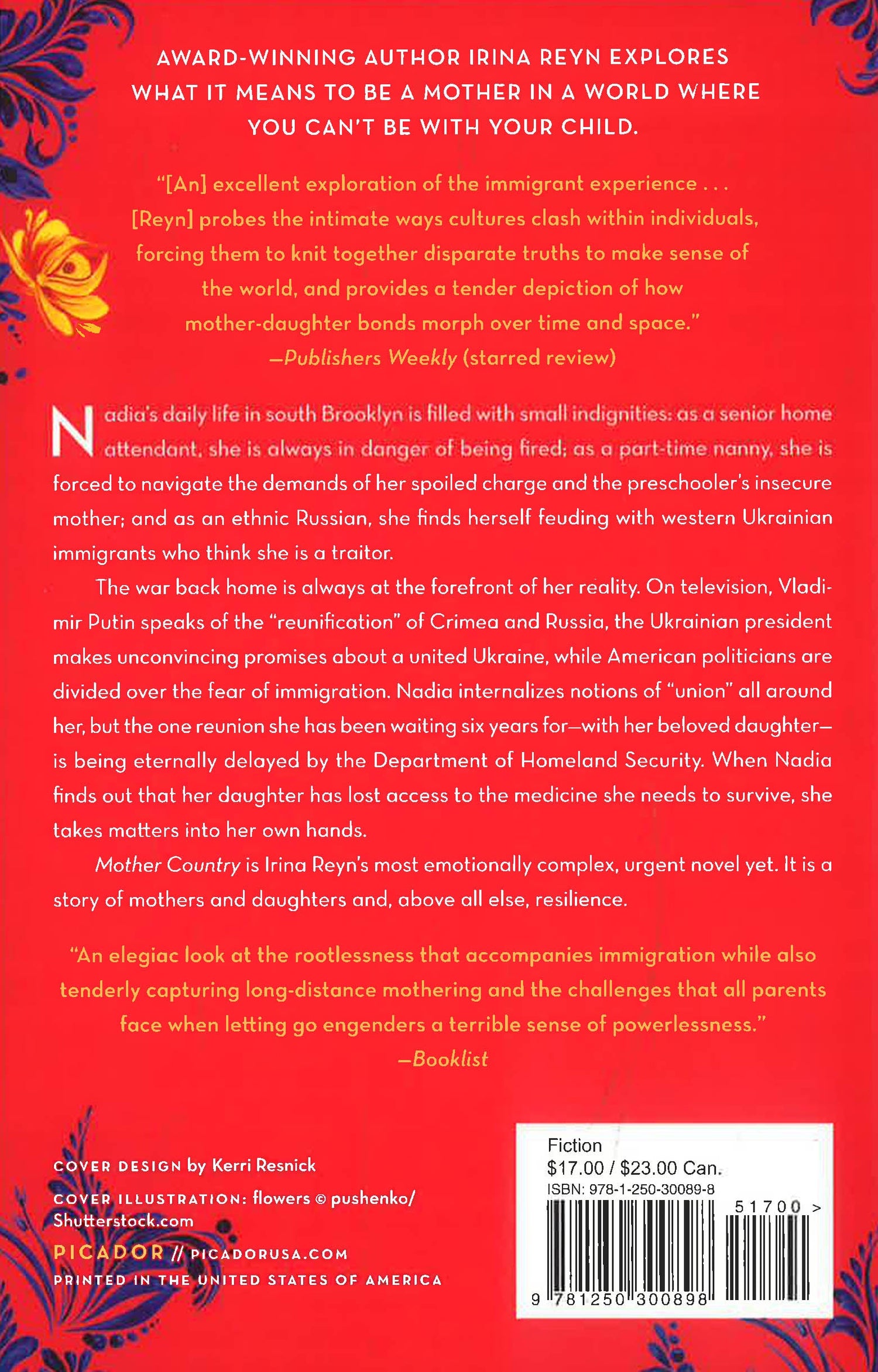 The war back home is always at the forefront of her reality. On television, Vladimir Putin speaks of the 'reunification' of Crimea and Russia, the Ukrainian president makes unconvincing promises about a united Ukraine, while American politicians are divided over the fear of immigration. Nadia internalises notions of 'union' all around her, but the one reunion she has been waiting six years for - with her beloved daughter - is being eternally delayed by the Department of Homeland Security. When Nadia finds out that her daughter has lost access to the medicine she needs to survive, she takes matters into her own hands. Mother Country is Irina Reyn's most emotionally complex, urgent novel yet. Hopeful and full of humour, it is a story of mothers and daughters and, above all else, resilience.