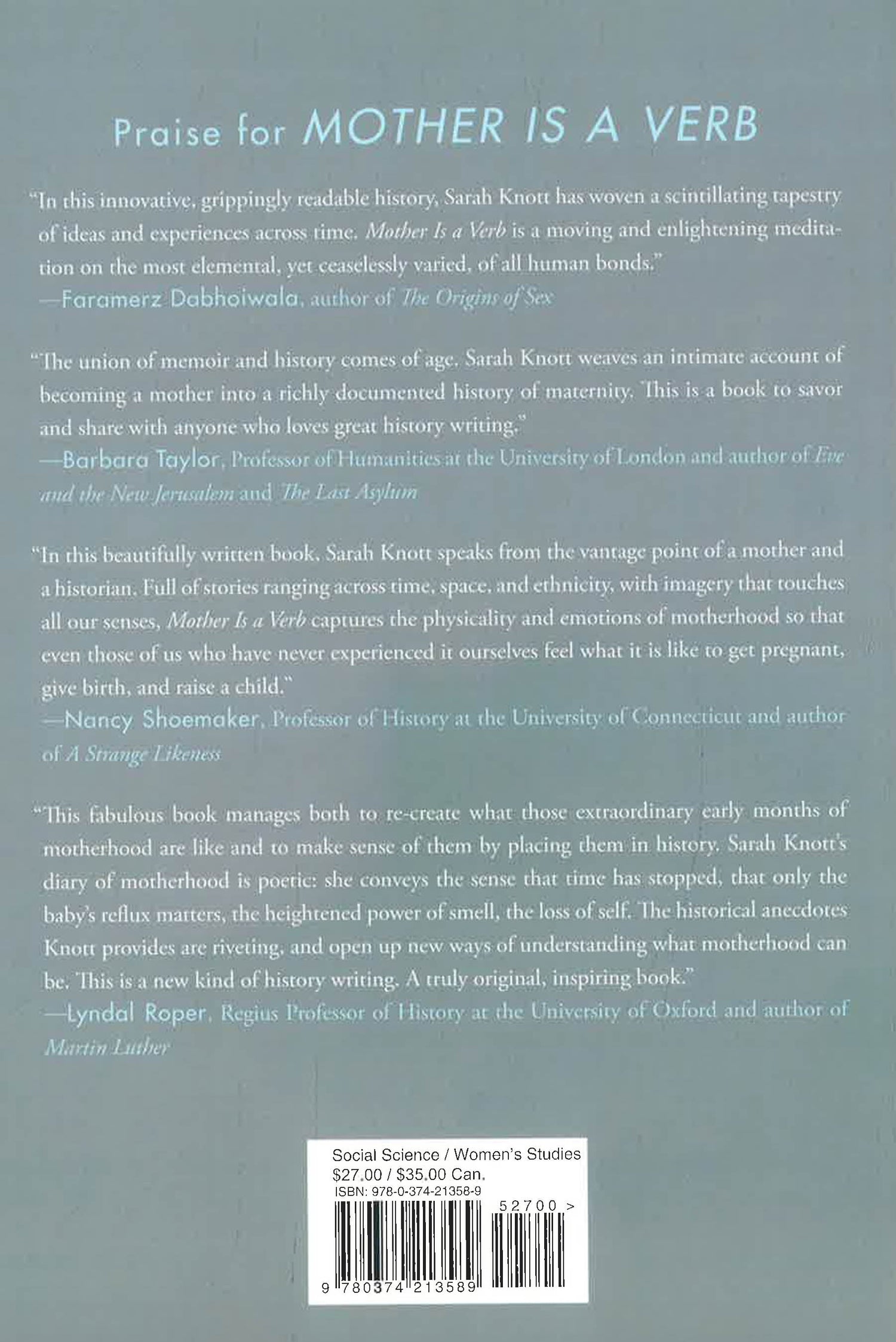 In Mother Is a Verb, the historian Sarah Knott creates a genre all her own in order to craft a new kind of historical interpretation. Blending memoir and history and building from anecdote, her book brings the past and the present viscerally alive. It is at once intimate and expansive, lyrical and precise.