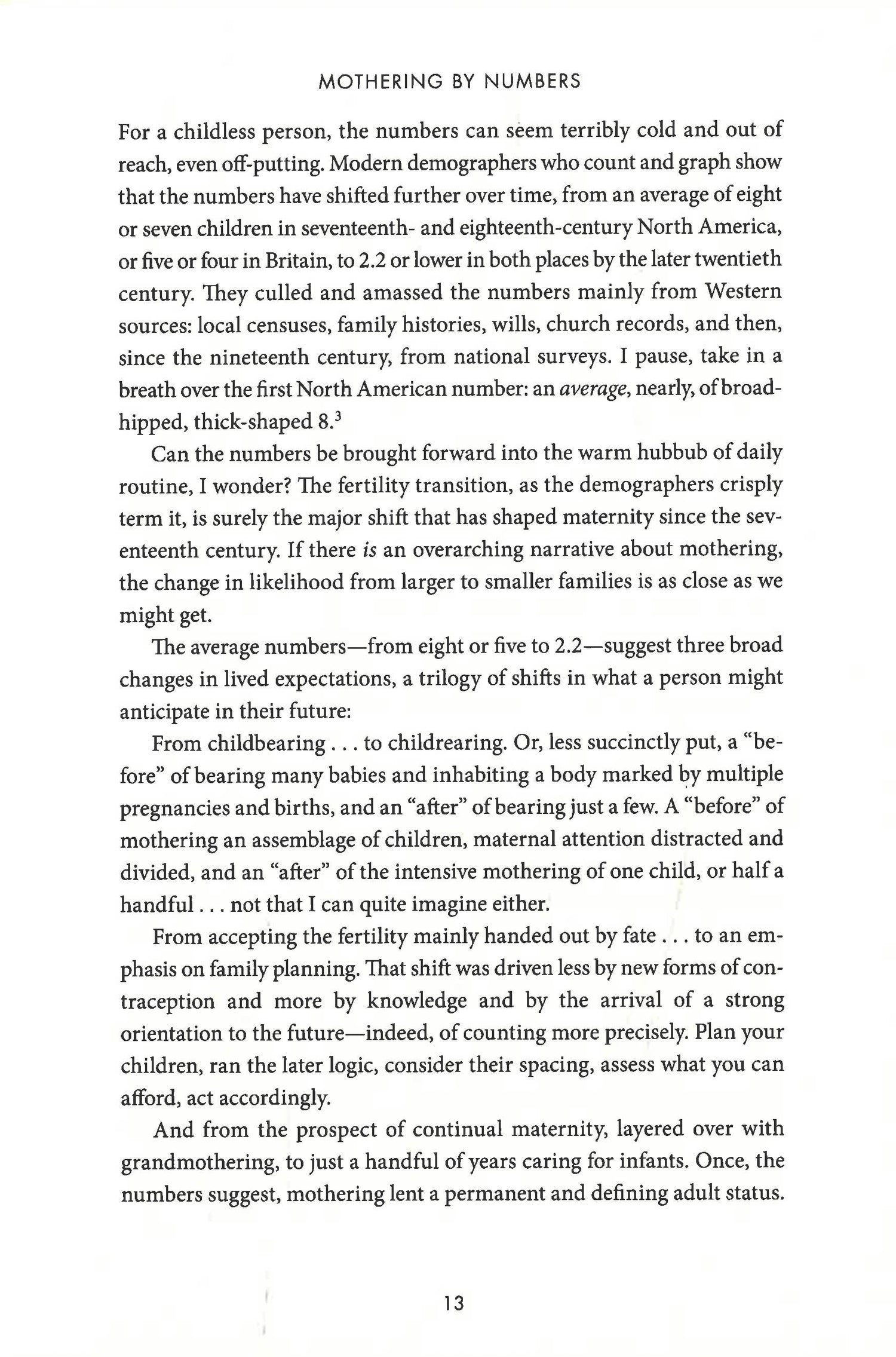 As a history, Mother Is a Verb draws on the terrain of Britain and North America from the seventeenth century to the close of the twentieth. Knott searches among a range of past societies, from those of Cree and Ojibwe women to tenant farmers in Appalachia; from enslaved people on South Carolina rice plantations to tenement dwellers in New York City and London’s East End. She pores over diaries, letters, court records, medical manuals, items of clothing. And she explores and documents her own experiences.