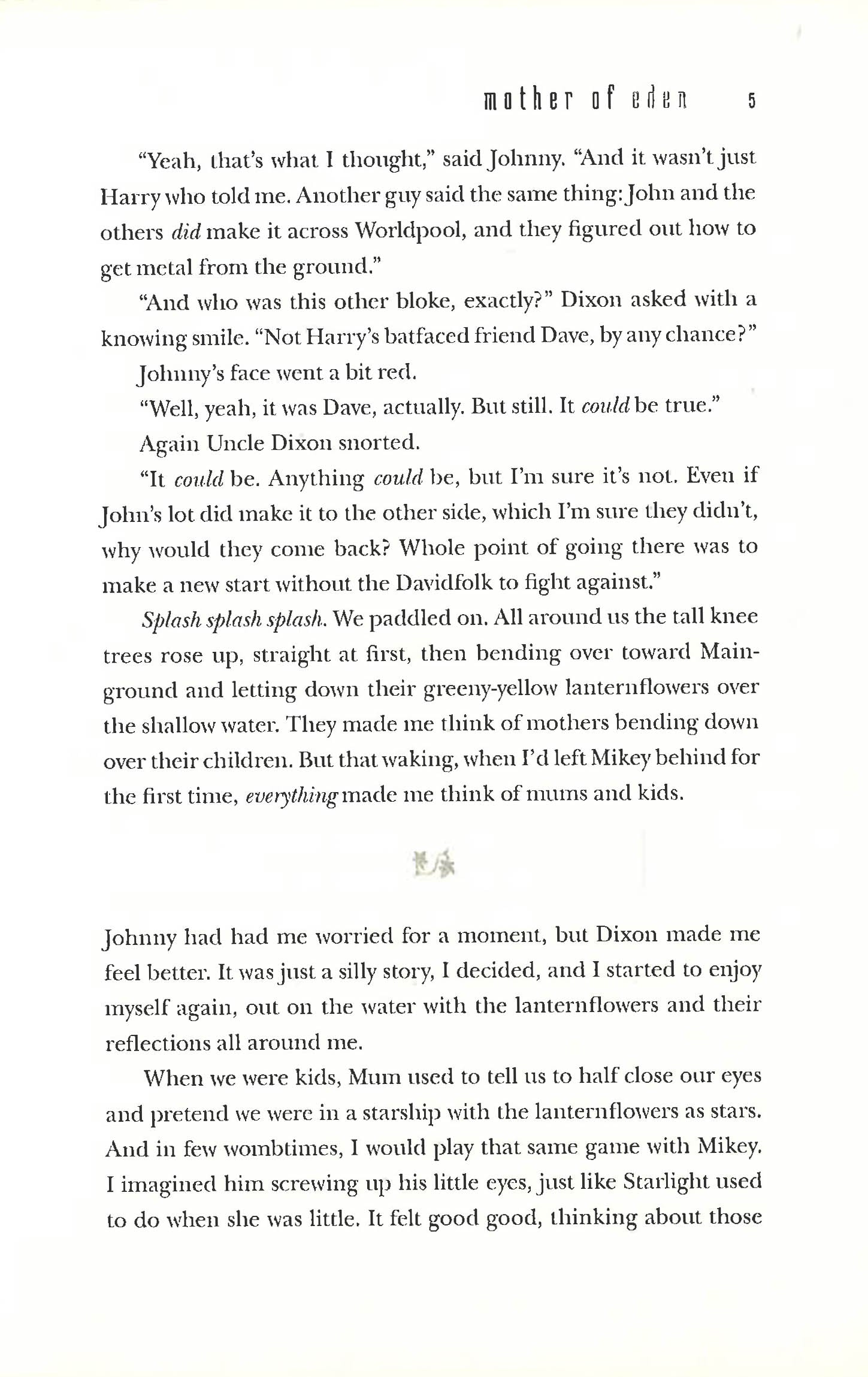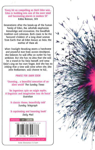 Mother of Eden has been shortlisted for the British Science Fiction Association Novel of the Year Award, 2015. 'We speak of a mother's love, but we forget her power. Power over life. Power to give and to withhold.' Generations after the breakup of the human family of Eden, the Johnfolk emphasise knowledge and innovation, the Davidfolk tradition and cohesion. But both have built hierarchical societies sustained by violence and dominated by men - and both claim to be the favoured children of a long-dead woman from Earth that all Eden knows as Gela, the mother of them all. When Starlight Brooking meets a handsome and powerful man from across Worldpool, she believes he will offer an outlet for her ambition and energy. But she has no idea that she will be a stand-in for Gela herself, and wear Gela's ring on her own finger. And she has no idea of the enemies she will make, no inkling that a time will come when she, like John Redlantern, will choose to kill...