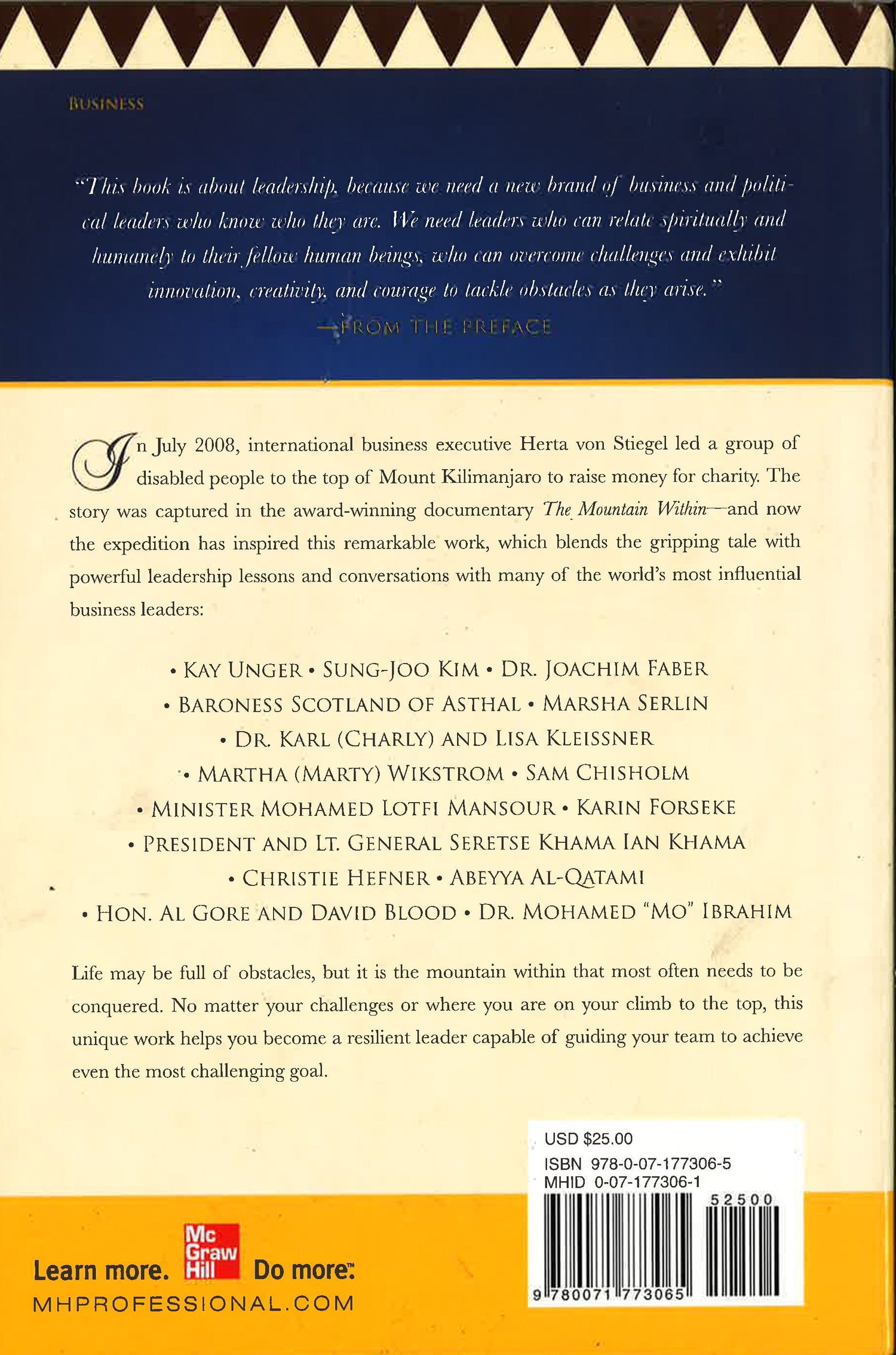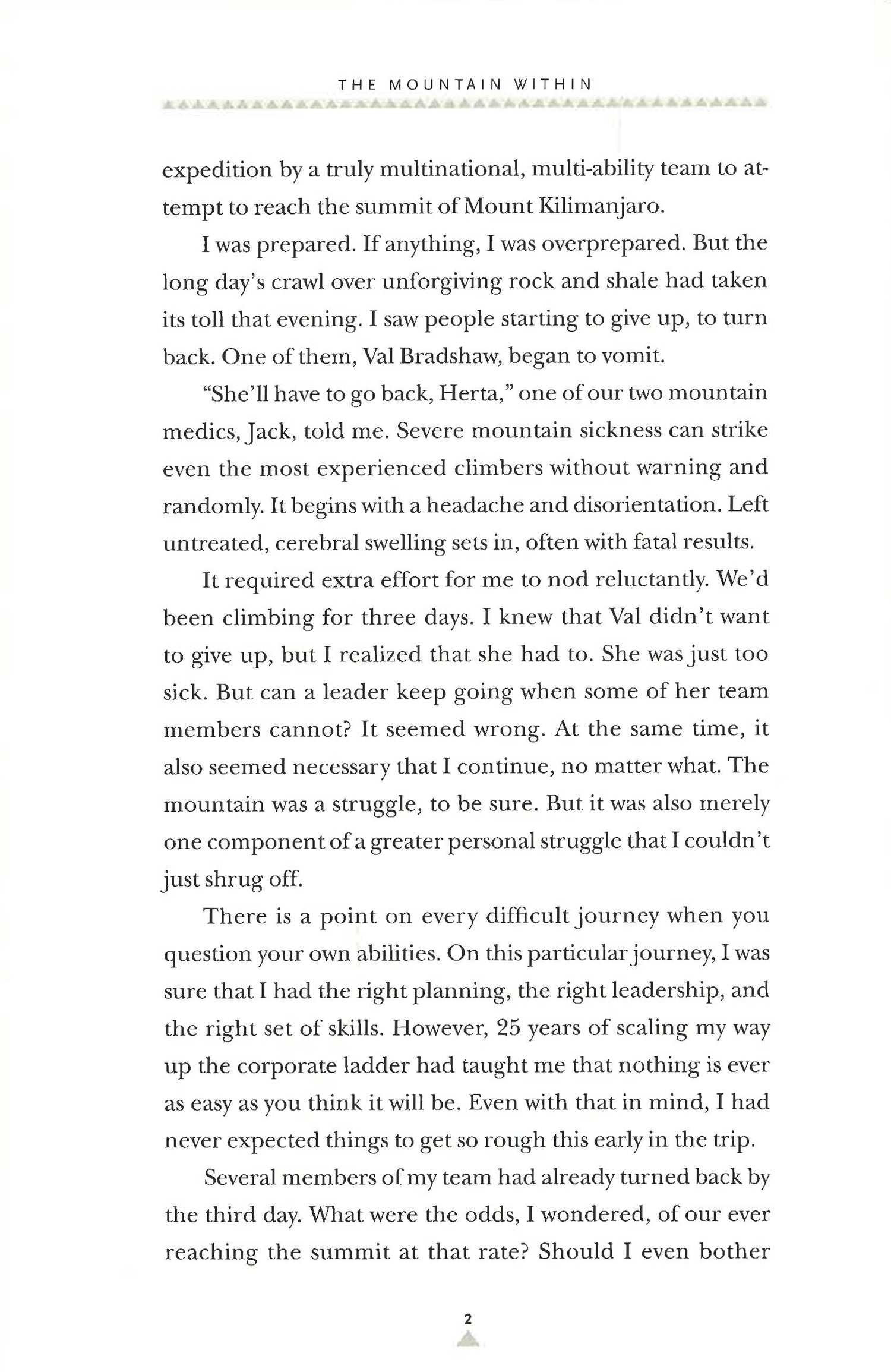 The Mountain Within-which bears the name of Herta's award-winning documentary-tells the emotionally charged story of the climb. Herta's narrative reveals several invaluable lessons for today's business leaders: ruthlessly prepare; use failure as a stepping-stone for success; hang on to your vision; and know when it's time to come down from the mountain.
