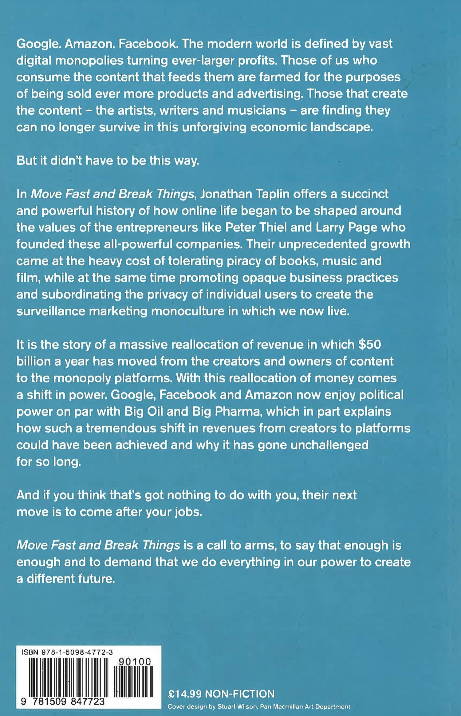 A Financial Times 'Best Thing I Read This Year' 2017 LONGLISTED FOR THE FT & MCKINSEY BUSINESS BOOK OF THE YEAR AWARD Google. Amazon. Facebook. The modern world is defined by vast digital monopolies turning ever-larger profits. Those of us who consume the content that feeds them are farmed for the purposes of being sold ever more products and advertising. Those that create the content - the artists, writers and musicians - are finding they can no longer survive in this unforgiving economic landscape. But it didn't have to be this way. In Move Fast and Break Things, Jonathan Taplin offers a succinct and powerful history of how online life began to be shaped around the values of the entrepreneurs like Peter Thiel and Larry Page who founded these all-powerful companies. Their unprecedented growth came at the heavy cost of tolerating piracy of books, music and film, while at the same time promoting opaque business practices and subordinating the privacy of individual users to create the surveillance marketing monoculture in which we now live. It is the story of a massive reallocation of revenue in which $50 billion a year has moved from the creators and owners of content to the monopoly platforms. With this reallocation of money comes a shift in power. Google, Facebook and Amazon now enjoy political power on par with Big Oil and Big Pharma, which in part explains how such a tremendous shift in revenues from creators to platforms could have been achieved and why it has gone unchallenged for so long. And if you think that's got nothing to do with you, their next move is to come after your jobs. Move Fast and Break Things is a call to arms, to say that is enough is enough and to demand that we do everything in our power to create a different future.