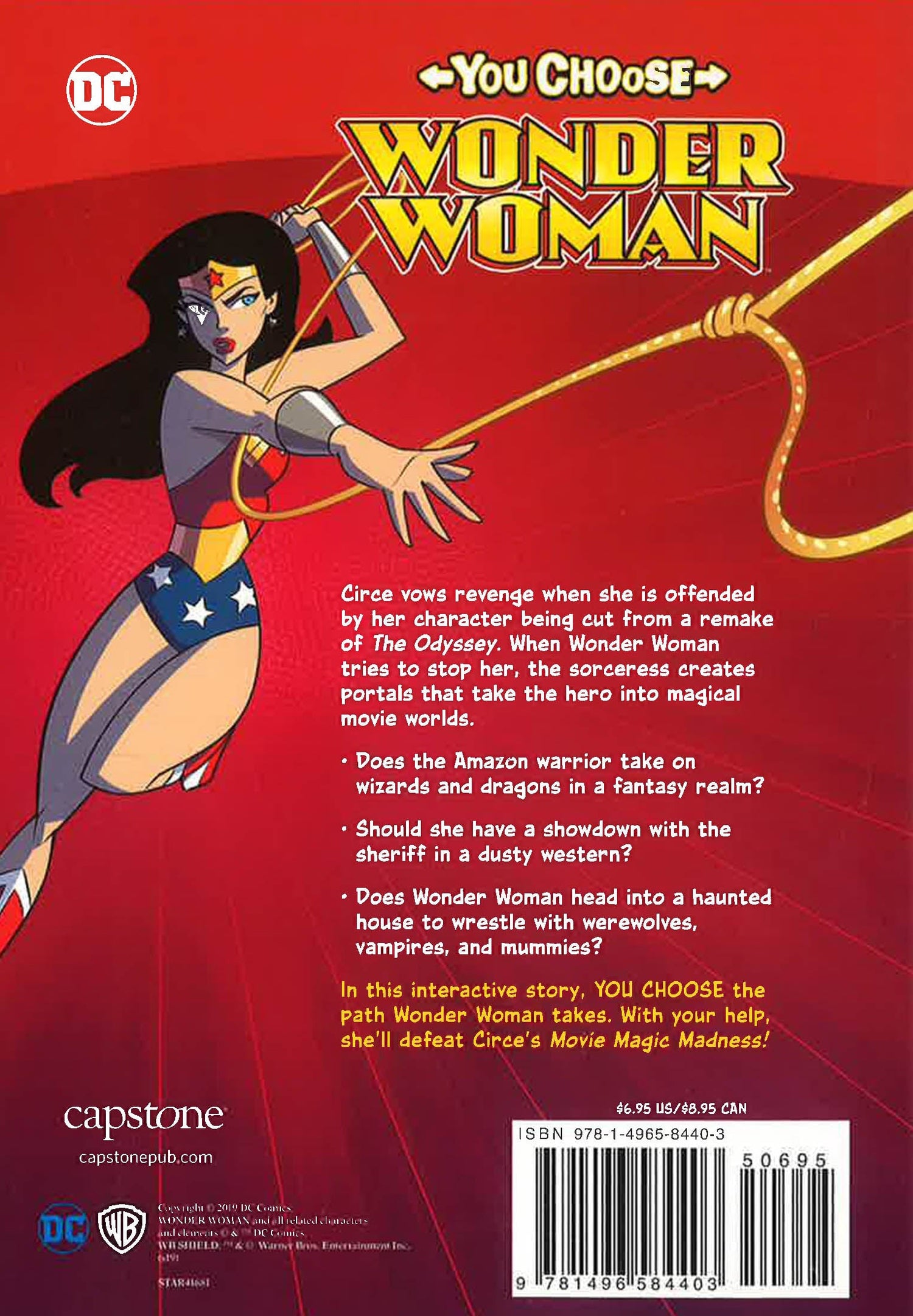 Circe vows revenge when she is offended by her likeness during filming for a remake of The Odyssey. When Wonder Woman tries to stop her, the sorceress conjures a portal that takes the hero to a realm of magical movie genres. Does the Amazon warrior take on wizards and dragons in a fantasy realm? Should have a showdown with the sheriff in a dusty western? Does Wonder Woman head into a haunted house to wrestle with werewolves, vampires, and mummies? In this interactive story, YOU CHOOSE the path Wonder Woman takes. With your help, she'll defeat Circe's Movie Magic Mischief!