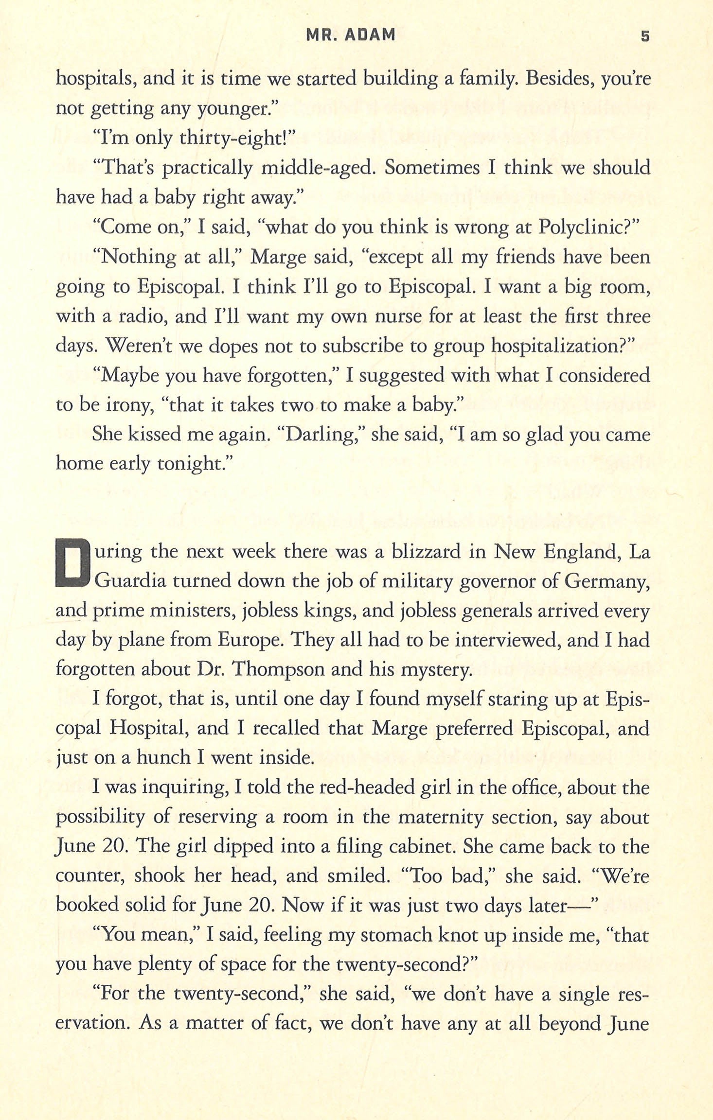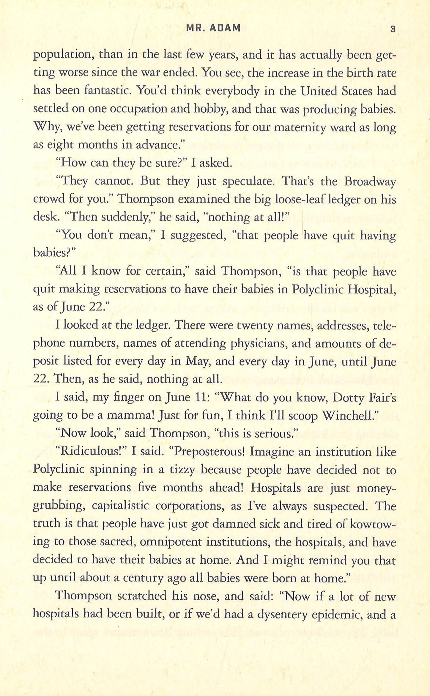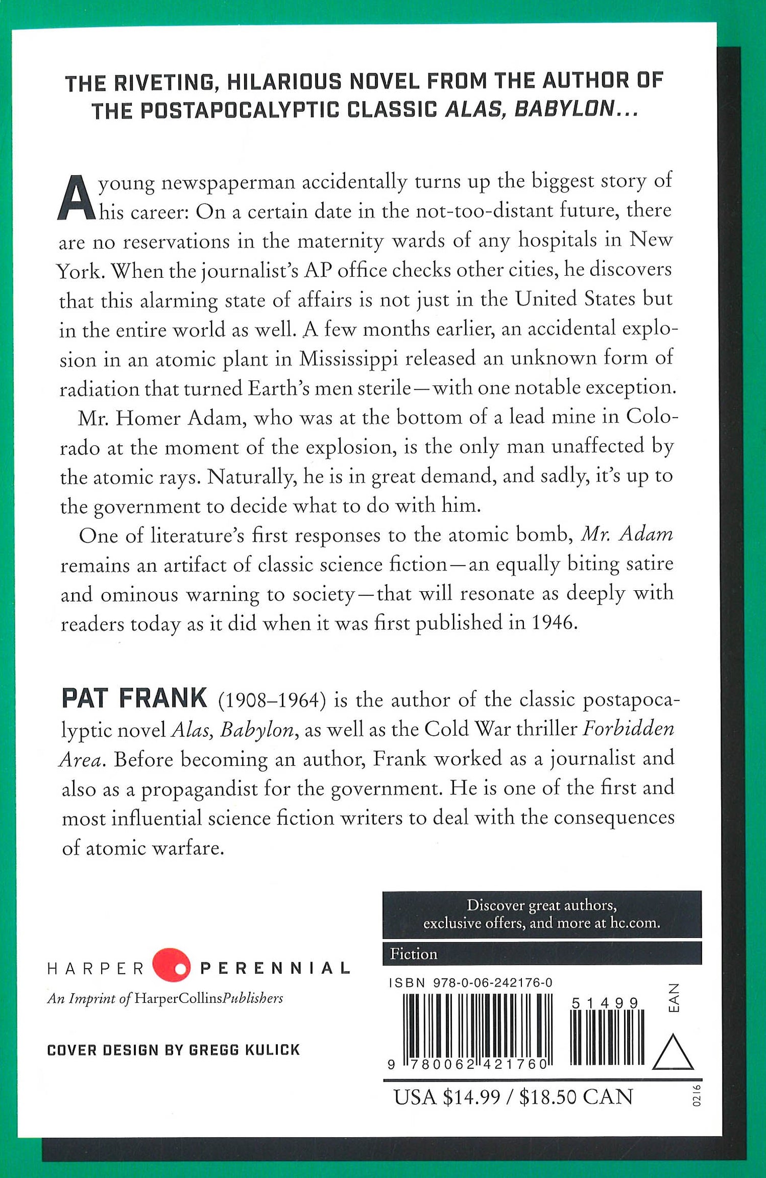 A young newspaperman accidentally turns up the biggest story of his career: On a certain date in the not-too-distant future, there are no reservations in the maternity wards of any hospitals in New York. When the journalist’s AP office checks other cities, he discovers that this alarming state of affairs is not just in the United States, but in the entire world. A few months earlier, an accidental explosion in an atomic plant in Mississippi released an unknown form of radiation that turned the Earth’s men sterile - with one notable exception. Mr. Homer Adam, who was at the bottom of a lead mine in Colorado at the moment of the explosion, is the only man unaffected by the atomic rays. Naturally, he is in great demand, and sadly, it’s up to the government to decide what to do with him.