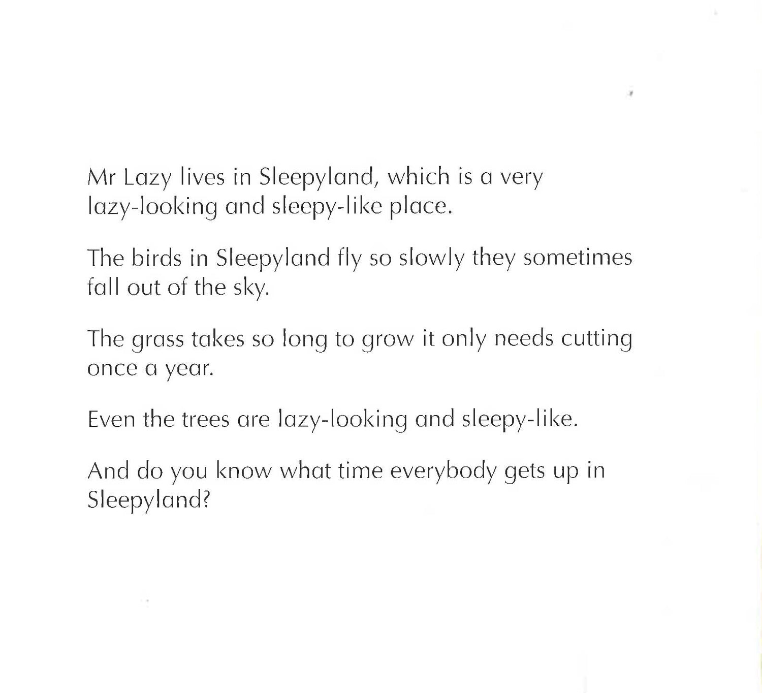 Mr Lazy lives in Sleepyland, which is a very lazy-looking and sleepy-like place. He spends rather a lot of time in bed. It's his favourite place to be. The Mr Men and Little Miss have been delighting children for generations with their charming and funny antics. Bold illustrations and funny stories make Mr Men and Little Miss the perfect story time experience for children aged two up. Have you met them all? It all started with a tickle. Roger Hargreaves' son Adam asked him what a tickle looked like. In response, Roger drew a small orange man with extraordinarily long arms that could reach anywhere and tickle anyone. Mr Tickle, the first of the Mr Men, was born. Mr Tickle was soon joined by Mr Greedy, Mr Happy, Mr Nosey, Mr Sneeze and Mr Bump. The books were an instant hit and Roger went on to create many more Mr Men and Little Miss characters. What Roger really wanted was to make children laugh, which is probably why his own favourite character is Mr Silly.