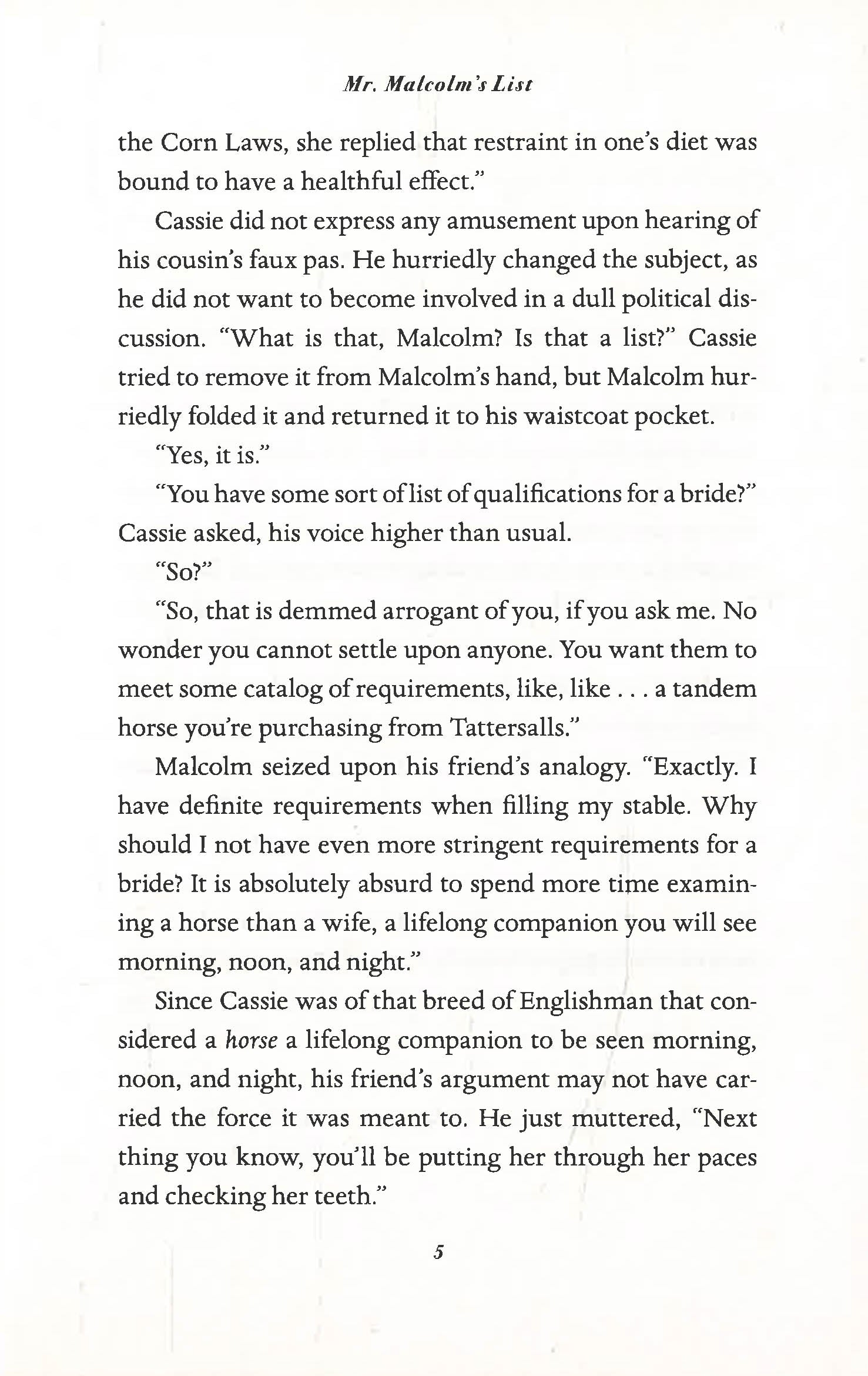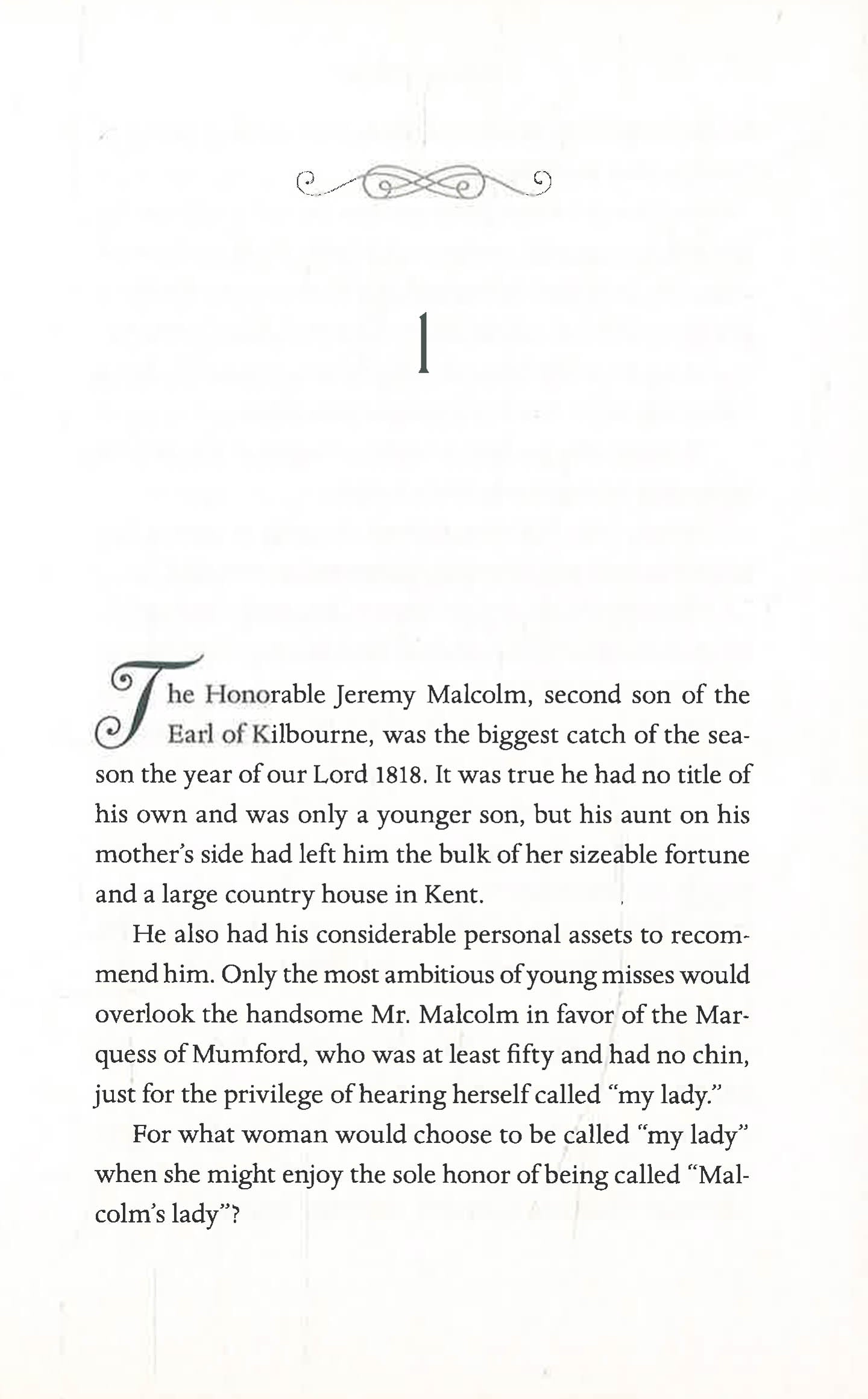The Honourable, excessively handsome, excessively wealth and perhaps a tad egotistical, Mr Malcolm is searching for a wife - but not just any wife. He's armed himself with a list of ideal qualities that his future wife will have to embody. After years of searching, he's beginning to despair of ever finding this paragon . . . until Selina Dalton arrives in town.