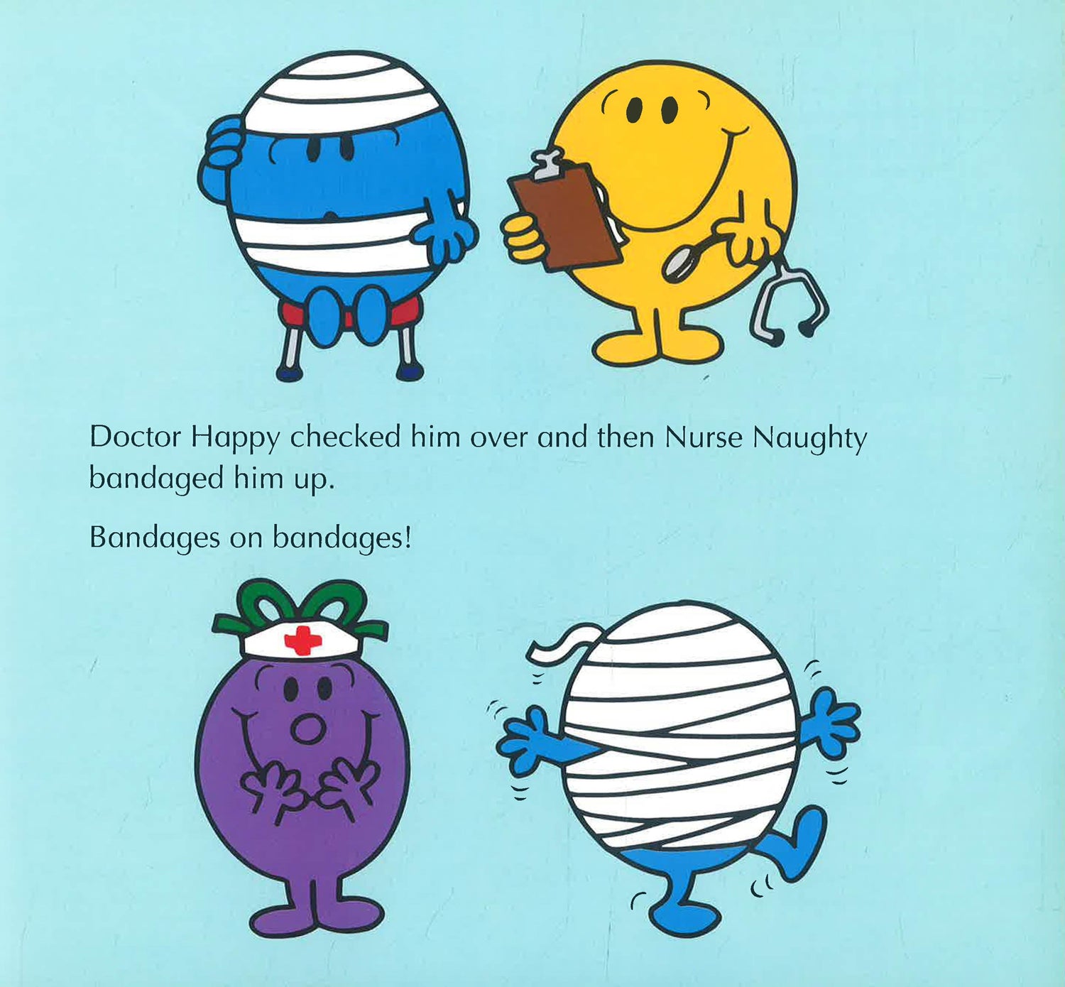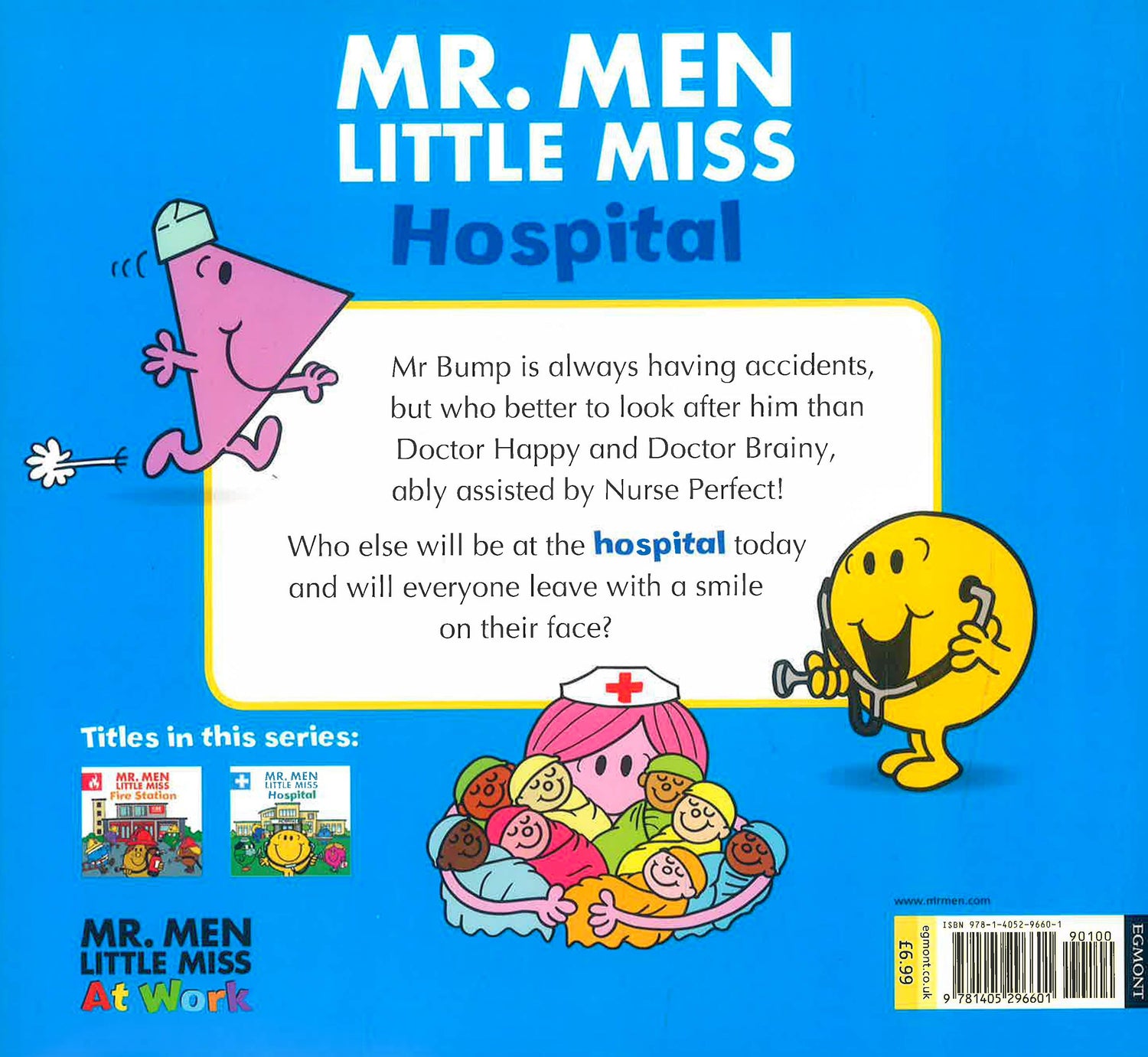 Join the Mr Men and Little Miss as they go to work at a hospital! Mr Bump is always having accidents and sometimes these mean that he has to go to hospital. But who better to look after him than Doctor Happy and Doctor Brainy, ably assisted by Nurse Perfect! A trip to hospital when the Mr Men and Little Miss are in charge is sure to bring a smile to anyone's face! This new series features the Mr Men and Little Miss in work environments and is the perfect story range for young children interested in playing and learning about what goes on in the adult world of work.