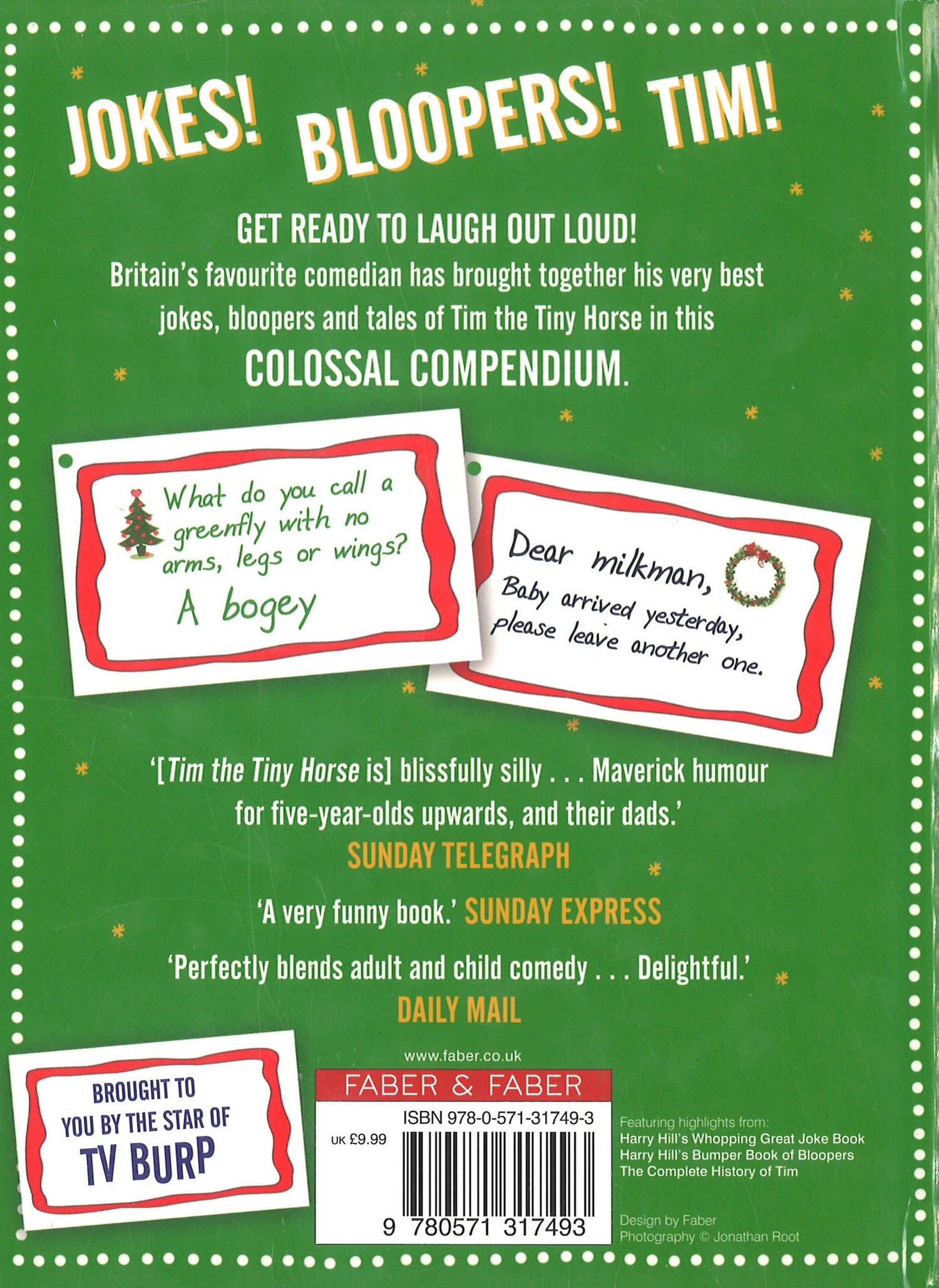 Comedy superstar Harry Hill is back with a brilliant bumper edition of the very best jokes, bloopers and tall tales of Tiny Tim. There's fun for all the family to share: JOKES! What do you call a greenfly with no arms, legs or wings? A bogey. BLOOPERS! 'Dear milkman, baby arrived yesterday. Please leave another one.' FUNNY STORIES! The hilarious capers of Tim the Tiny Horse and his best friend, Fly. Selected from Harry Hill's Whopping Great Joke Book, Harry Hill's Bumper Book of Bloopers and Complete History of Tim.