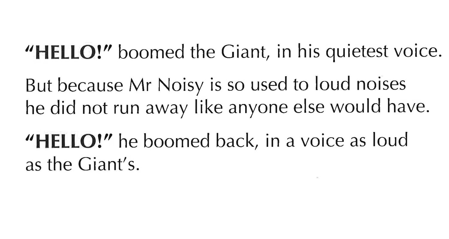 Mr Noisy is so loud that he scares people and makes their hairs stand on end. But when he meets a friendly Giant with a voice as loud as his they get on like a house on fire. Will they ever find an especially noisy place to be as noisy as they like.