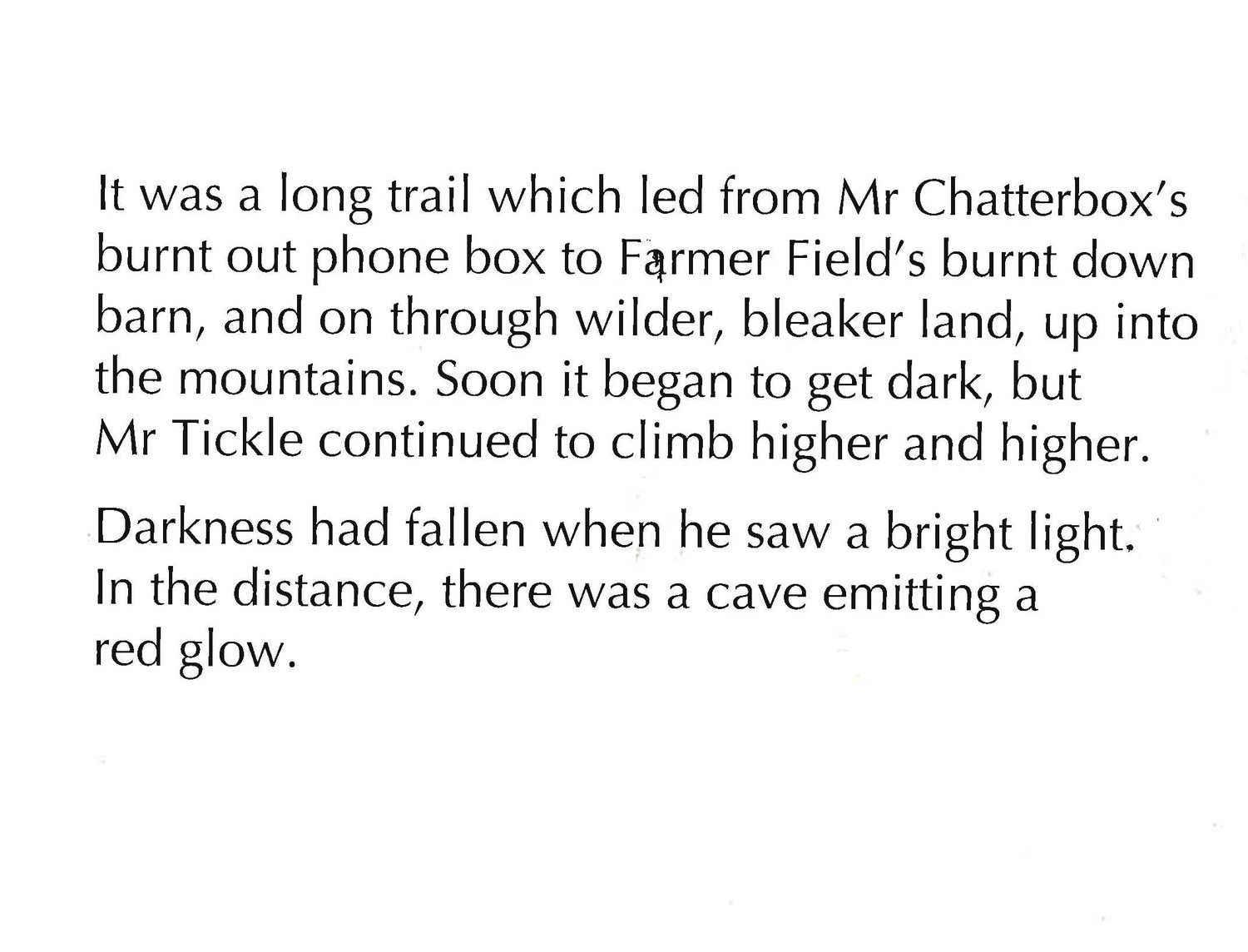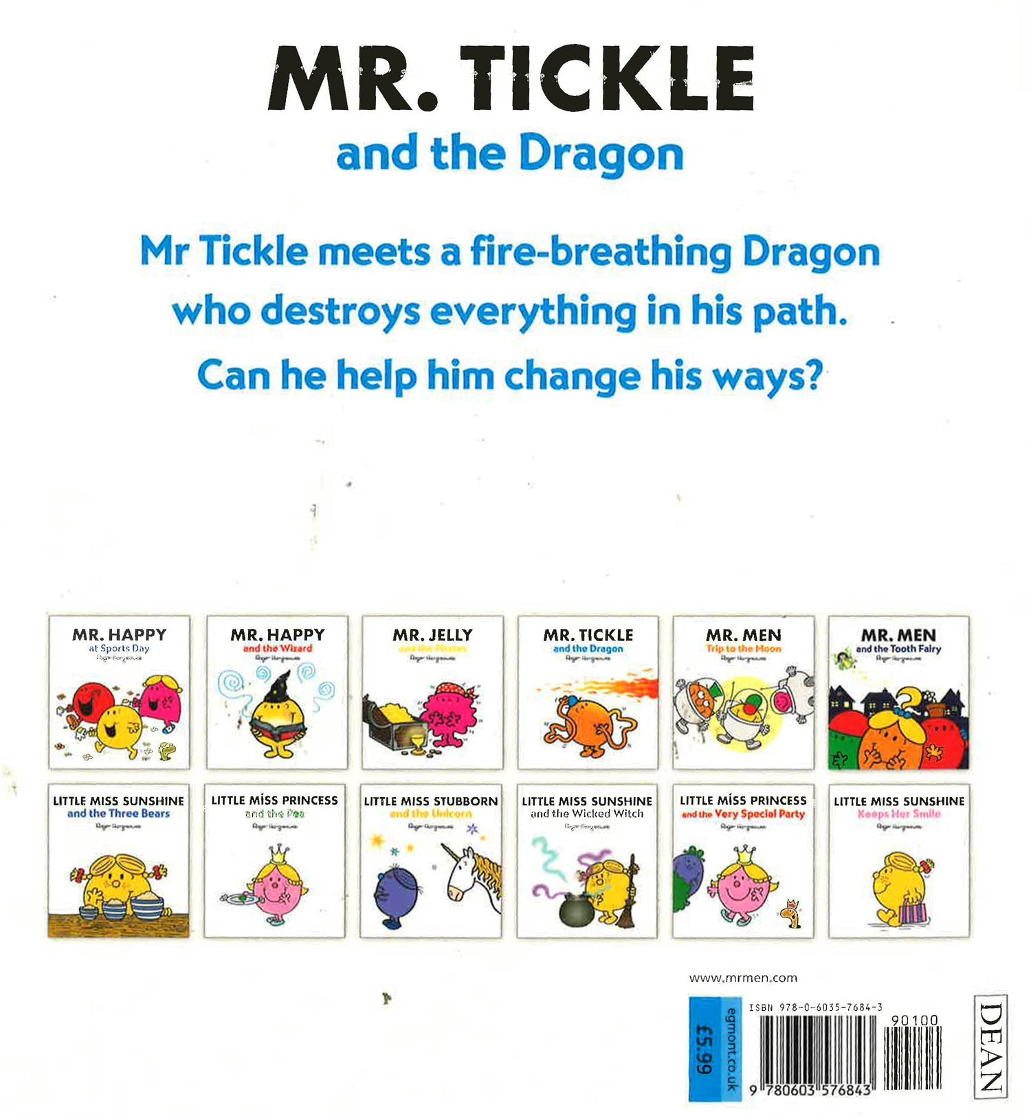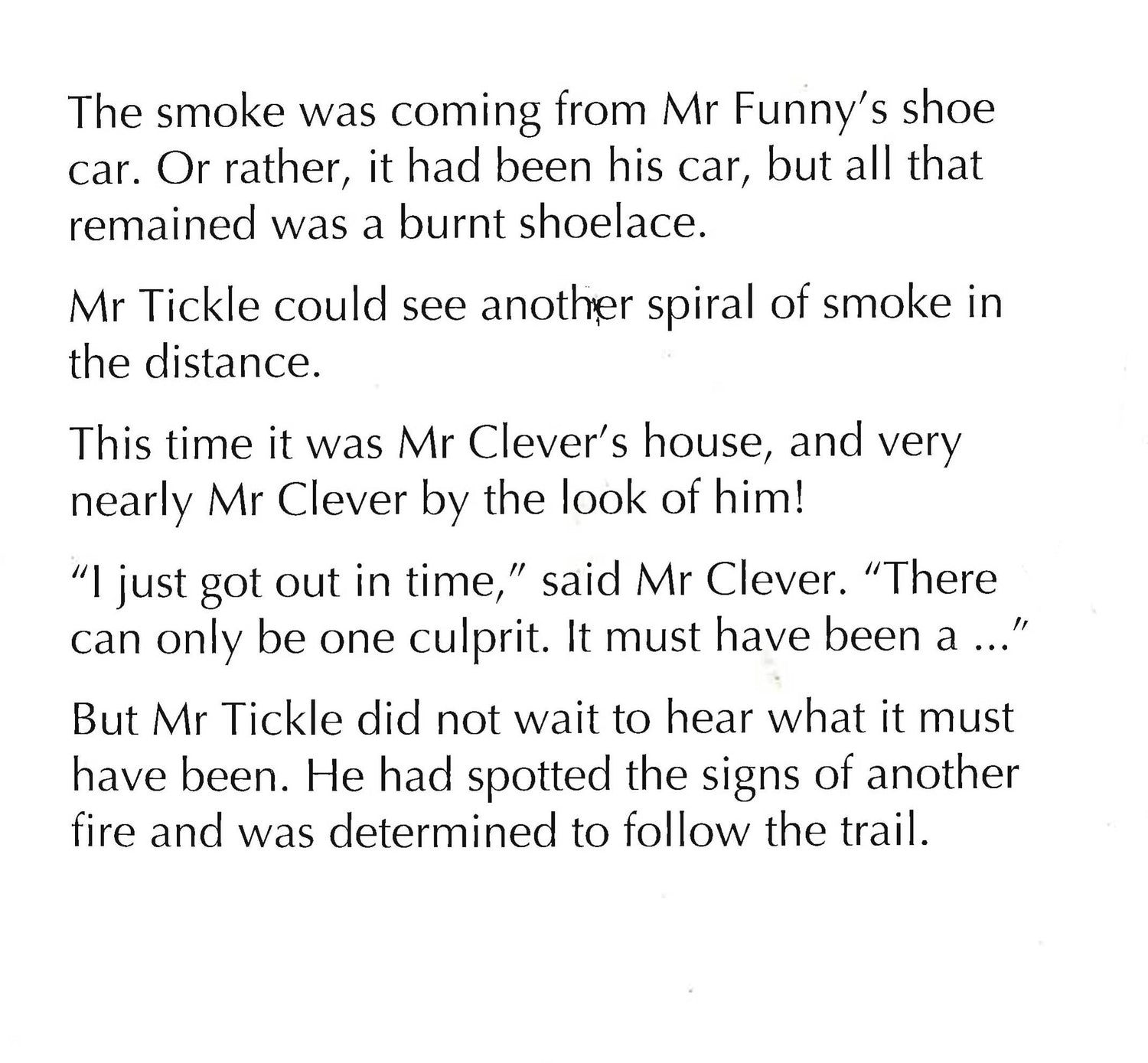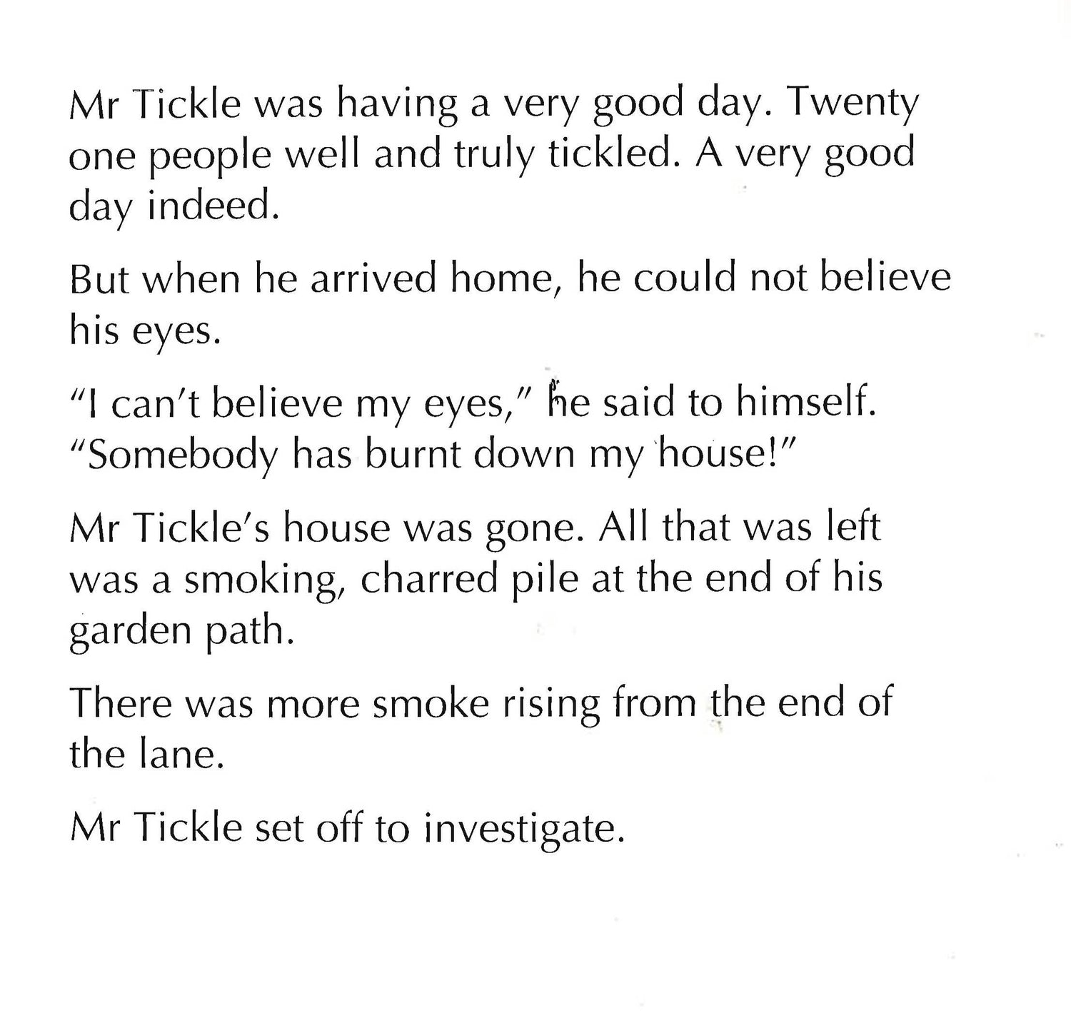 Mr. Tickle has returned home from a day full of tickling to discover that his house has burned down! After some detective work, he discovers that a dragon is to blame. But can he stop the dragon from burning down everything else?