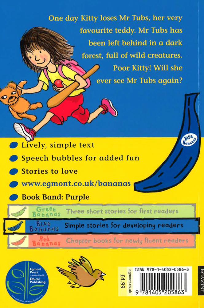 An adorable teddy bear story from Bel Mooney for Egmont's Blue Banana series. Mr. Tubs the teddy always looks after his owner, Kitty. He knows she'd be lost without him. But one day Kitty loses Mr. Tubs. Poor Mr. Tubs--left behind in a dark forest, full of wild creatures. And poor Kitty. Will she ever see Mr. Tubs again? Blue bananas are chapter books for children learning to read, suitable for NC Level 2 readers. They are carefully designed educational books for children, supporting their understanding of how to read and develop vocabulary. Blue bananas uses speech bubbles to aid understanding of dialogue and the text encourages children to explore the feelings of characters.