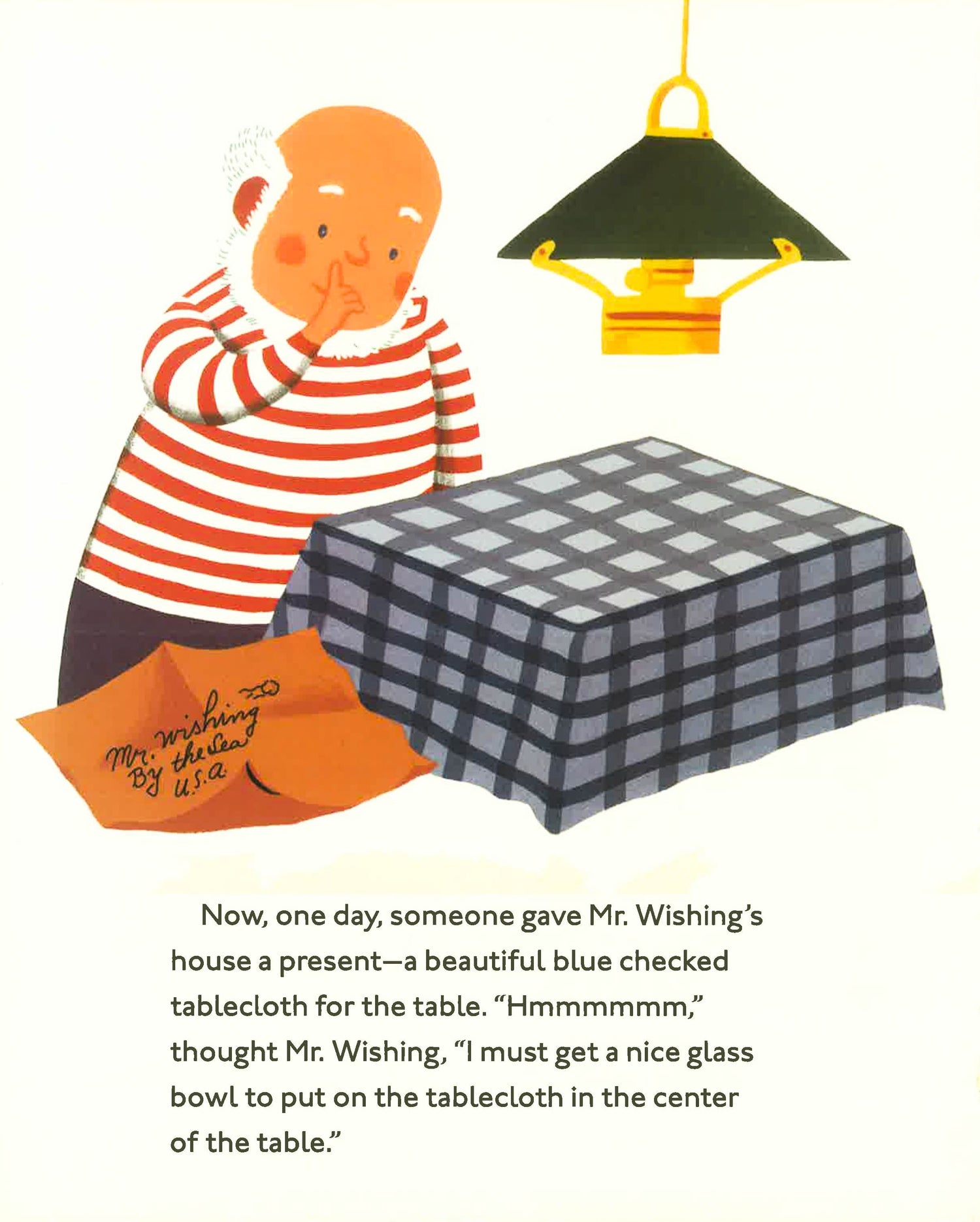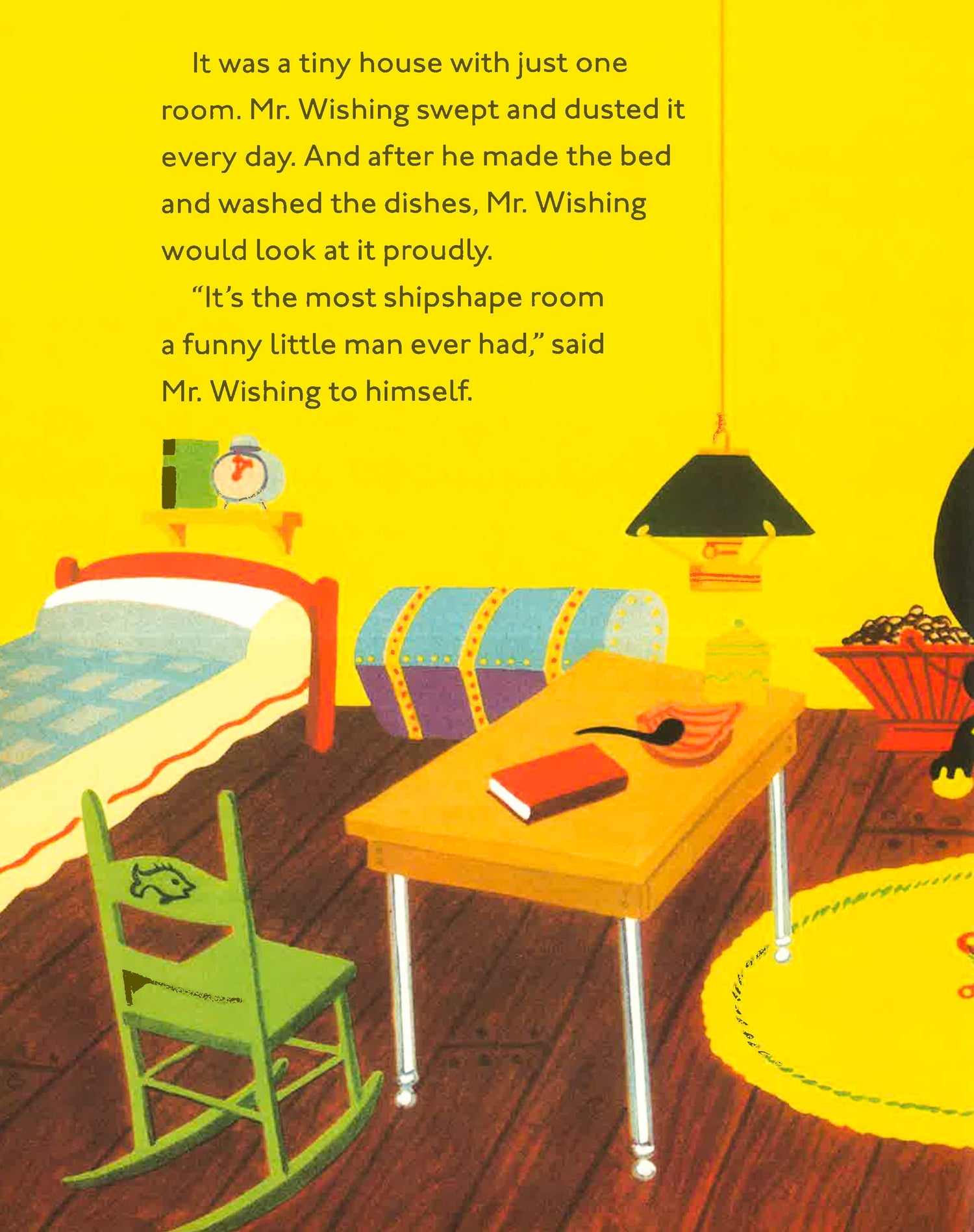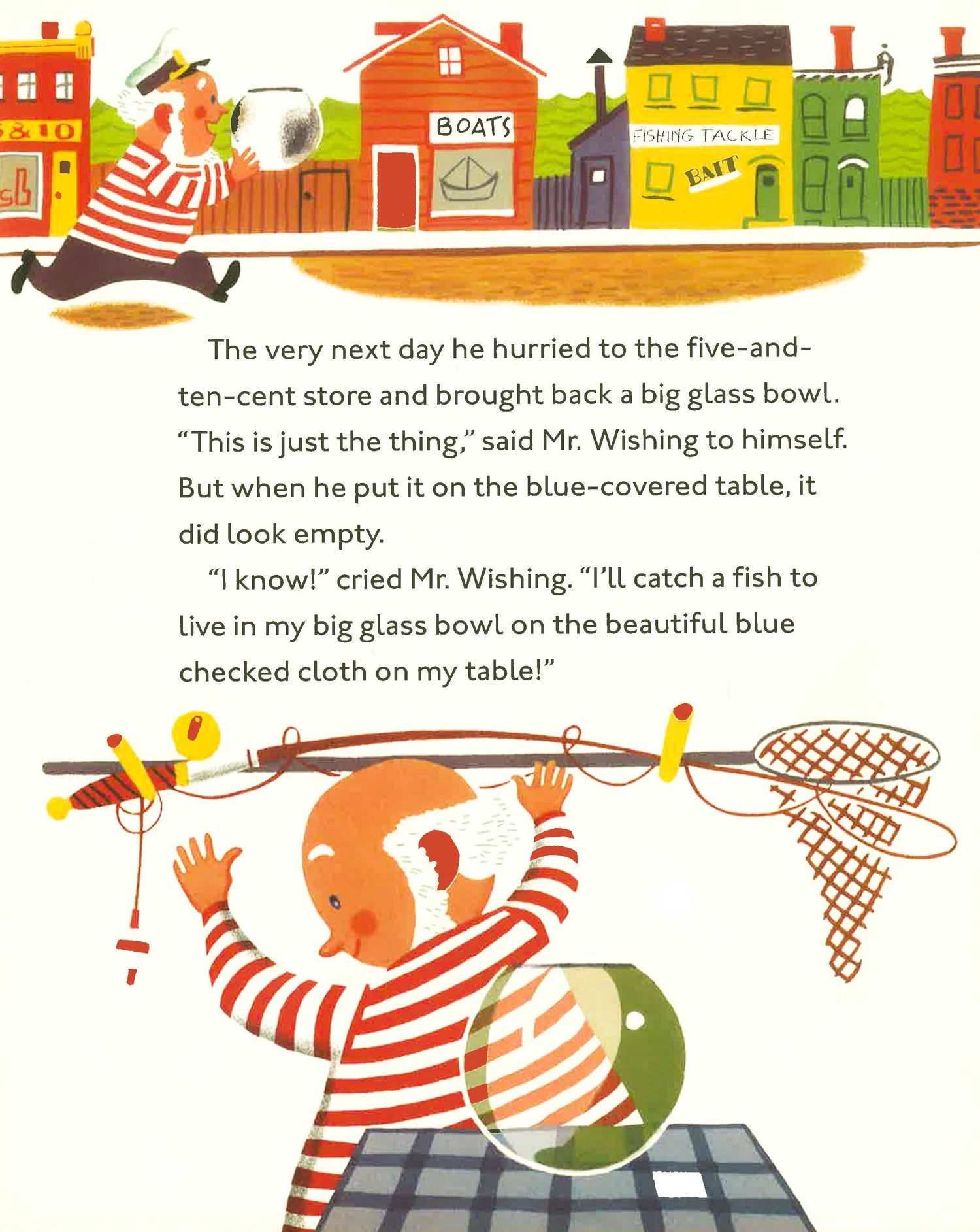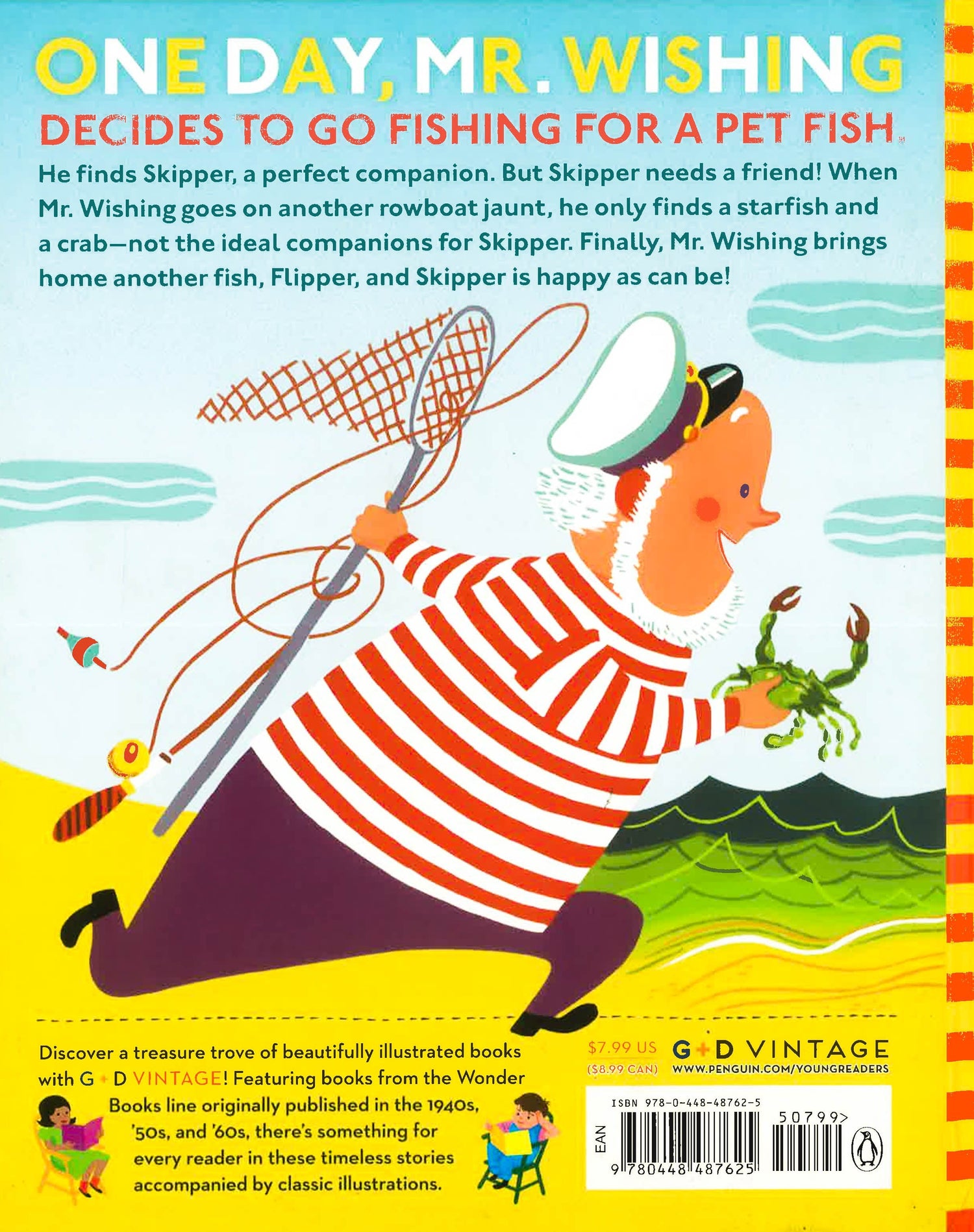 Mr. Wishing gets a friend for his pet fish! Mr. Wishing decides to go fishing for a pet fish and finds Skipper, a perfect companion. But Skipper needs a friend! Mr. Wishing goes on another rowboat jaunt, but all he manages to catch are a starfish and a crab, which are not the ideal fish bowl companions for Skipper. Finally, Mr. Wishing brings home another fish, Flipper, and Skipper is happy as can be!