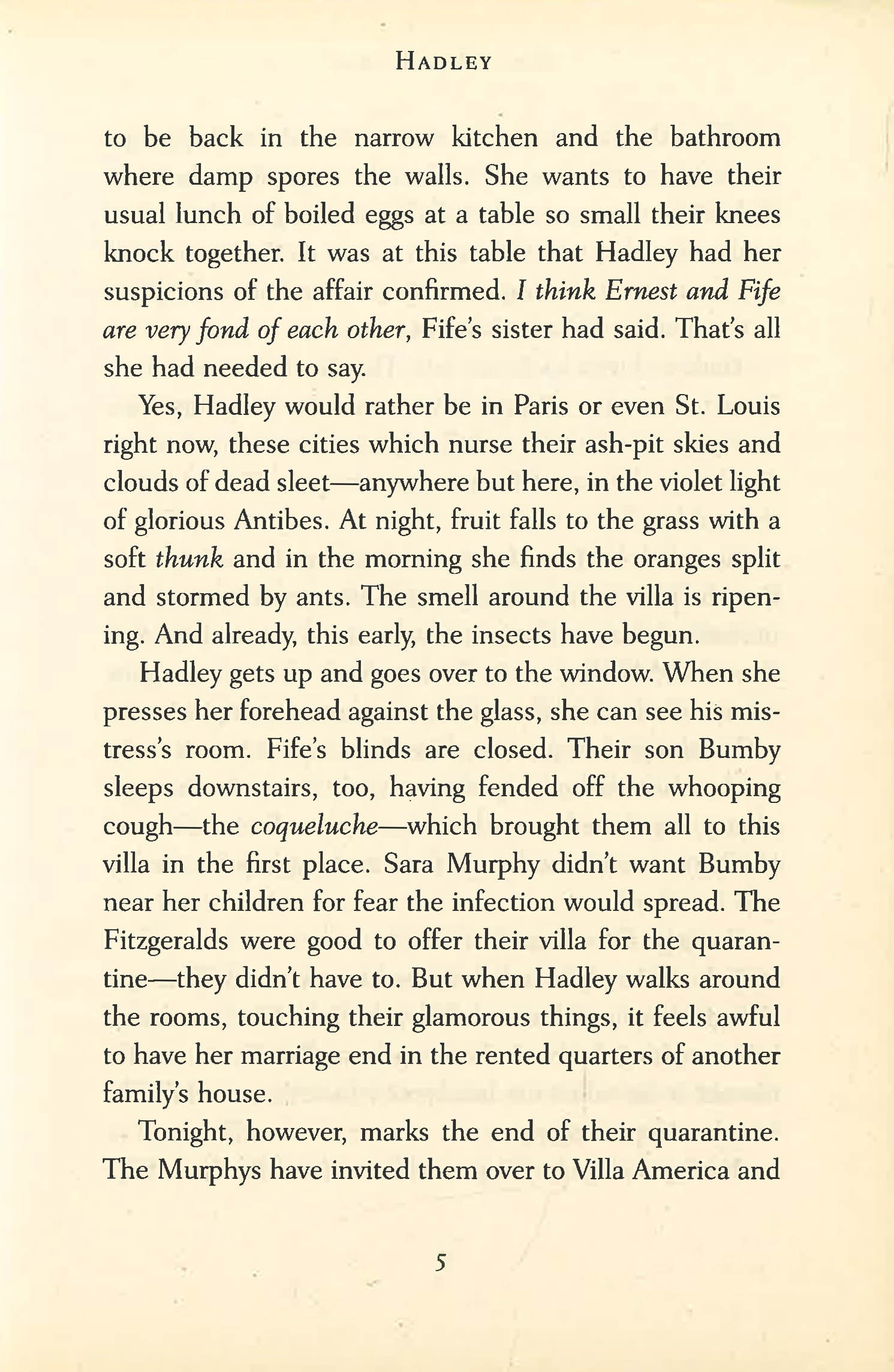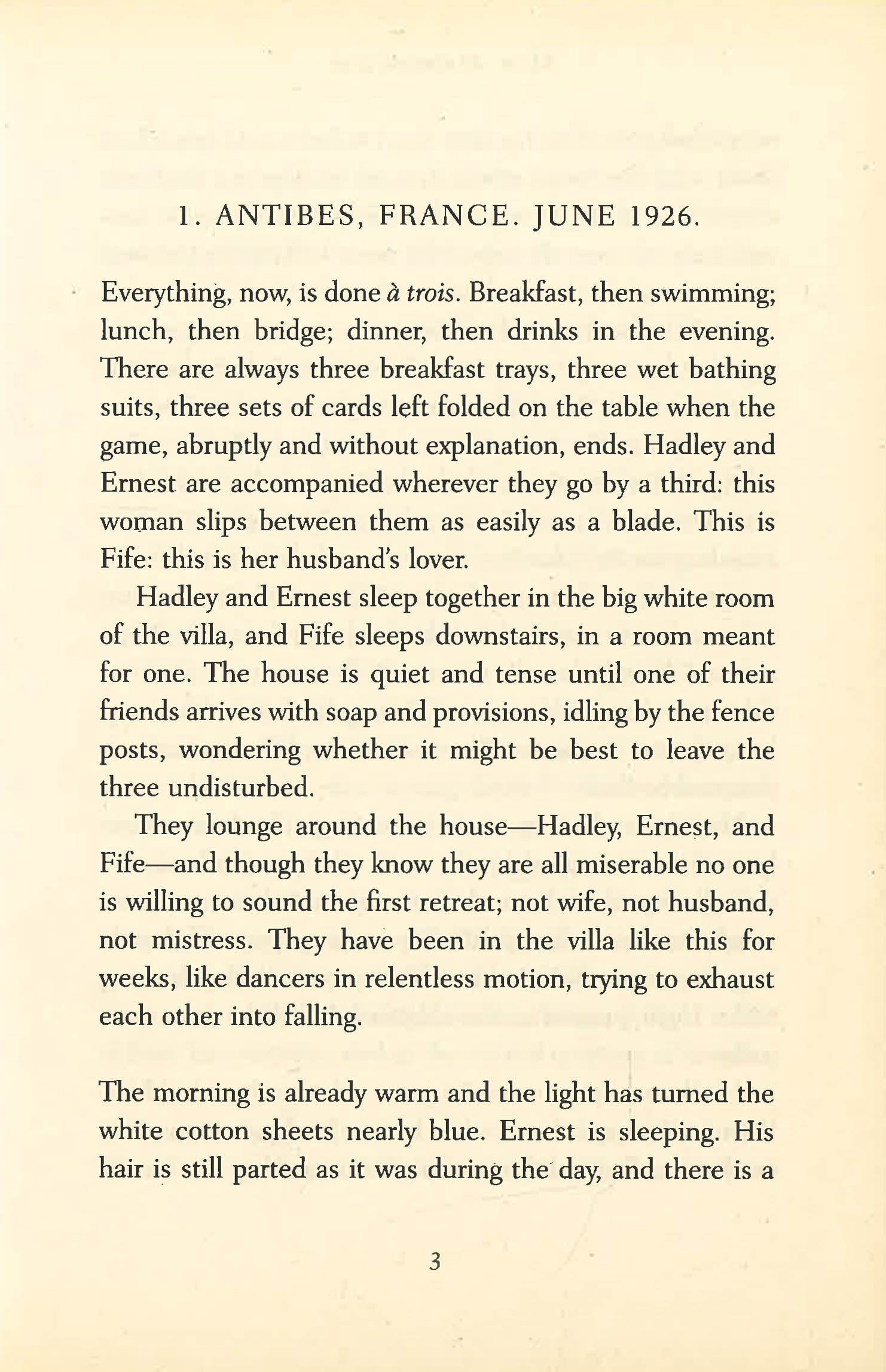 In the dazzling summer of 1926, Ernest Hemingway and his wife Hadley travel from their home in Paris to a villa in the south of France. They swim, play bridge and drink gin. But wherever they go they are accompanied by the glamorous and irrepressible Fife. Fife is Hadley's best friend. She is also Ernest's lover.