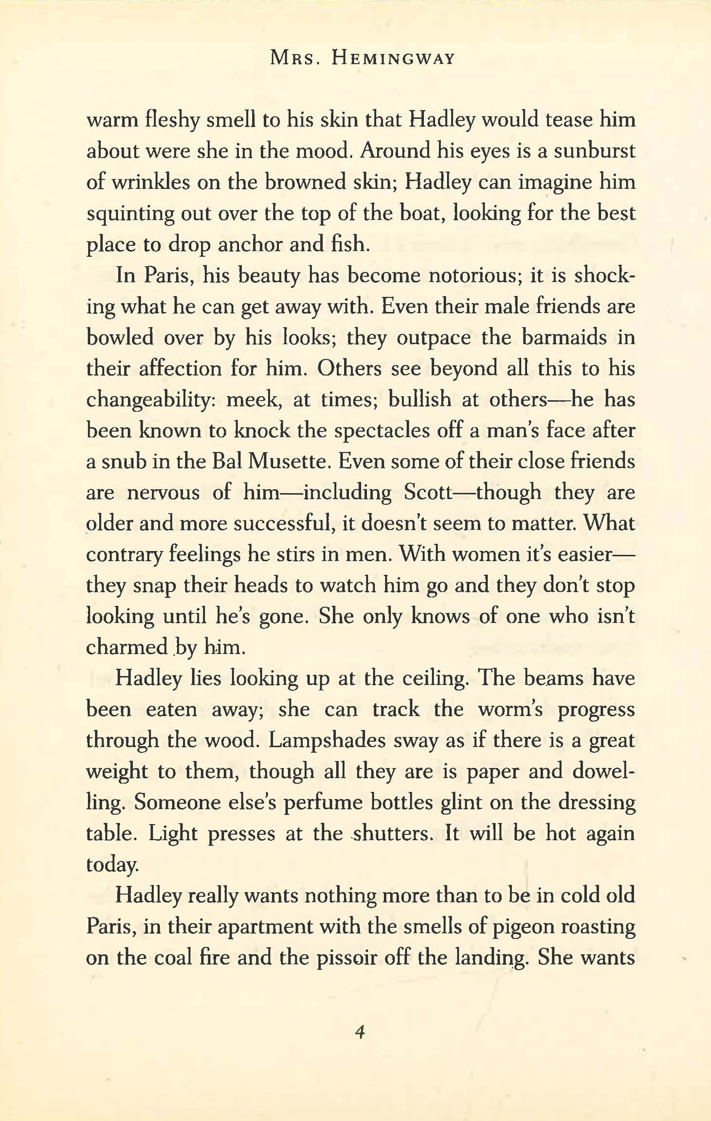 Hadley is the first Mrs. Hemingway, but neither she nor Fife will be the last. Over the ensuing decades, Ernest's literary career will blaze a trail, but his marriages will be ignited by passion and deceit. Four extraordinary women will learn what it means to love the most famous writer of his generation, and each will be forced to ask herself how far she will go to remain his wife . .
