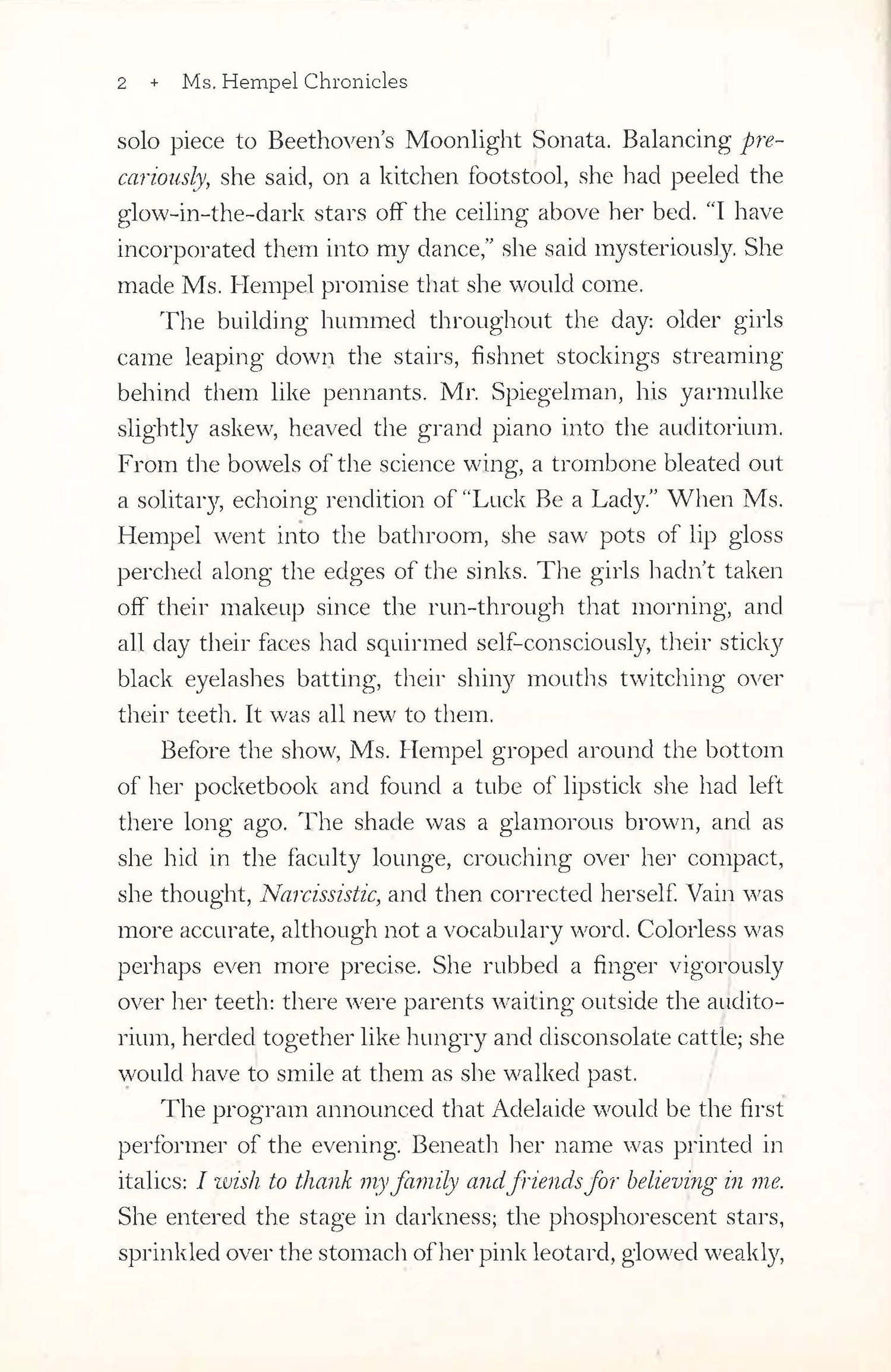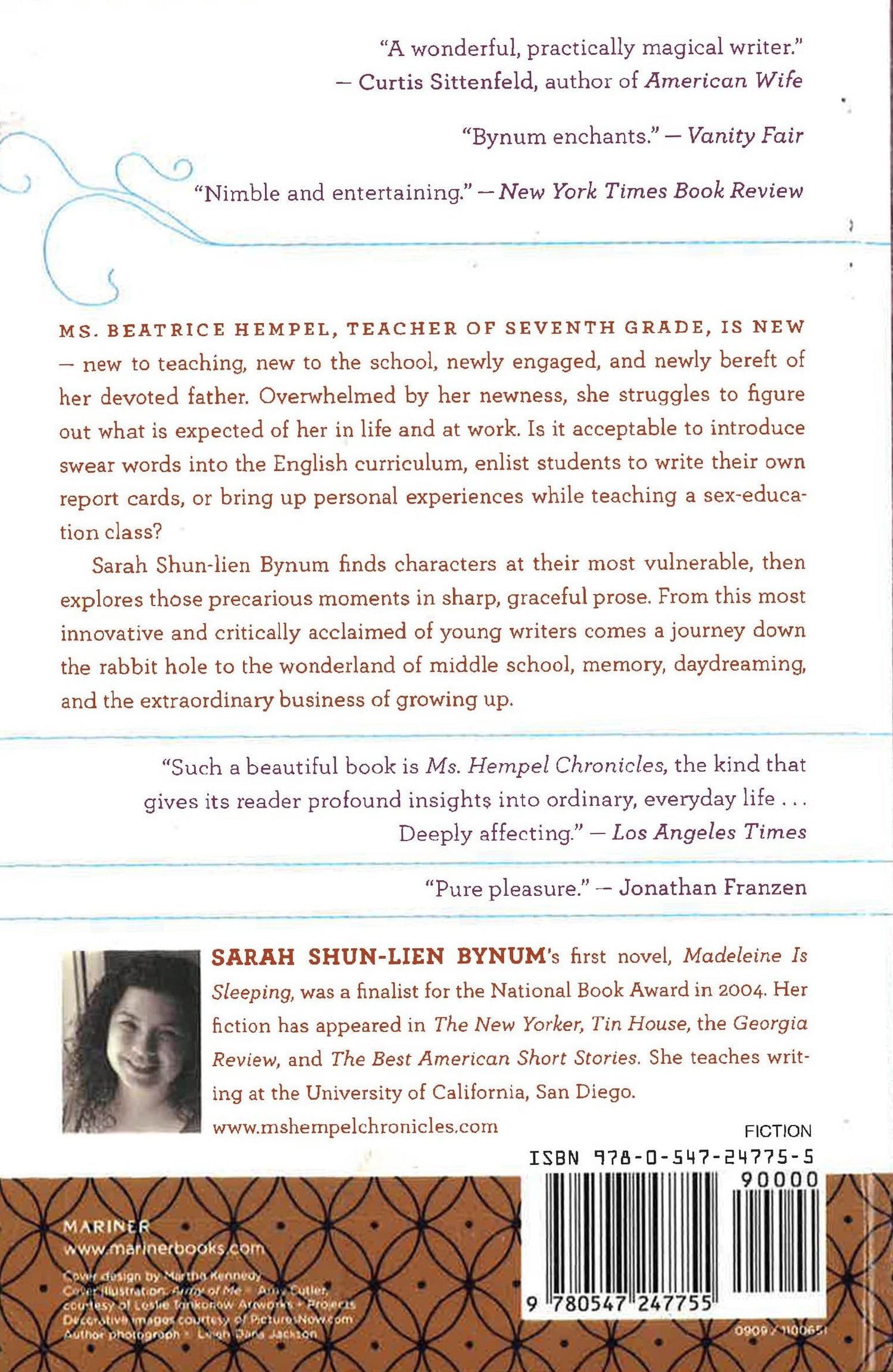 Ms. Beatrice Hempel, teacher of seventh grade, is new--new to teaching, new to the school, newly engaged, and newly bereft of her idiosyncratic father. Grappling awkwardly with her newness, she struggles to figure out what is expected of her in life and at work. Is it acceptable to introduce swear words into the English curriculum, enlist students to write their own report cards, or bring up personal experiences while teaching a sex-education class? Sarah Shun-lien Bynum finds characters at their most vulnerable, then explores those precarious moments in sharp, graceful prose. From this most innovative of young writers comes another journey down the rabbit hole to the wonderland of middle school, memory, daydreaming, and the extraordinary business of growing up.