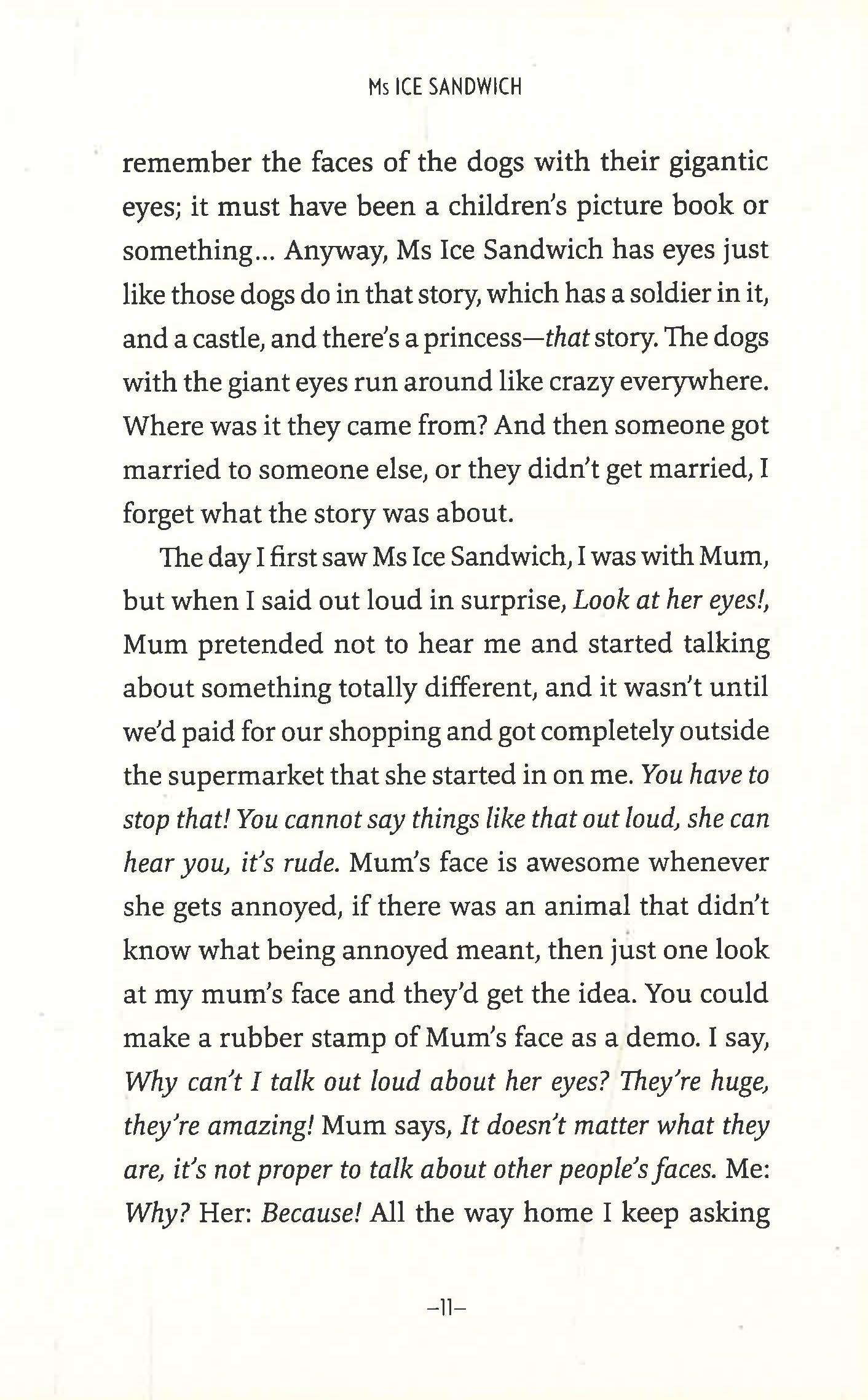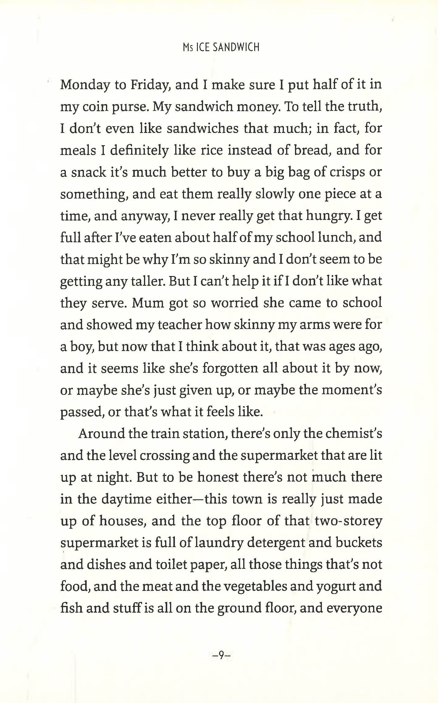 Ms Ice Sandwich seems to lack social graces, but our young narrator is totally smitten with her. He is in awe of her aloofness, her skill at slipping sandwiches into bags, and, most electric of all, her ice-blue eyelids. Every day he is drawn to the supermarket just to watch her in action. But life has a way of interfering - there is his mother, forever distracted, who can tell the fortunes of women; his grandmother, silently dying, who listens to his heart; and his classmate, Tutti, no stranger to pain, who shares her private thrilling world with him.