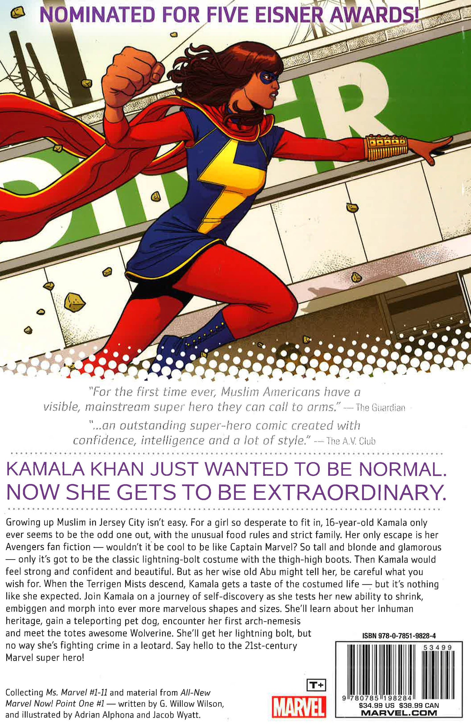 Presenting the international sensation: the all-new Ms. Marvel! Kamala Khan is an ordinary girl from Jersey City - until she's suddenly empowered with extraordinary gifts. But who truly is the new Ms. Marvel? Teenager? Muslim? Inhuman? Find out as she takes the Marvel Universe by storm! When Kamala discovers the dangers of her newfound powers, she also unlocks a secret behind them. Is Kamala ready to wield these immense gifts? Or will the weight of the legacy before her prove too much to bear? Kamala has no idea, either. But she's comin' for you, Jersey! It's history in the making from acclaimed writer G. Willow Wilson (Air, Cairo) and beloved artist Adrian Alphona (Runaways)! COLLECTING: Ms. Marvel 1-11, material from All-New Marvel Now ! Point One