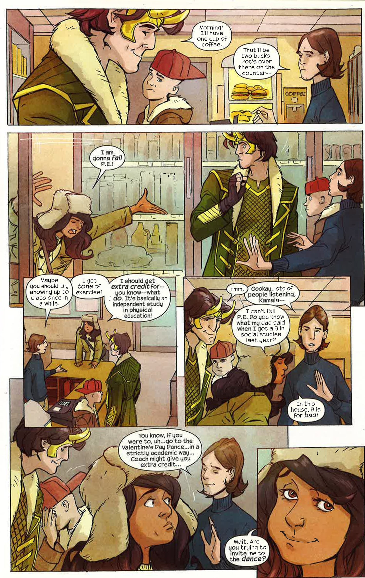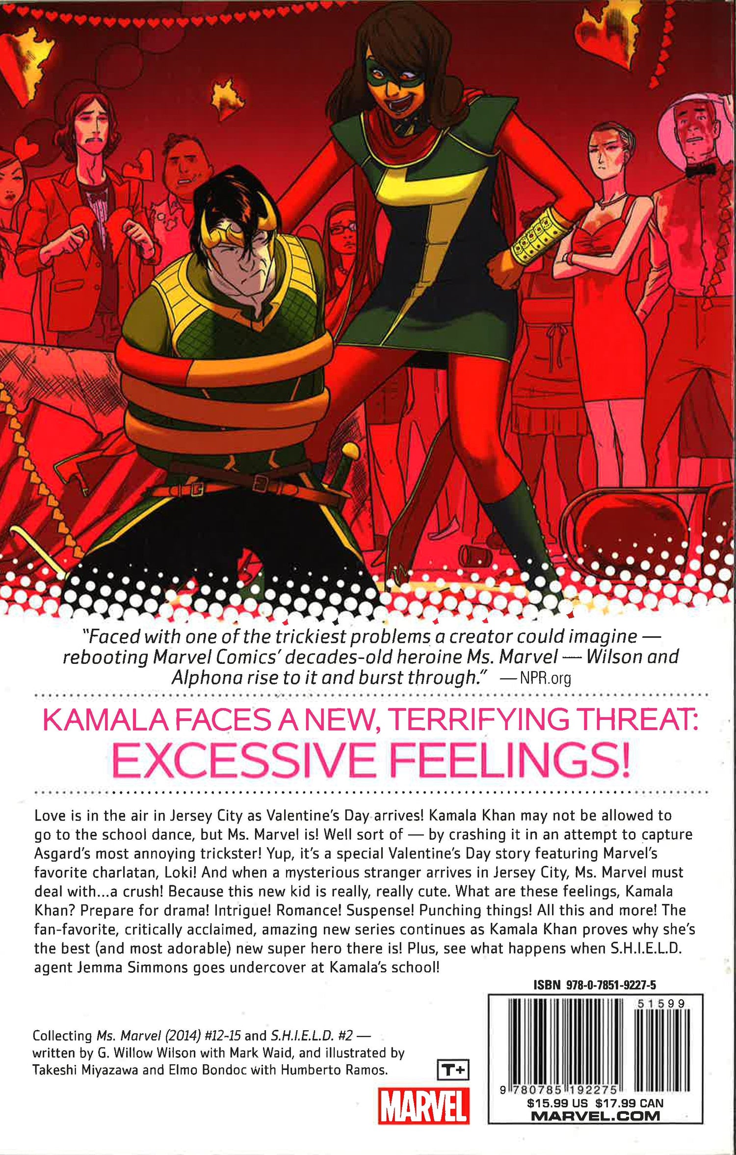 Love is in the air in Jersey City as Valentine's Day arrives! Kamala Khan may not be allowed to go to the school dance... but Ms. Marvel is! Well sort of - by crashing it attempting to capture Asgard's most annoying trickster! It's a special Valentine's Day story featuring Marvel's favourite charlatan, Loki! The fan favourite, critically-acclaimed, amazing new series continues as Kamala Khan proves why she's the best (and most adorable) new super hero there is! Collecting: Ms. Marvel 12-15, Annual 1