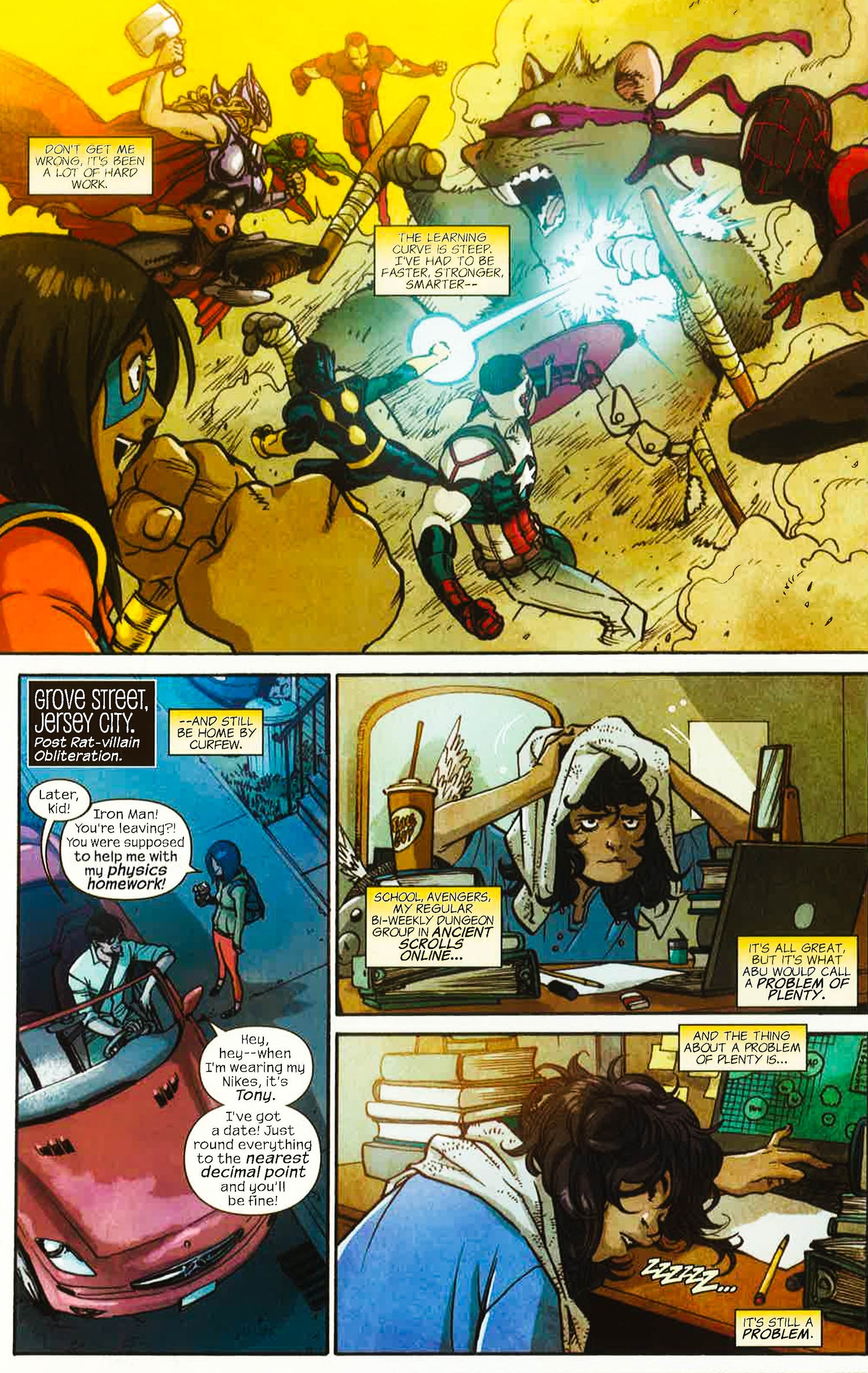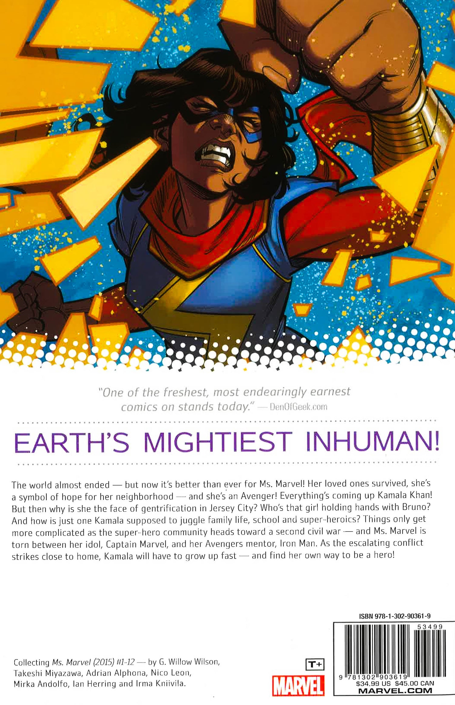 Earth's Mightiest Metamorph! Look out world, Kamala Khan is officially an Avenger! But will it be everything she imagined? Or is life as a celebrity harder than she thought? Saving the world is important, but Jersey City still needs its protector too: A development company using Ms. Marvel's face has more in mind for gentrification than just real estate. Can Kamala take down the evil suits destroying her home without ruining her personal life? Then, Kamala's Avengers dream is wrecked when Civil War leaves her torn between her idol, Captain Marvel, and her mentor, Iron Man. Whose side will the new generation of heroes - Ms. Marvel, Spider-Man and Nova - be on?
