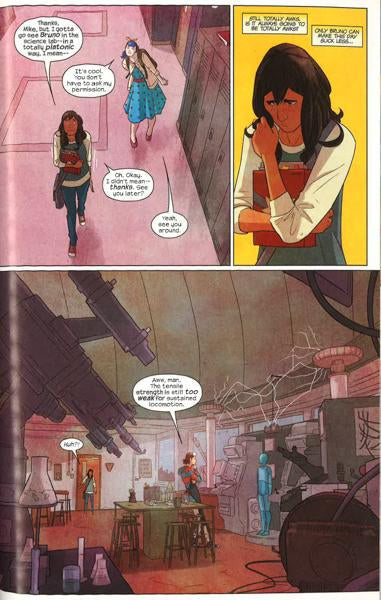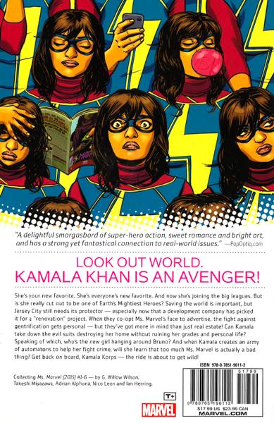 She's your new favorite. She's everyone's new favorite. And now she's joining the big leagues. Look out world, Kamala Khan is officially an Avenger! But will being one of Earth's Mightiest Heroes be everything she imagined? Or is life as a celebrity harder than she thought? But while saving the world is important, Jersey City still needs its protector too. A development company that co-opted Ms. Marvel's face for its project might well have more in mind for gentrification than just real estate. Can Kamala take down the evil suits destroying her home without ruining her personal life? Speaking of which, who exactly is that with Bruno? Get back on board and cling on, Kamala Korps, the ride is about to get wilder than ever!