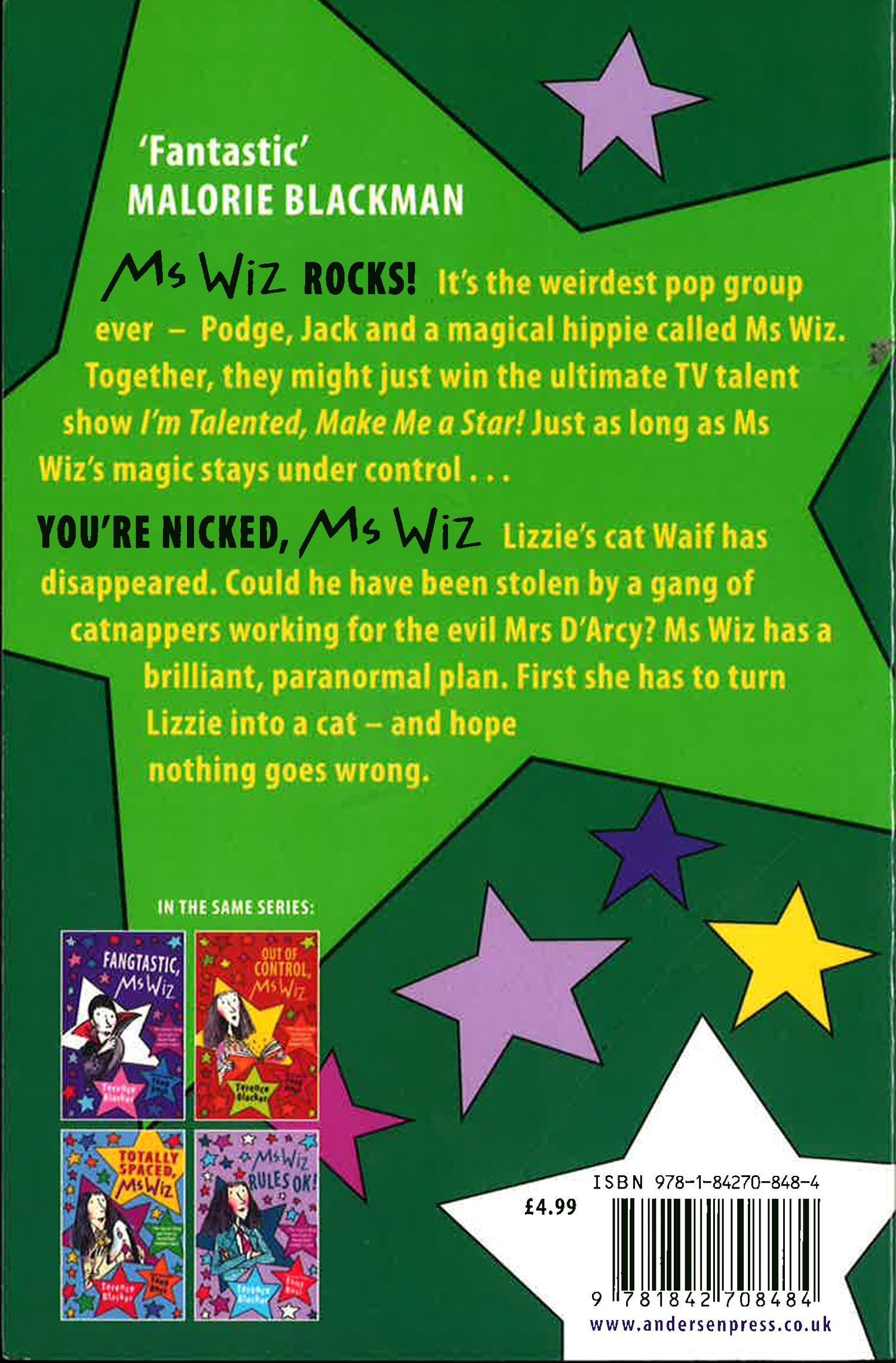 Ms Wiz is Class Five's favourite teacher, who also happens to be a paranormal operative! This title is bind-up of two stories. Ms Wiz Rocks: Podge is learning an instrument but he's terrible. Then he meets a street singer playing the ukelele: it's Ms Wiz of course! And in joining her band, he finds himself in a TV talent competition! You're Nicked, Ms Wiz: Lizzie's cat is missing, stolen by fur-nappers, and Ms Wiz turns her into a cat to get it back.