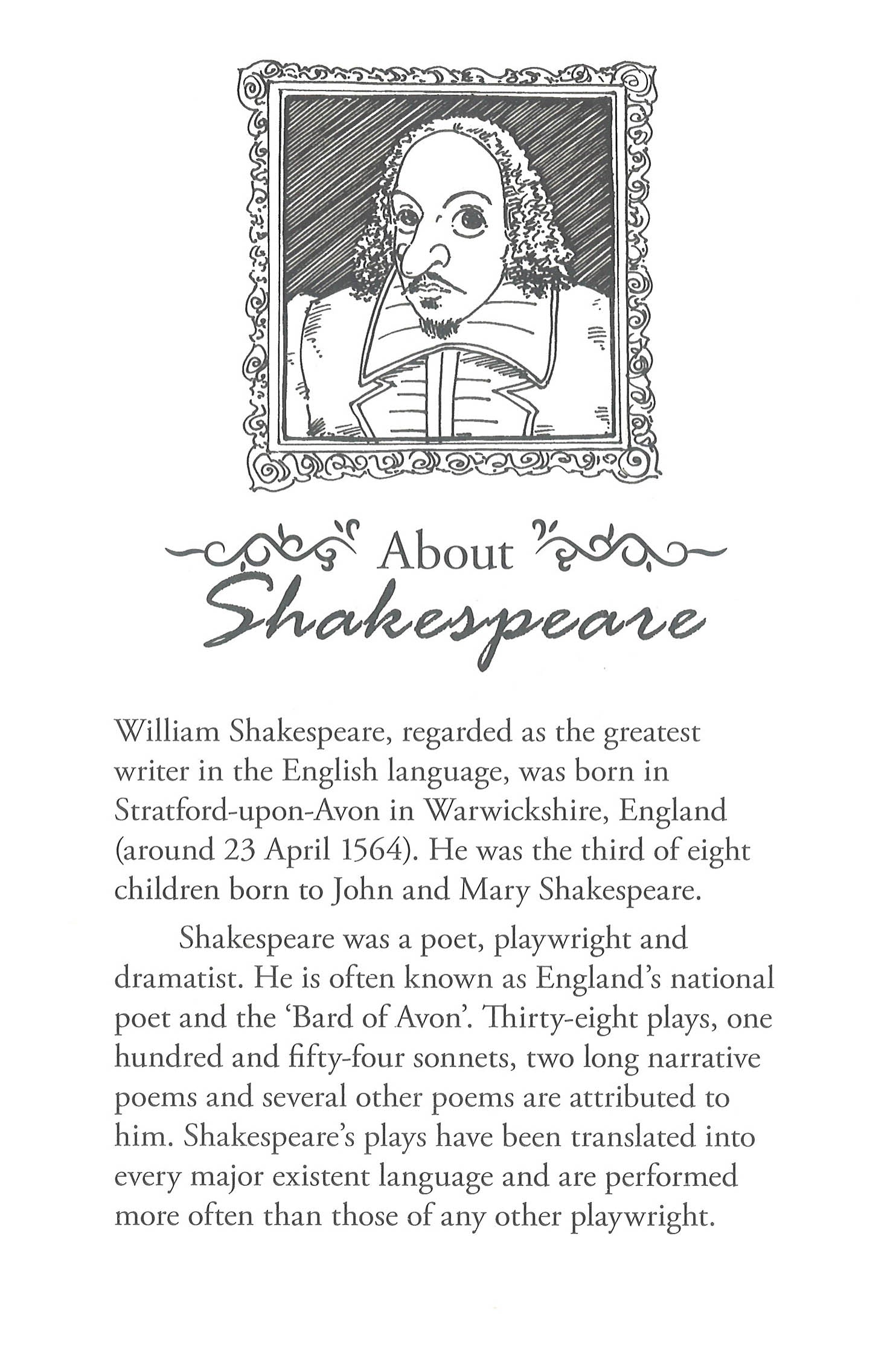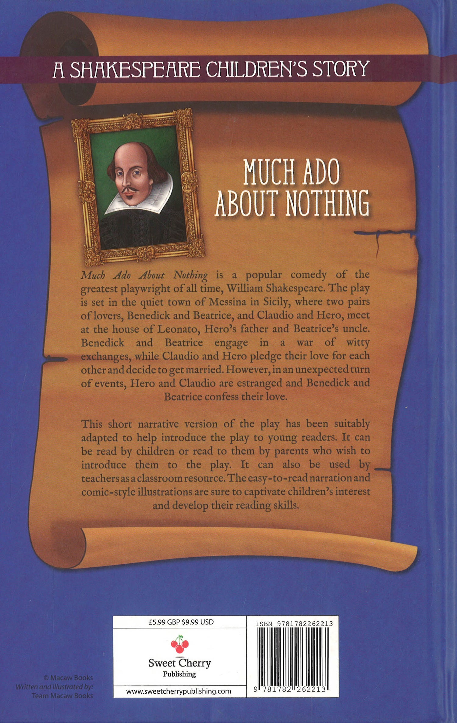 A story of love, trust and lies is interwoven in Shakespeare’s popular comedy, Much Ado about Nothing. The play is set in the quiet town of Messina in Sicily, where two pairs of lovers, Benedick and Beatrice, and Claudio and Hero, meet at the house of Leonato, Hero’s father and Beatrice’s uncle. Benedick and Beatrice engage in a war of witty exchanges, while Claudio and Hero pledge their love for each other and decide to get married. However, in an unexpected turn of events, Hero and Claudio are estranged and Benedick and Beatrice confess their love. Also available as part of a 20 book set, including Romeo and Juliet, Hamlet, The Tragedy of Macbeth, A Midsummer Night’s Dream, A Winter’s Tale, The Taming of the Shrew, The Tempest, Twelfth Night, Timon of Athens, The Two Gentlemen of Verona, The Merchant of Venice, Othello, Much Ado About Nothing, King Lear, Julius Caesar, Cymbeline, The Comedy of Errors, As You Like It, Anthony and Cleopatra and All’s Well That Ends Well. About Sweet Cherry Easy Classics:Sweet Cherry Easy Classics adapts classic literature into stories for children, introducing these timeless tales to a new generation.