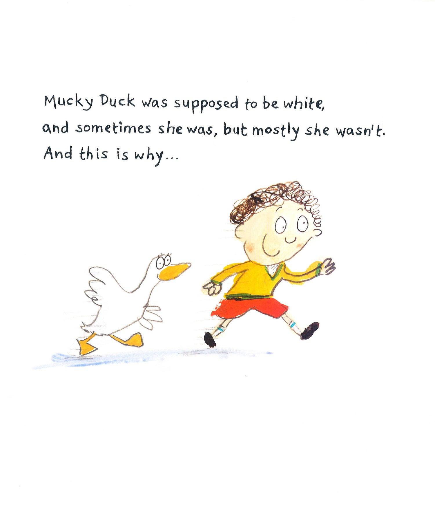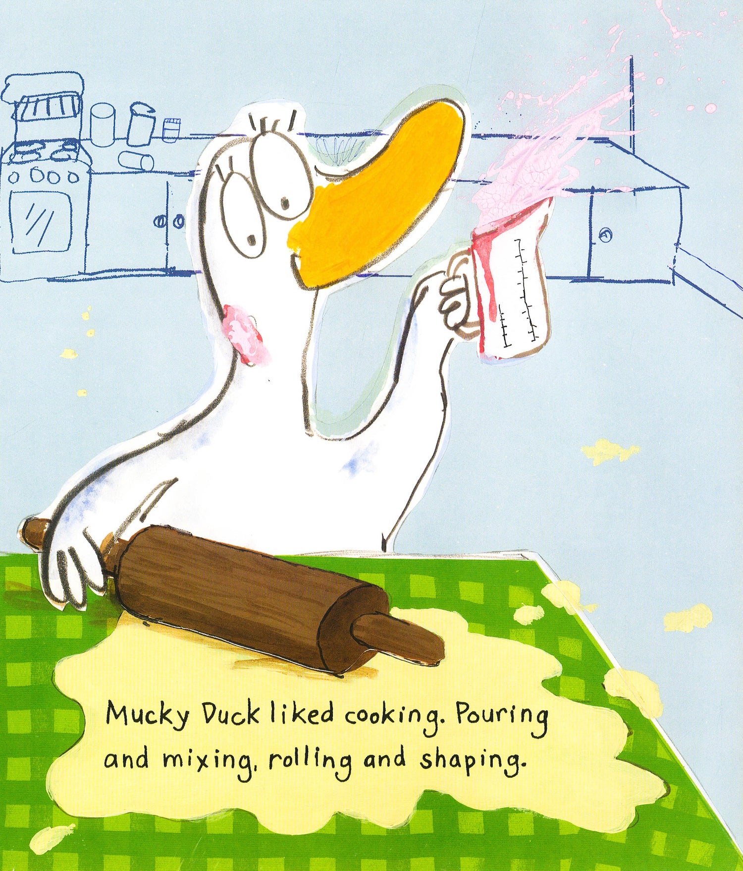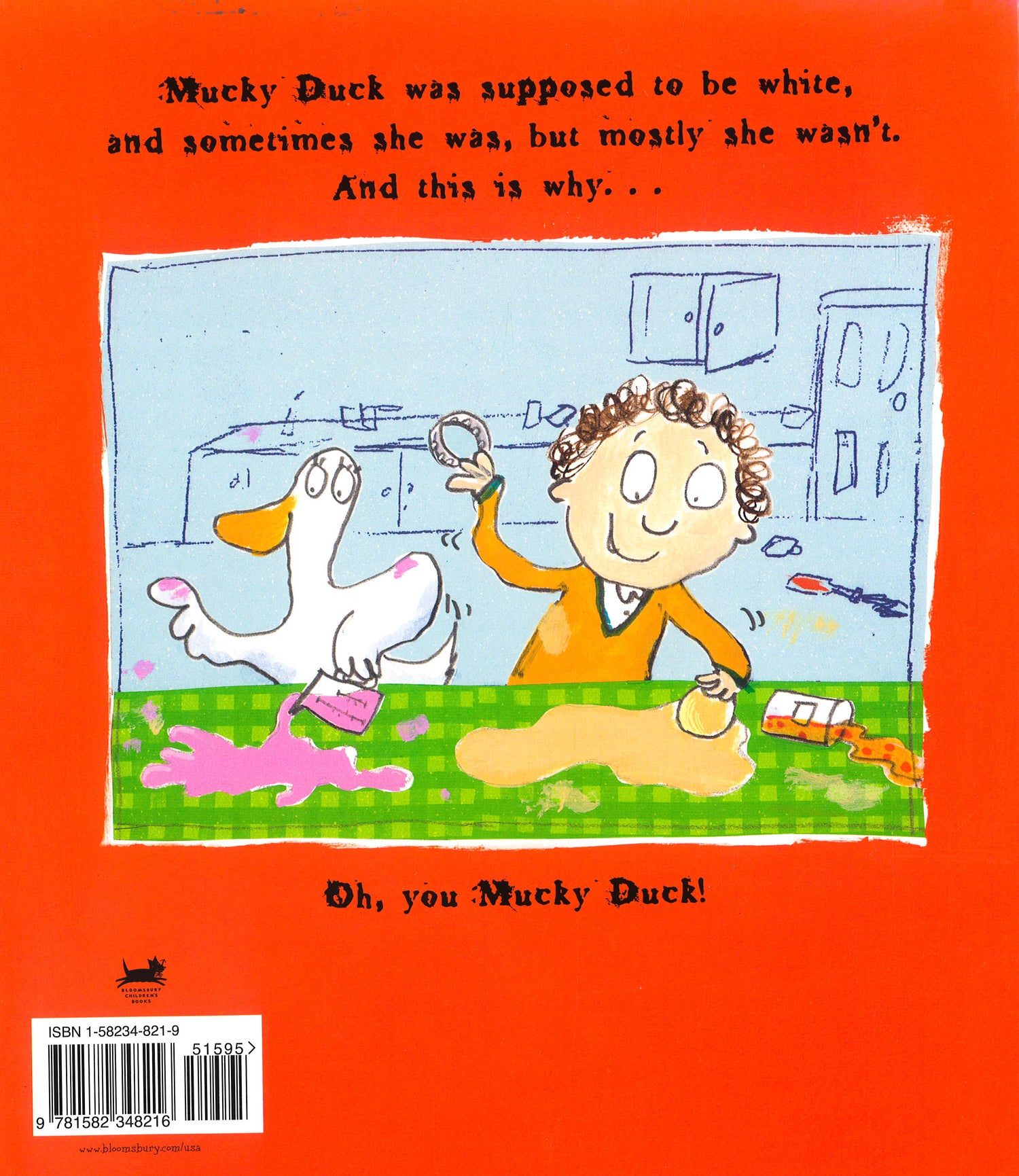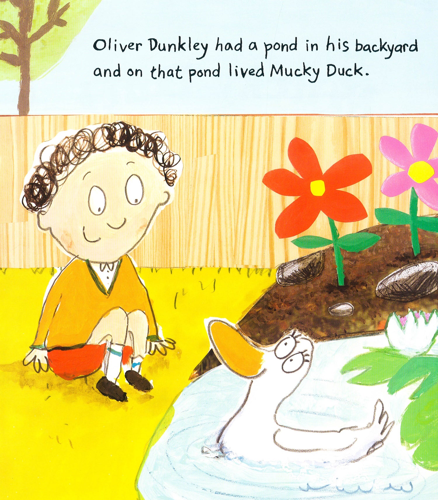 Oliver and Mucky Duck, a duck who lives in the garden pond, have trouble staying clean because they love to do things like playing football and painting.