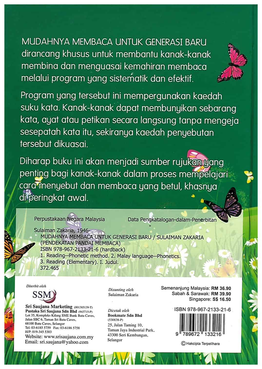 MUDAHNYA MEMBACA UNTUK GENERASI BARU dirancang khusus untuk membantu kanak-kanak membina dan menguasai kemahiran membaca melalui program yang sistematik dan efektif. Program yang tersebut ini mempergunakan kaedah suku kata. Kanak-kanak dapat membunyikan sebarang kata, ayat atau petikan secara langsung tanpa mengeja sesepatah kata itu, sekiranya kaedah penyebutan tersebut dikuasai.