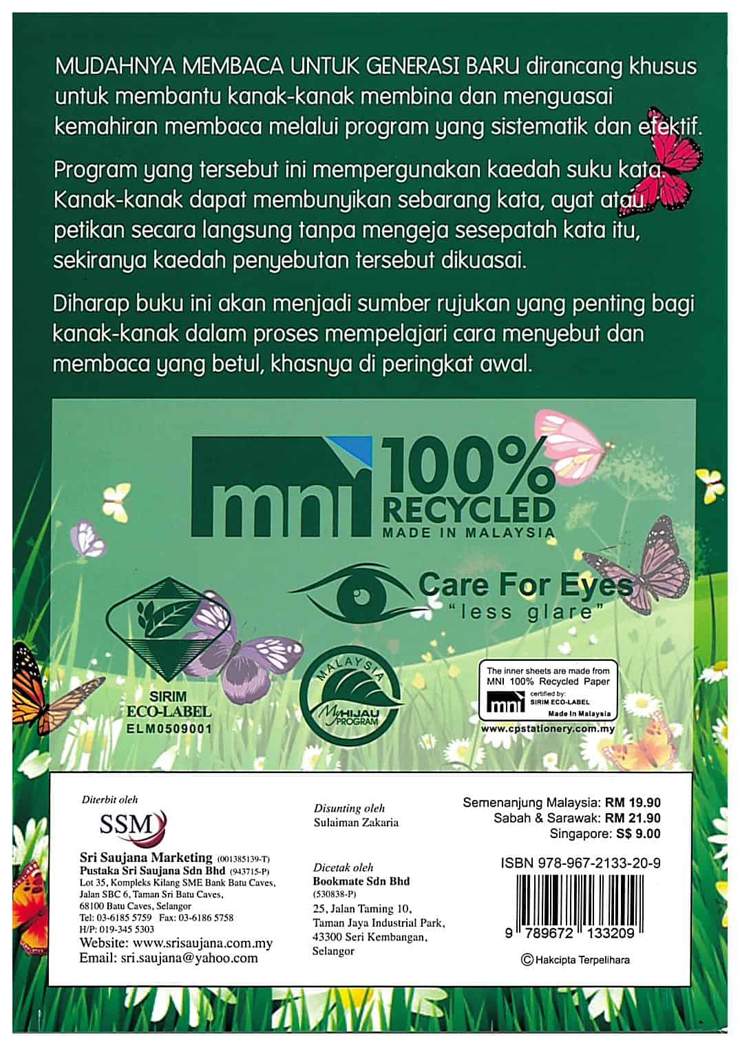 MUDAHNYA MEMBACA UNTUK GENERASI BARU dirancang khusus untuk membantu kanak-kanak membina dan menguasai kemahiran membaca melalui program yang sistematik dan efektif. Program yang tersebut ini mempergunakan kaedah suku kata. Kanak-kanak dapat membunyikan sebarang kata, ayat atau petikan secara langsung tanpa mengeja sesepatah kata itu, sekiranya kaedah penyebutan tersebut dikuasai. Diharap buku ini akan menjadi sumber rujukan yang penting bagi kanak-kanak dalam proses mempelajari cara menyebut dan membaca yang betul, khasnya di peringkat awal.