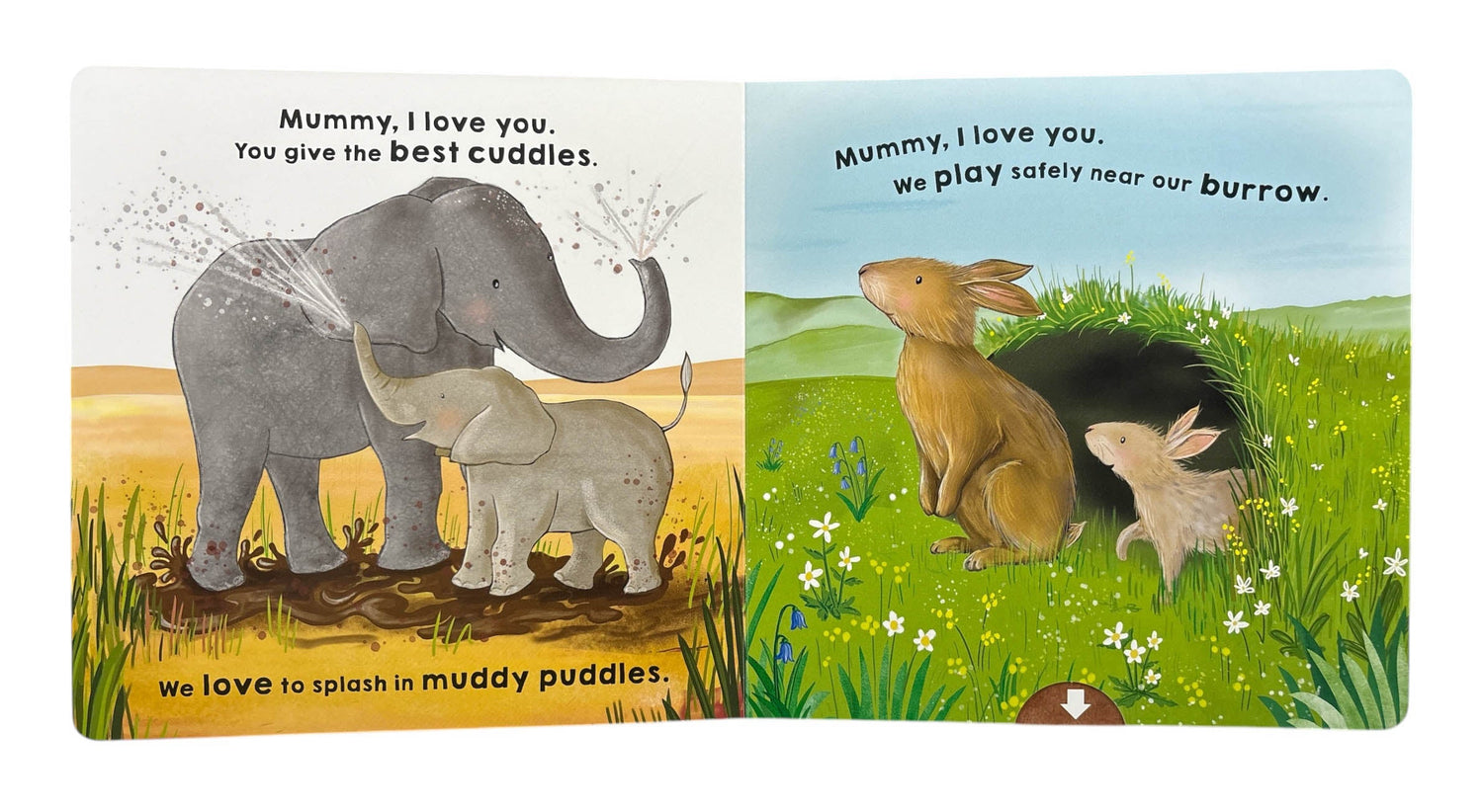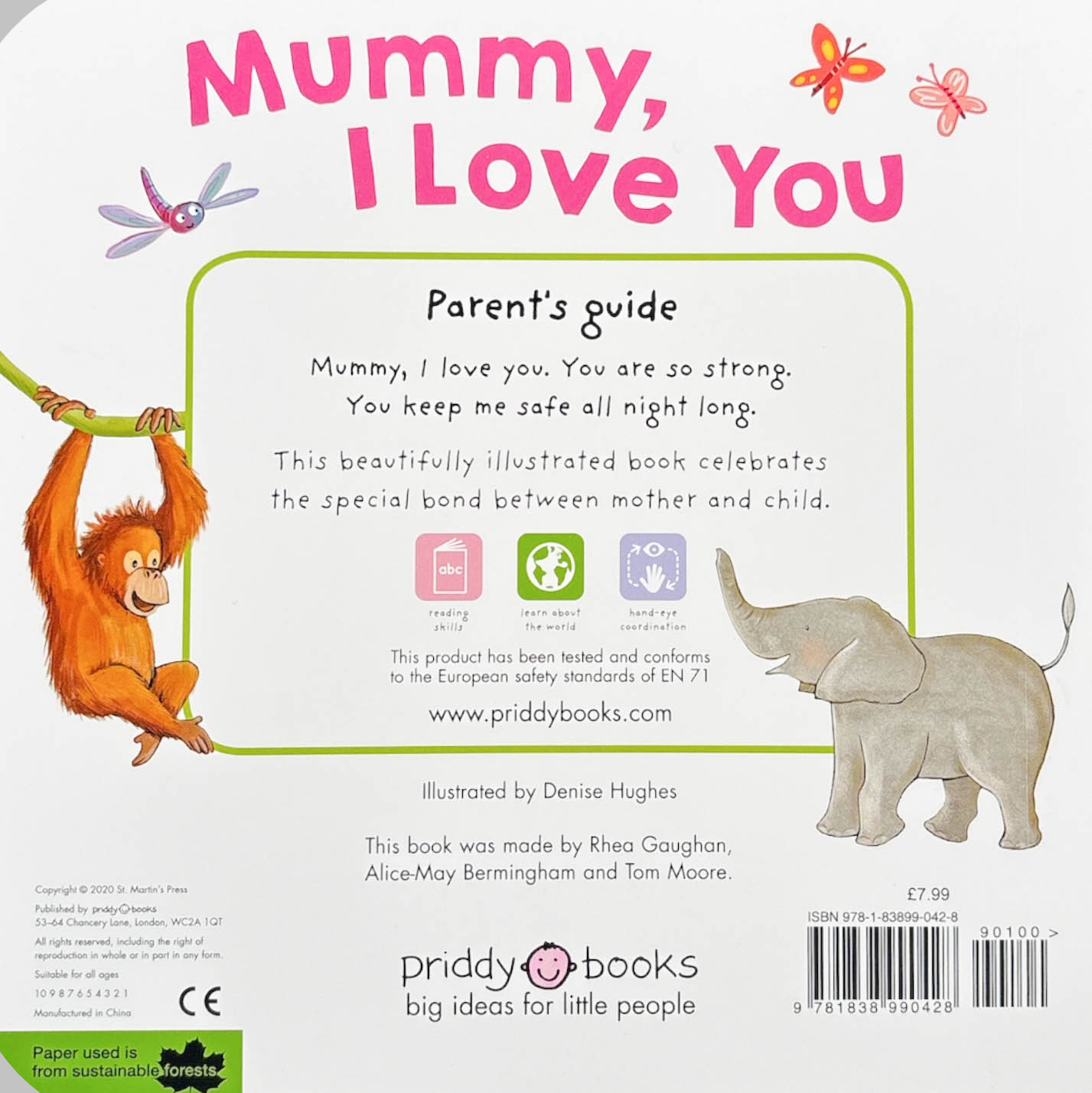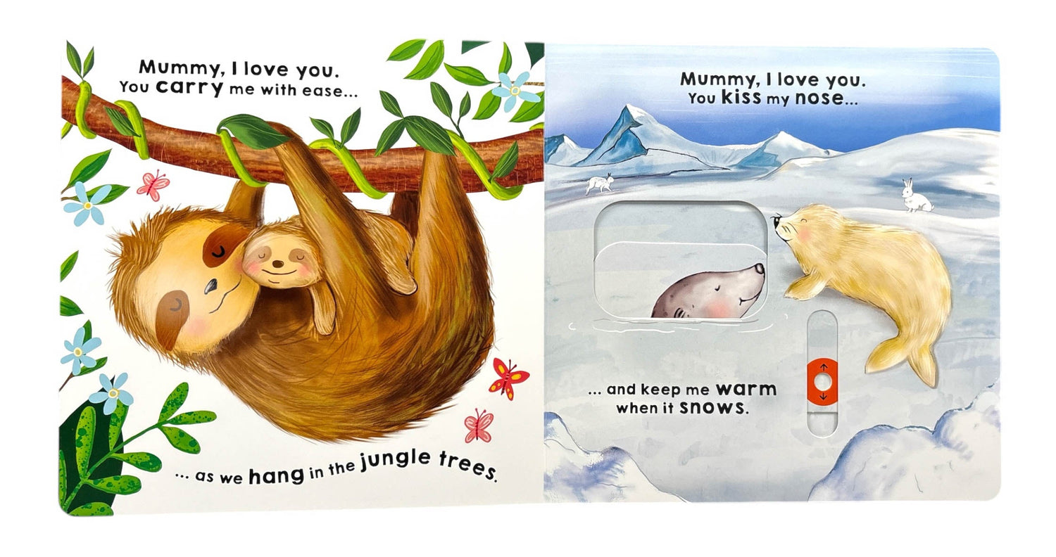 Mummy, I love you is a heartwarming novelty board book with sweet illustrations all about the bond between mother and baby. The gentle rhyming text highlights one of the reasons each animal baby loves its mummy. There is a novelty to explore on each page including wheels, pull tabs and sliders which bring the illustrations to life. This Priddy Books novelty book offers an interactive and visual shared-reading experience for parent and baby to enjoy.