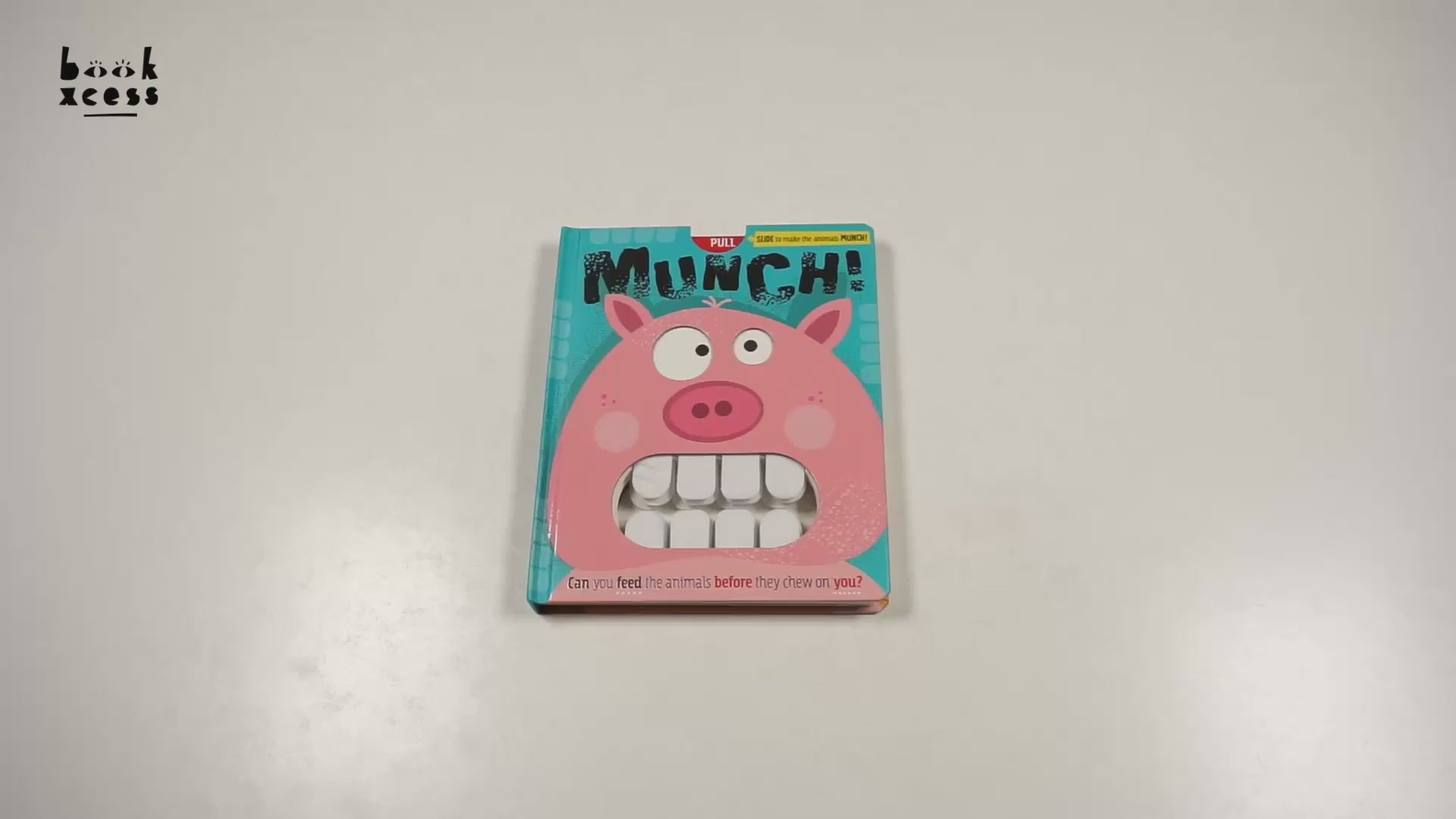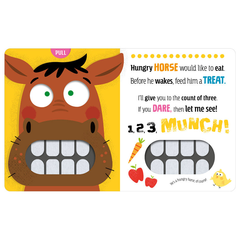 Munch! is an interactive, farm-themed book for young children. Each page has an open mouth with soft felt teeth, and easy-to-pull sliders to close the animal mouths. Little ones can poke their hands through the open mouths to mimic ‘feeding’ the animals, then have fun trying to get their hands out before the mouths close with a MUNCH! The fun, rhyming text introduces animal noises and simple numbers. INTERACTIVE FARM BOOK WITH SLIDERS AND FELT TEETH
